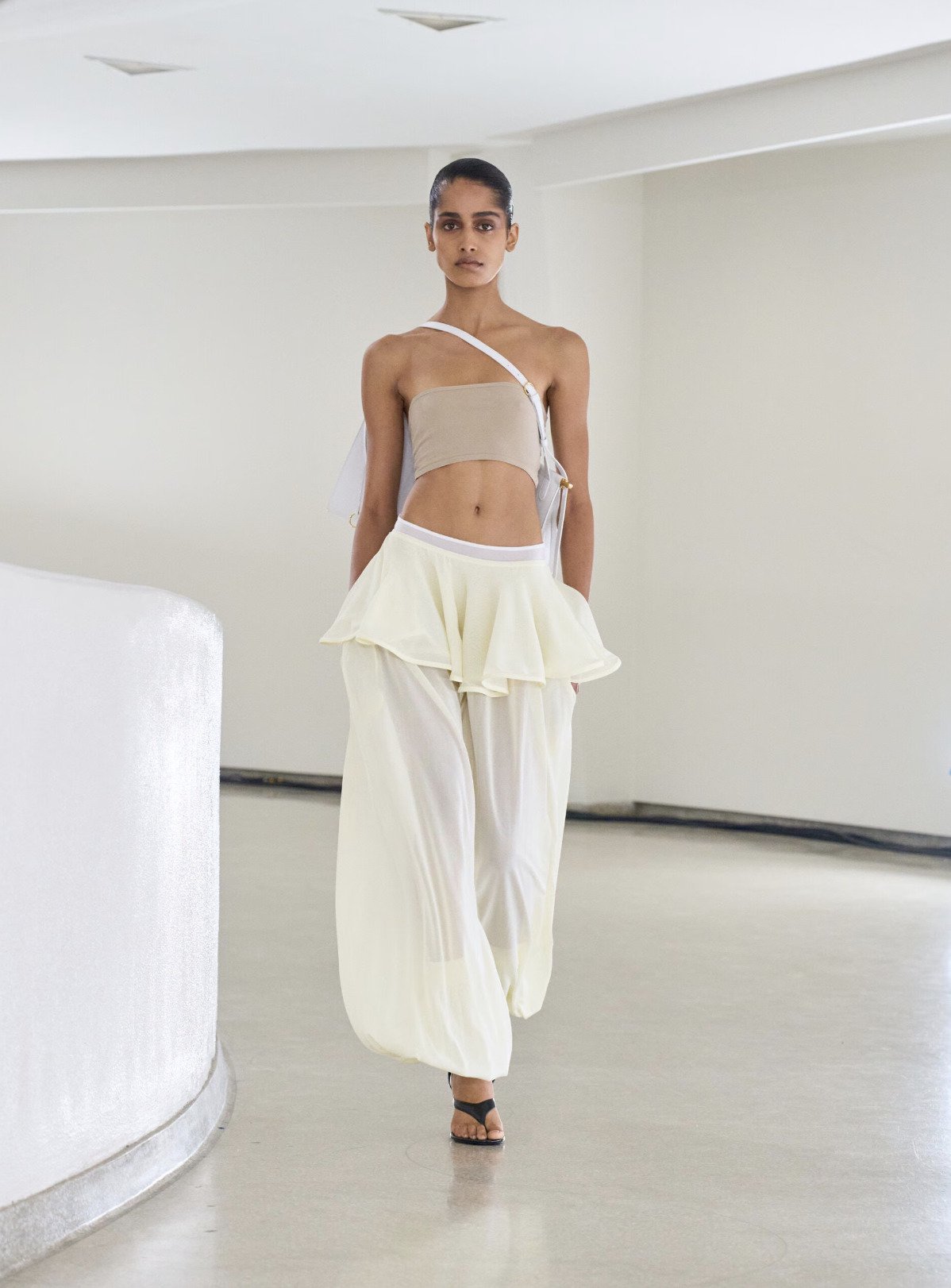 Chloé Xuân Hè 2025 chọn cách tái sinh balloon pants bằng chất liệu voan thêu hoa, phồng nhẹ và cổ điển như một lời thì thầm nữ tính. Alaïa, ngược lại, lại đẩy khái niệm phồng tới cực đại: quần balloon màu beige được dựng trên nền corset bodysuit ôm sát, tạo một nhịp đối lập kỳ lạ giữa thắt chặt và thả lỏng. Như một đám mây bị neo ngay mắt cá chân, chiếc quần mang đến cảm giác vừa mong manh, vừa quyền lực – nơi “khối lượng” trở thành công cụ tạo nên khoảng không gian riêng cho người mặc.