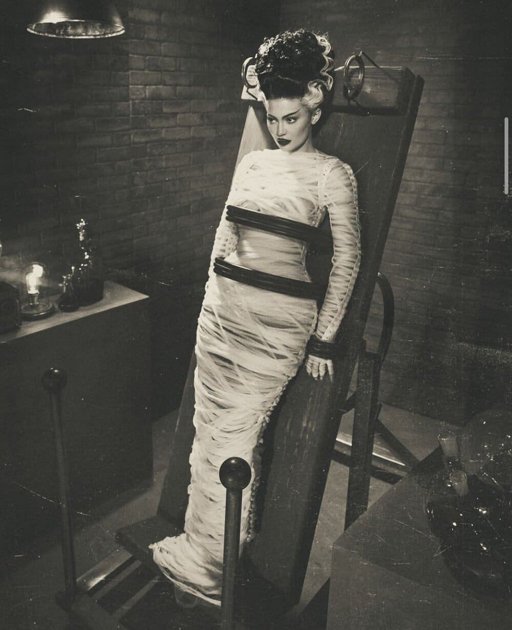Bộ trang phục bao gồm một chiếc váy trắng dài kết hợp cùng áo choàng băng gạc, gợi lên hình ảnh cô dâu được tái sinh từ phòng thí nghiệm. Phần váy chỉ cần đảm bảo dài và trắng, những chi tiết khác của váy như phom dáng, họa tiết cách điệu…có thể được thay đổi linh hoạt. Để hoá thân thành nhân vật này, Kylie Jenner đã diện bộ váy Jean Paul Gaultier ôm sát với kết cấu như hàng trăm lớp vải trắng quấn quanh cơ thể. Tuy nhiên, một chiếc váy suông trắng có sẵn trong tủ đồ, kết hợp với dải ruy băng cùng màu được quấn quanh tay hoặc chân là đã đủ cho màn biến hoá này.