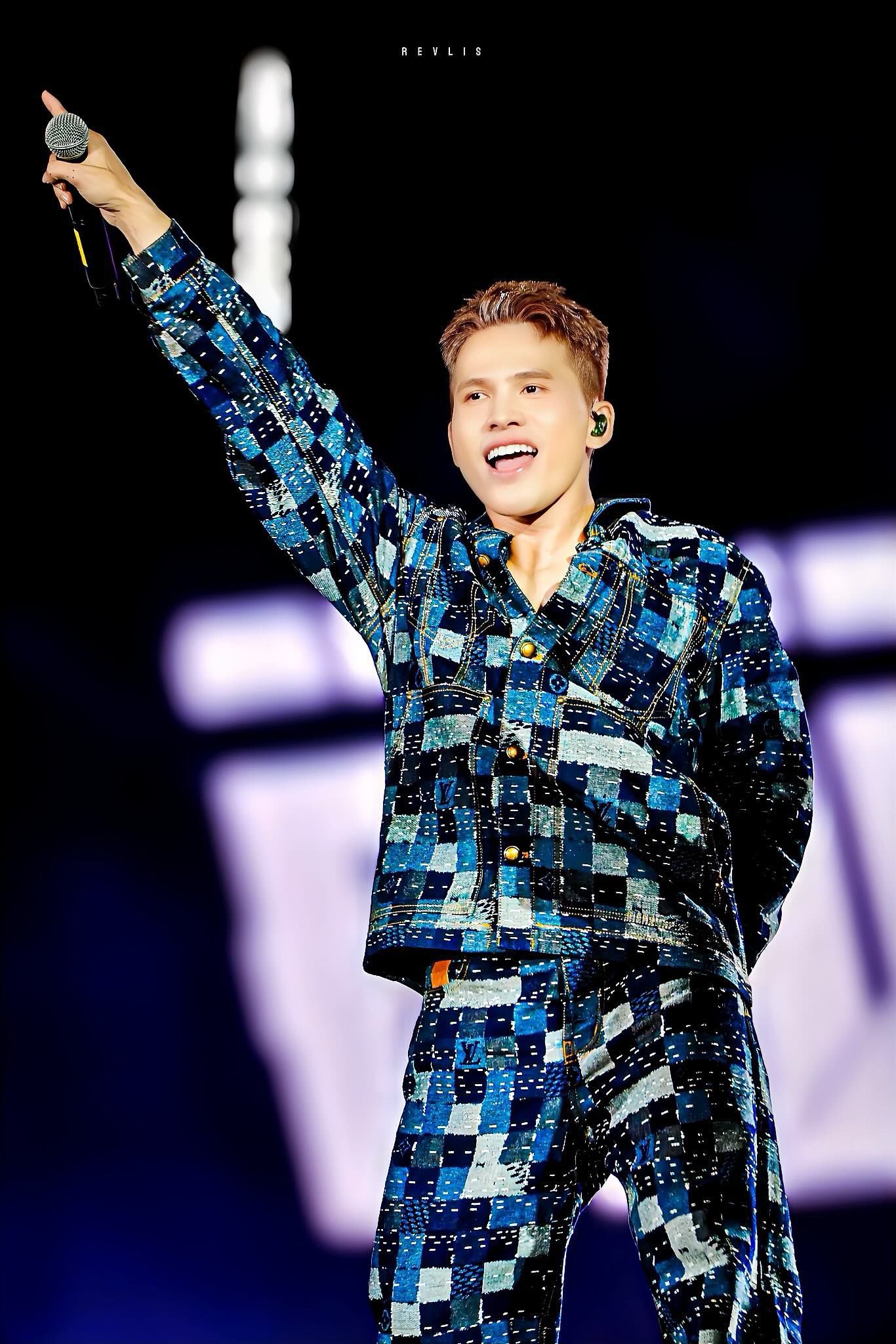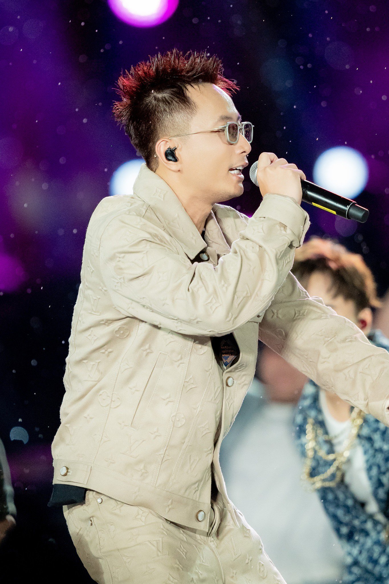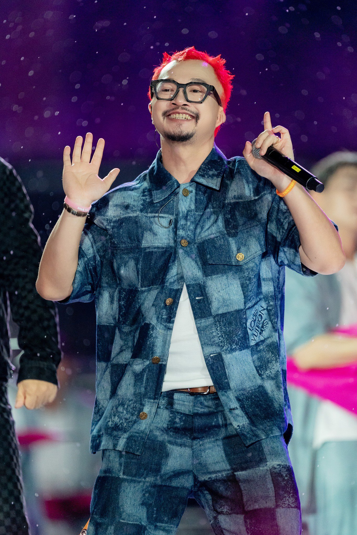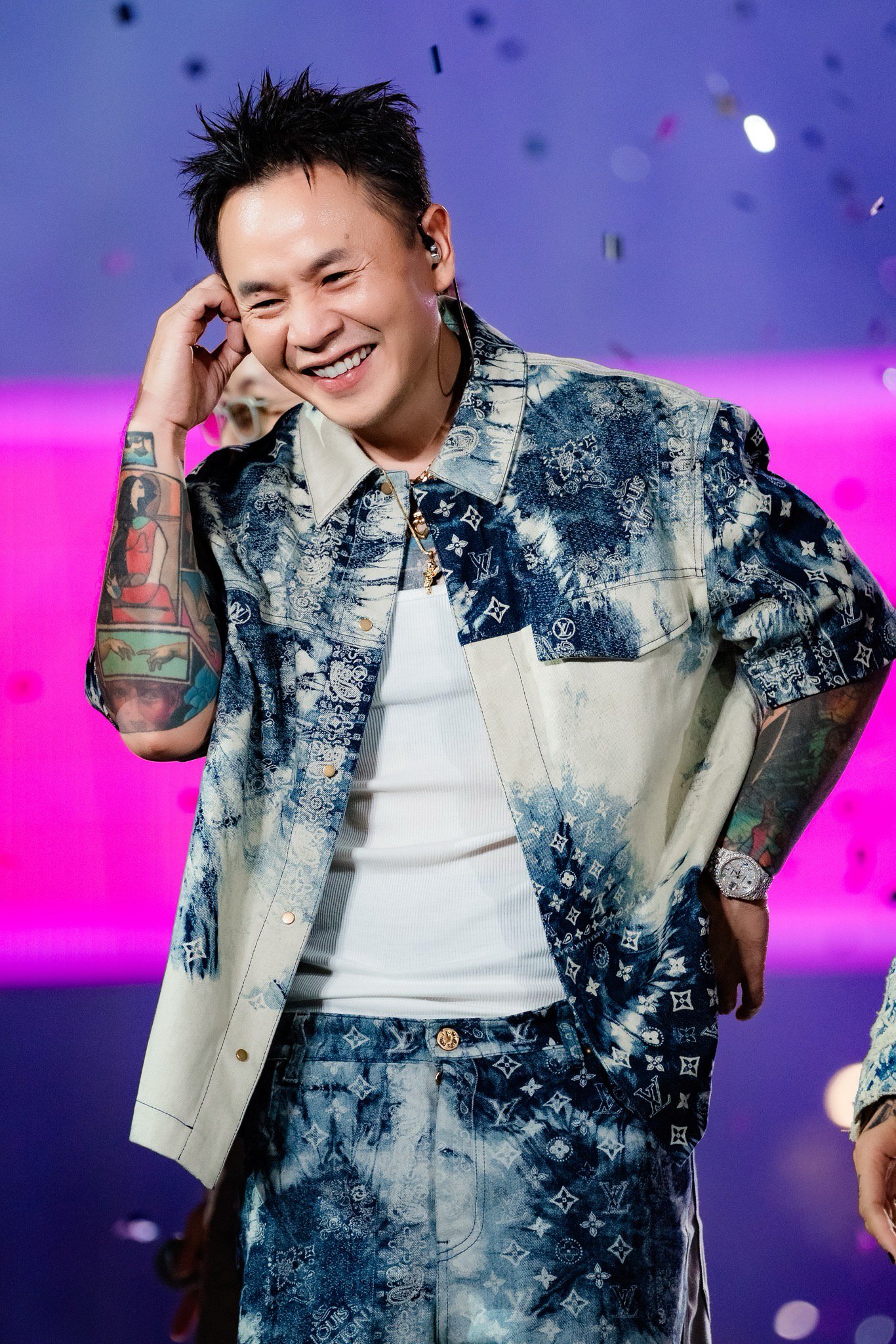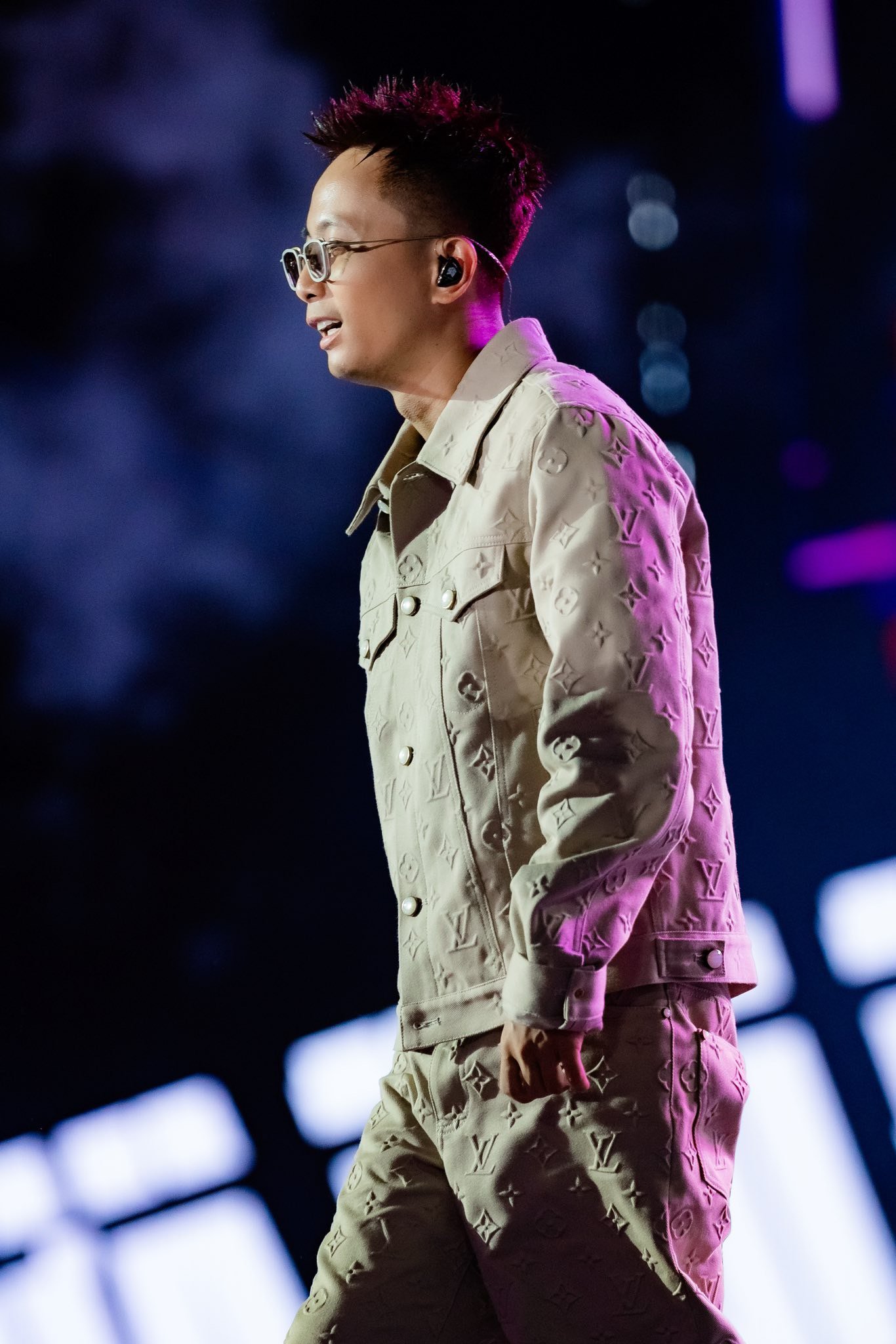 Trong đội hình nhiều patchwork và màu sắc, Rhymastic chọn lối đi khác: bộ denim beige nguyên khối với monogram Louis Vuitton dập nổi trên toàn bộ bề mặt. Đây là kiểu tối giản không hề nhạt nhòa, bởi sức mạnh đến từ kỹ thuật chế tác vải – khi ánh đèn chiếu vào, hoa văn monogram nổi lên như lớp điêu khắc, tạo độ sâu thị giác tinh tế.