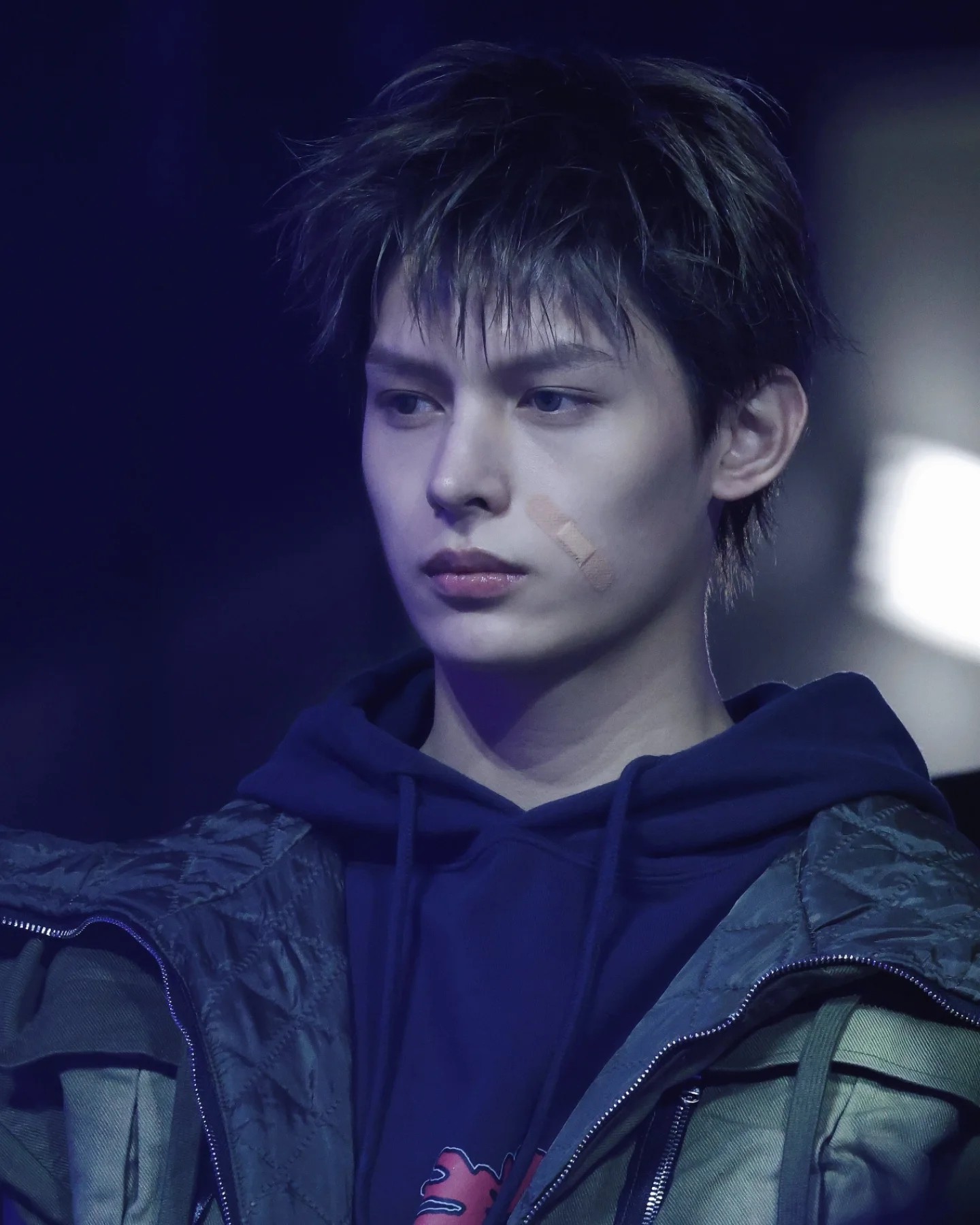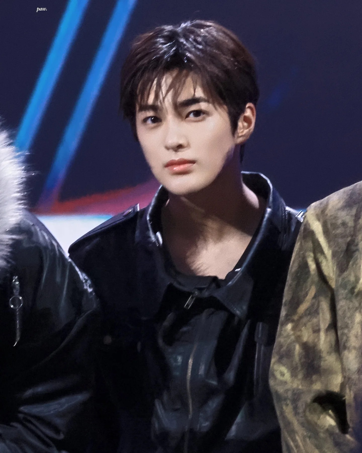 Juhoon gây ấn tượng bằng áo khoác da loang vàng - đen đứng phom, tôn rõ phần vai và lưng, kết hợp cùng quần jeans rộng tối màu.