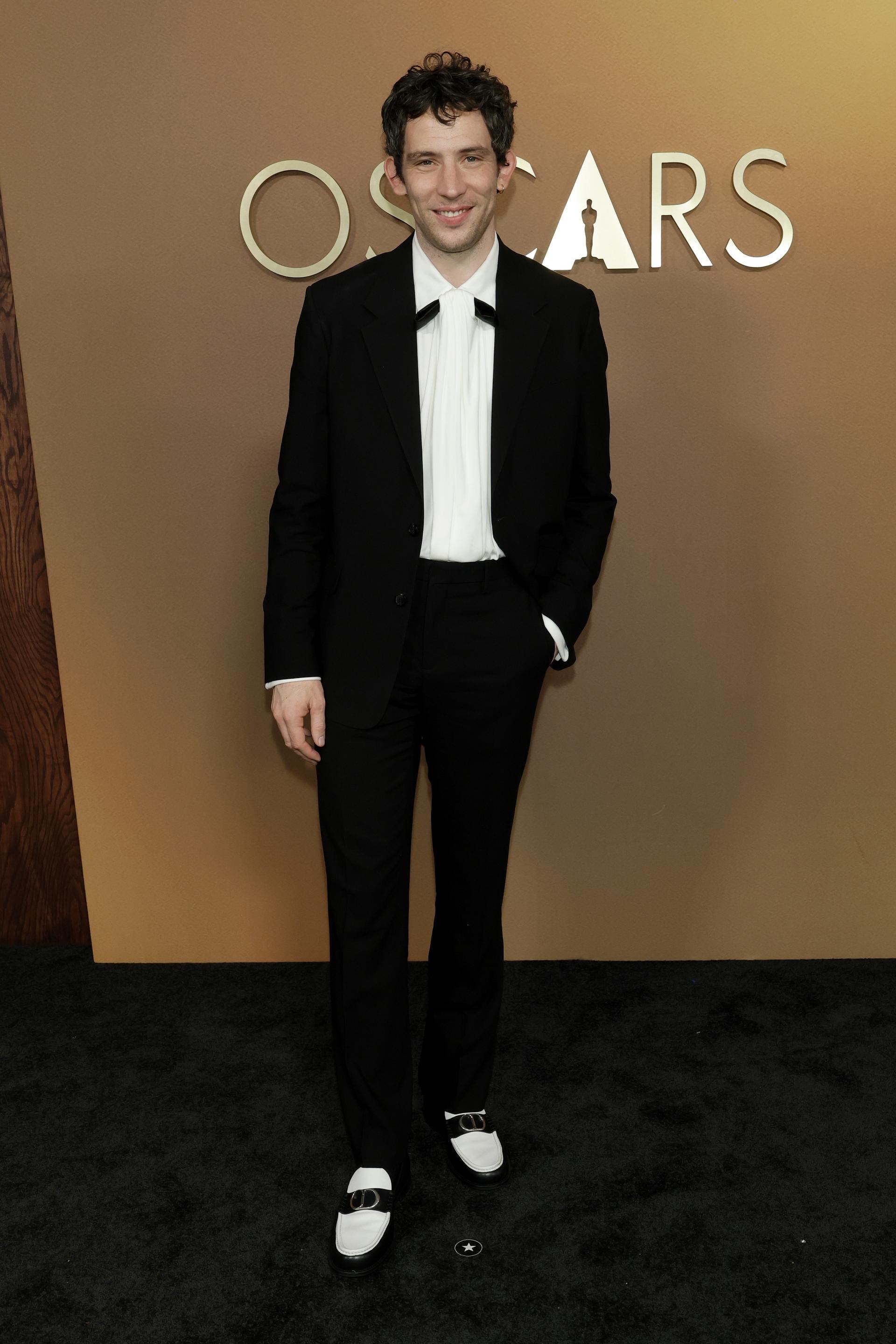 Josh O'Connor diện bộ suit Dior đen bằng len, ve áo chữ V bên ngoài chiếc áo sơ mi lụa trắng. Điểm nhấn của bộ trang phục là chi tiết thắt nơ đi kèm với áo, tone-sur-tone trắng đen với đôi loafer da.