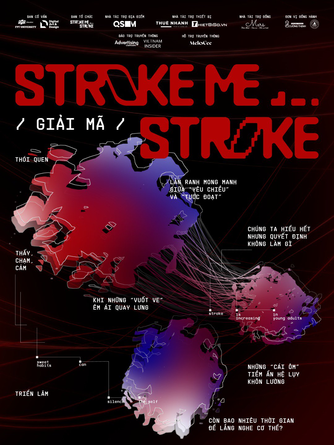 Stroke Me… Stroke – triển lãm nghệ thuật tương tác đặt ra câu hỏi về lằn ranh mong manh giữa yêu chiều bản thân và tự tước đoạt. Thông qua cách dàn dựng không gian và hệ thống tác phẩm thị giác – cảm giác, triển lãm dẫn dắt người xem nhìn lại những thói quen tưởng như vô hại, nhưng âm thầm bào mòn sức khỏe và thời gian sống. Đây không chỉ là câu chuyện cảnh báo bằng con số hay lời khuyên khô khan, mà là một hành trình trải nghiệm, nơi từng dấu hiệu và nguy cơ tiềm ẩn được “hiện hình” qua nghệ thuật, mời gọi khán giả cảm nhận và suy ngẫm.