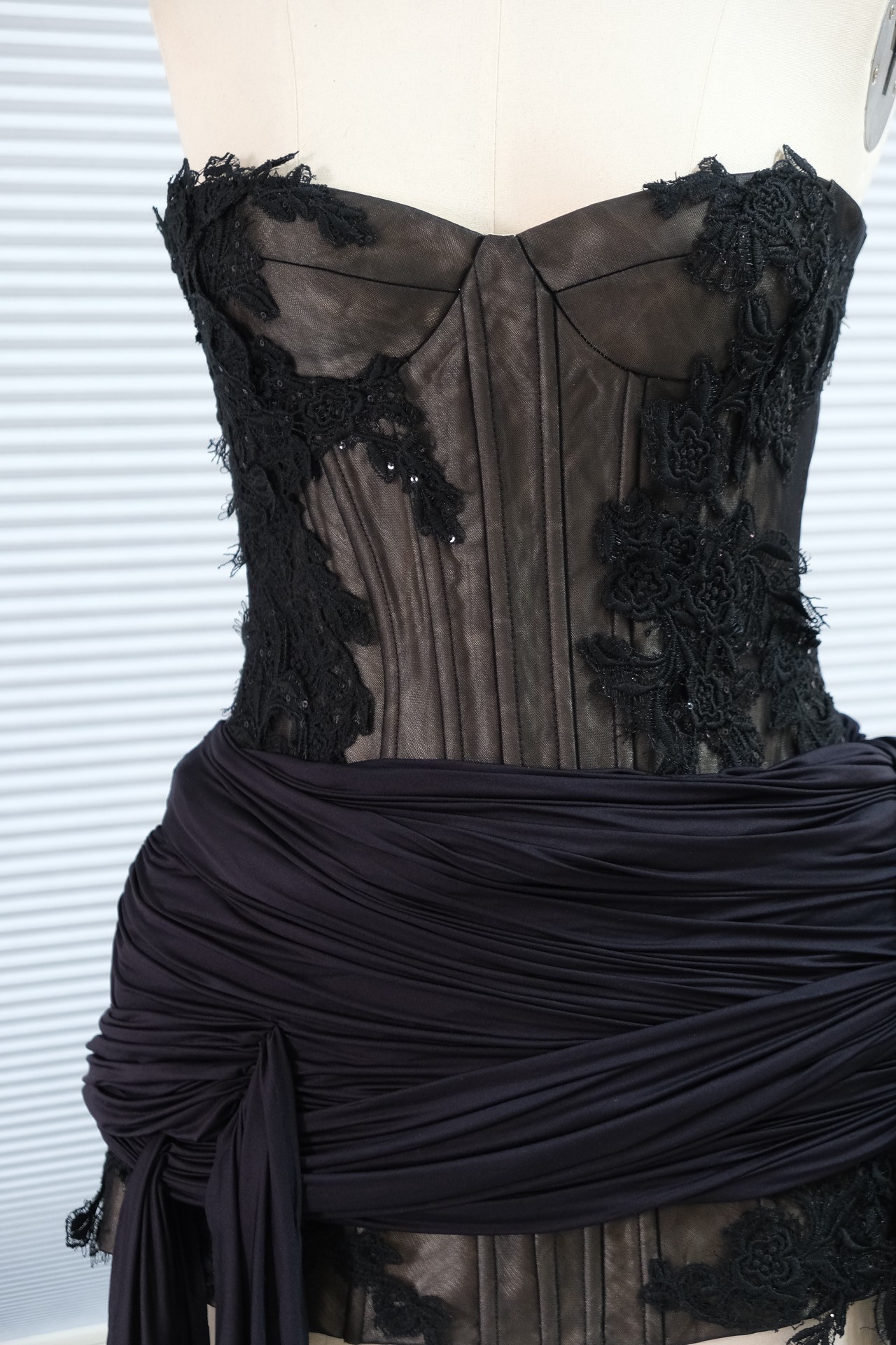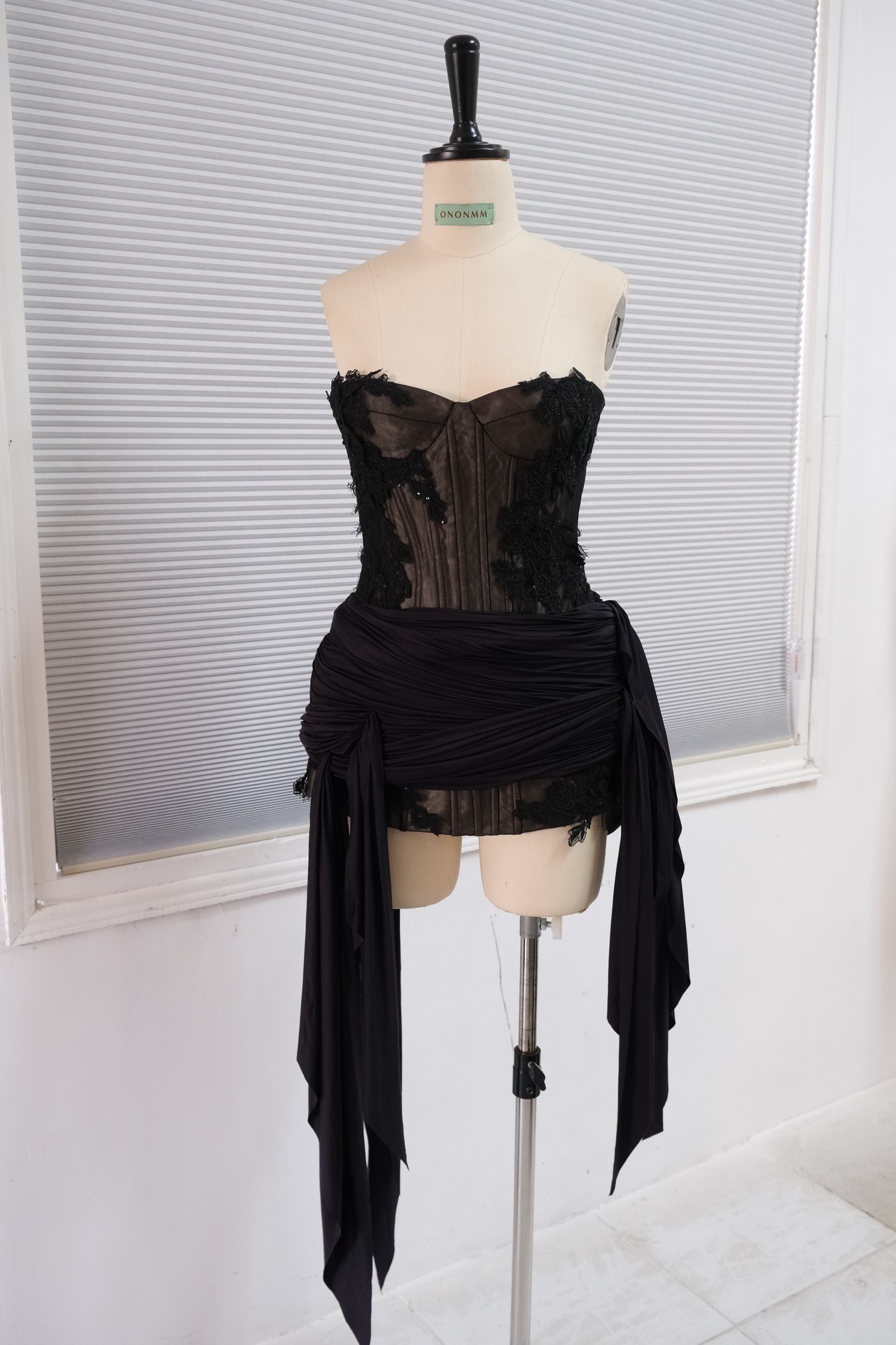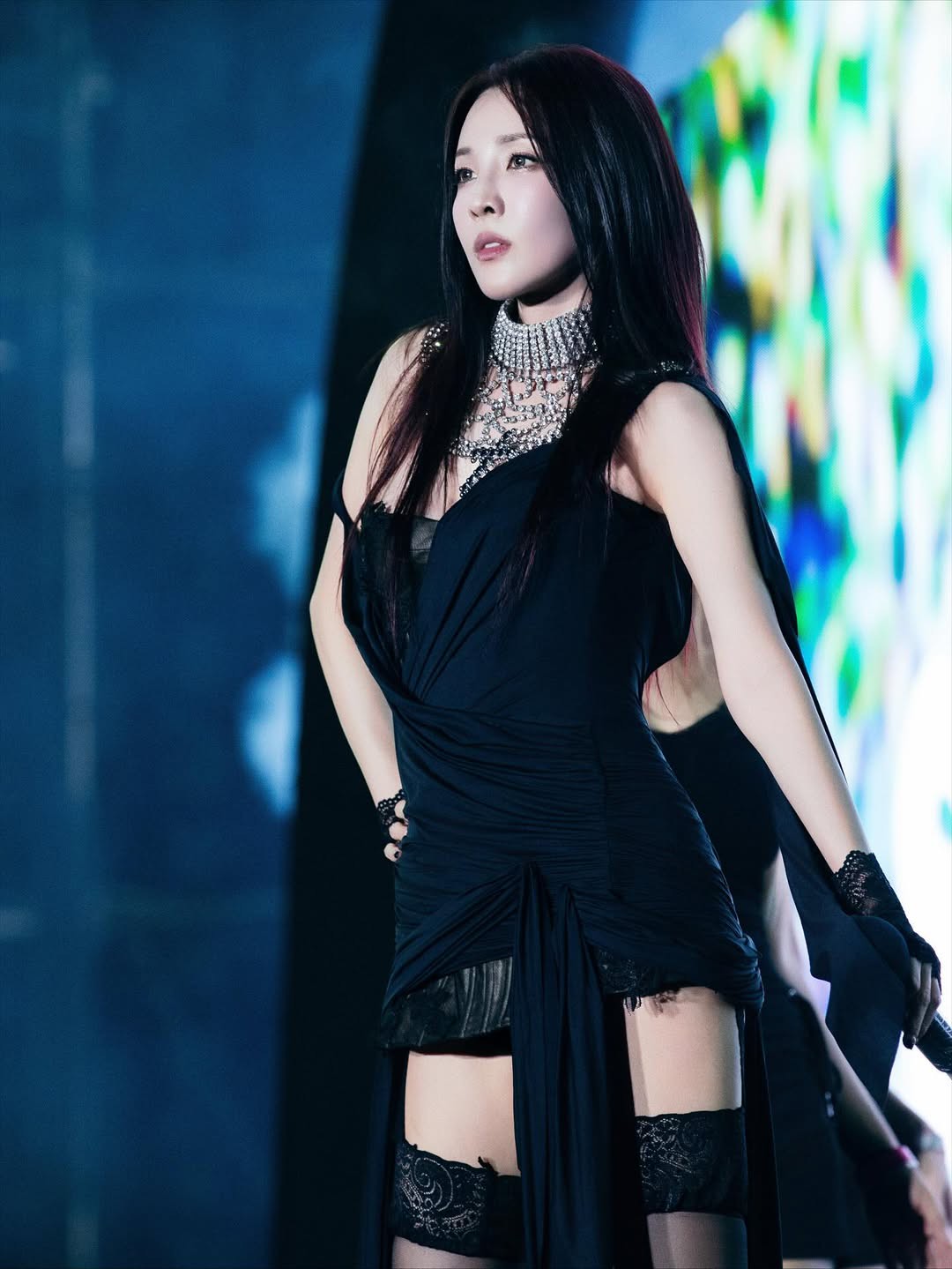 Dara diện chiếc váy corset ngắn màu đen ôm sát, đậm chất gothic. Chiếc váy được thiết kế riêng với phần trong là vải kaki được phủ vải lưới, đính ren lên trên, lớp bên ngoài là phần thun lạnh mềm mịn. Ngoài ra, chất liệu kaki và lưới bắt sáng tốt dưới ánh đèn, tạo hiệu ứng sống động qua từng chuyển động.