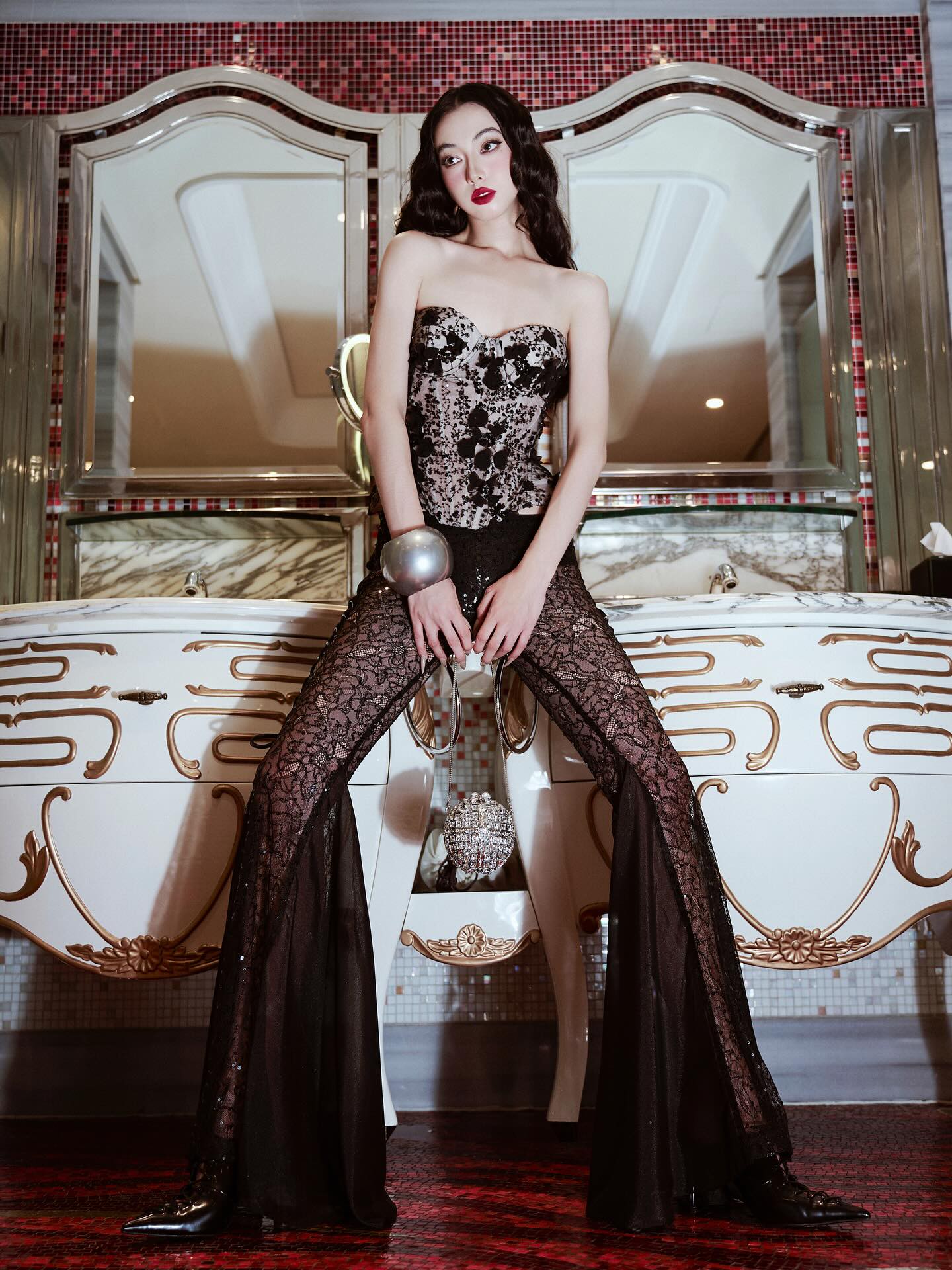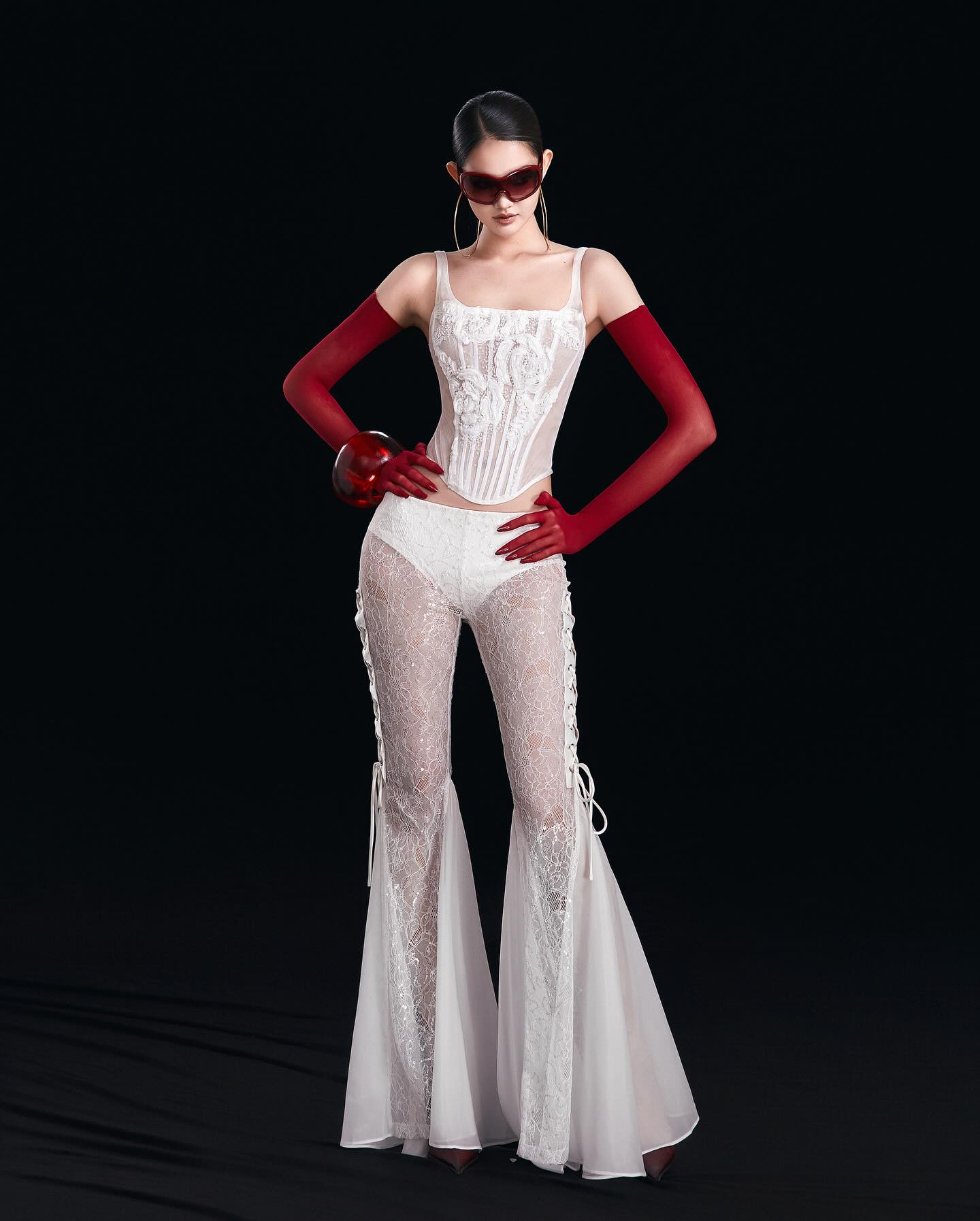 Lấy cảm hứng từ vẻ gợi cảm kiểu sixties revival – thời kỳ váy ngắn, nơ to và những bộ tóc bob trở thành biểu tượng của nữ quyền đang trỗi dậy. BIBOSS tái hiện lại tinh thần đó bằng ngôn ngữ hiện đại: corset được tái cấu trúc, tay áo cape được dựng phom điêu luyện, ren và lụa được phối với wool kỹ thuật, tạo nên sự cân bằng giữa nét tinh khôi cổ điển và tính nữ tinh tế đương đại.