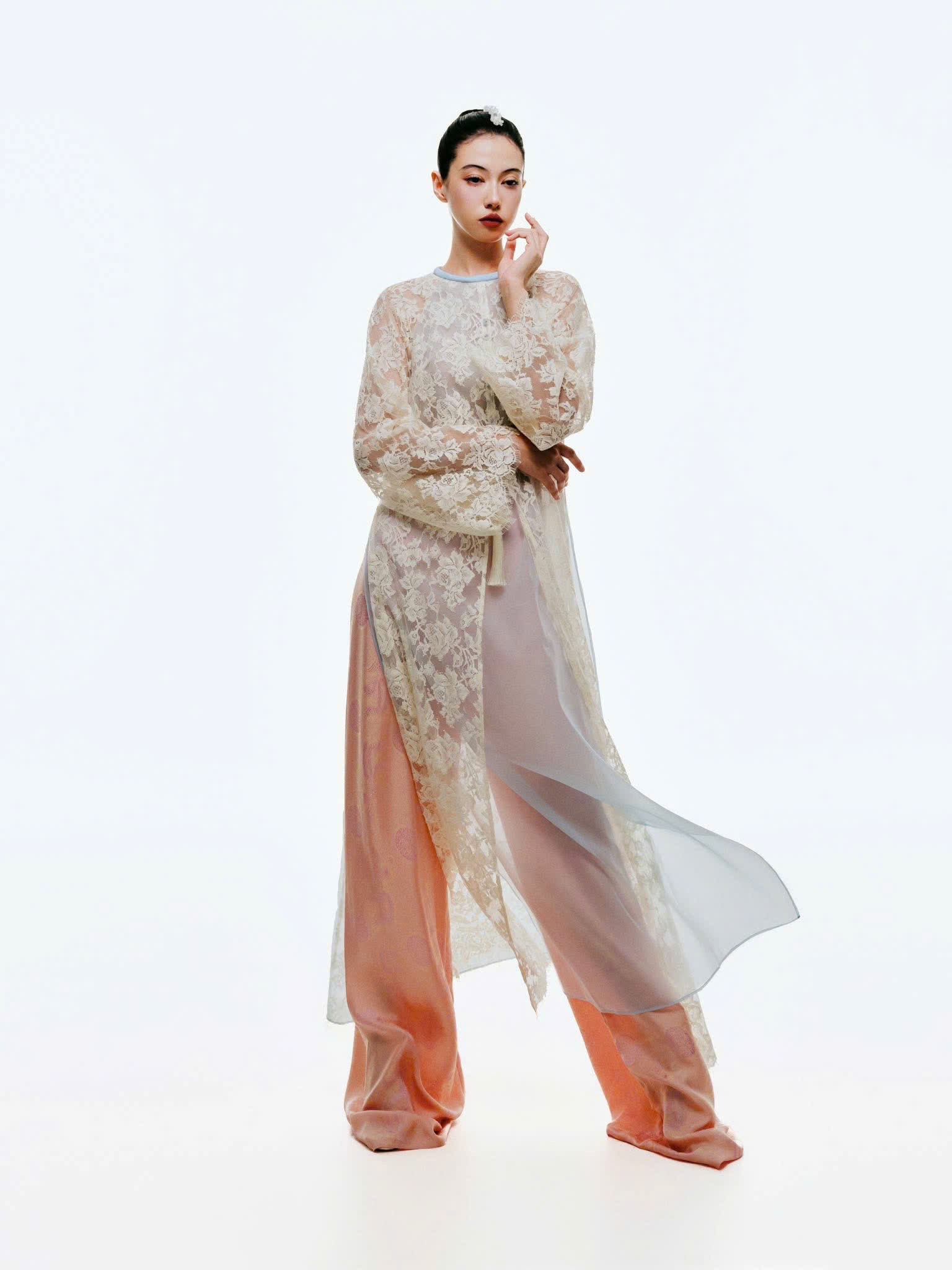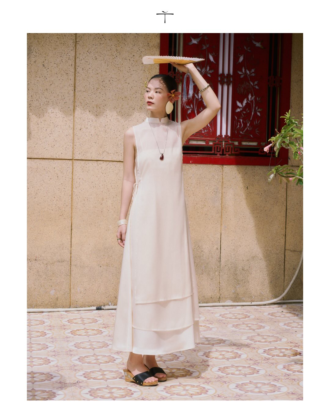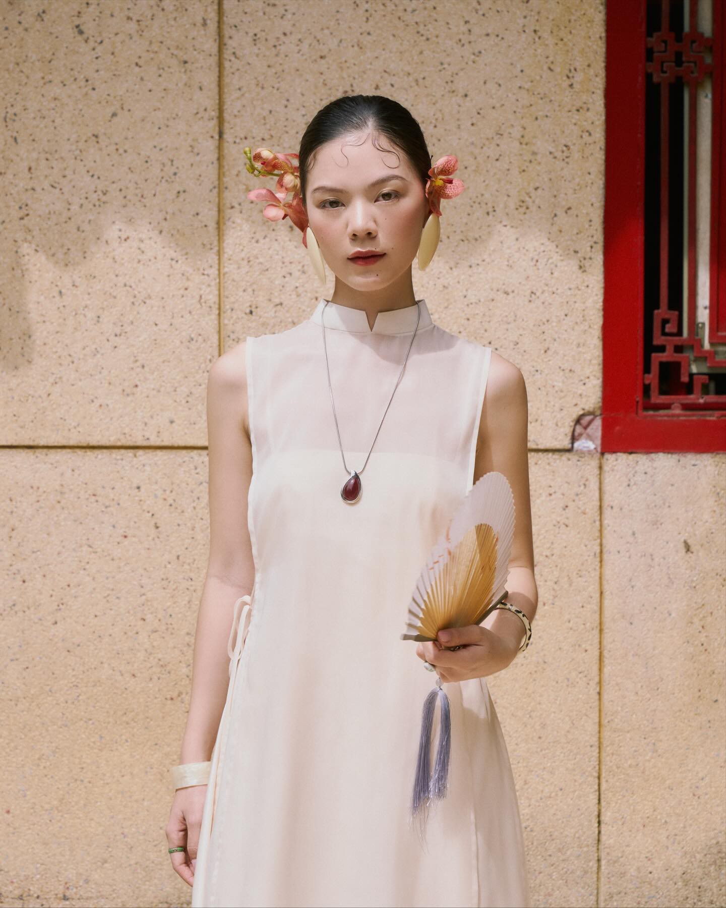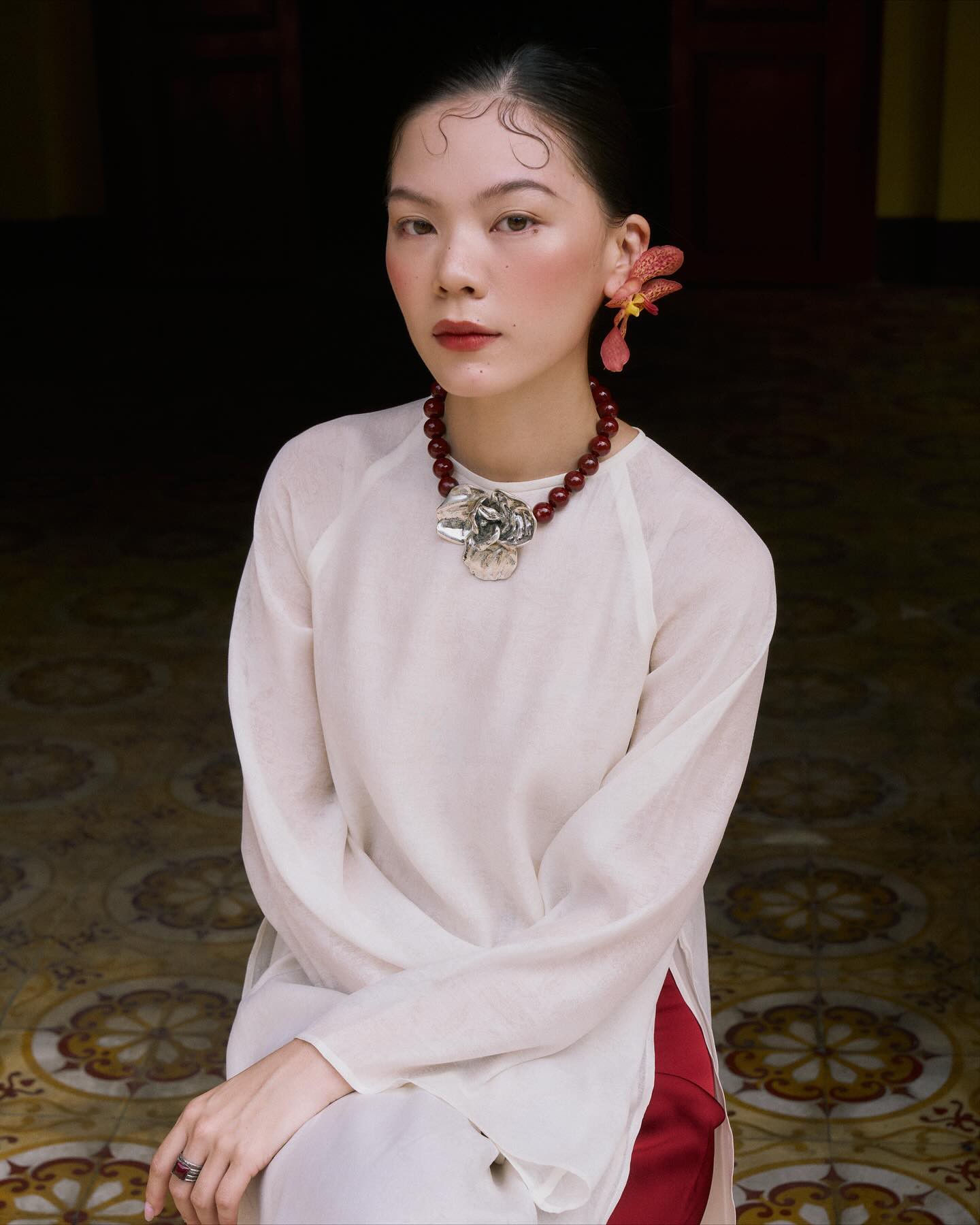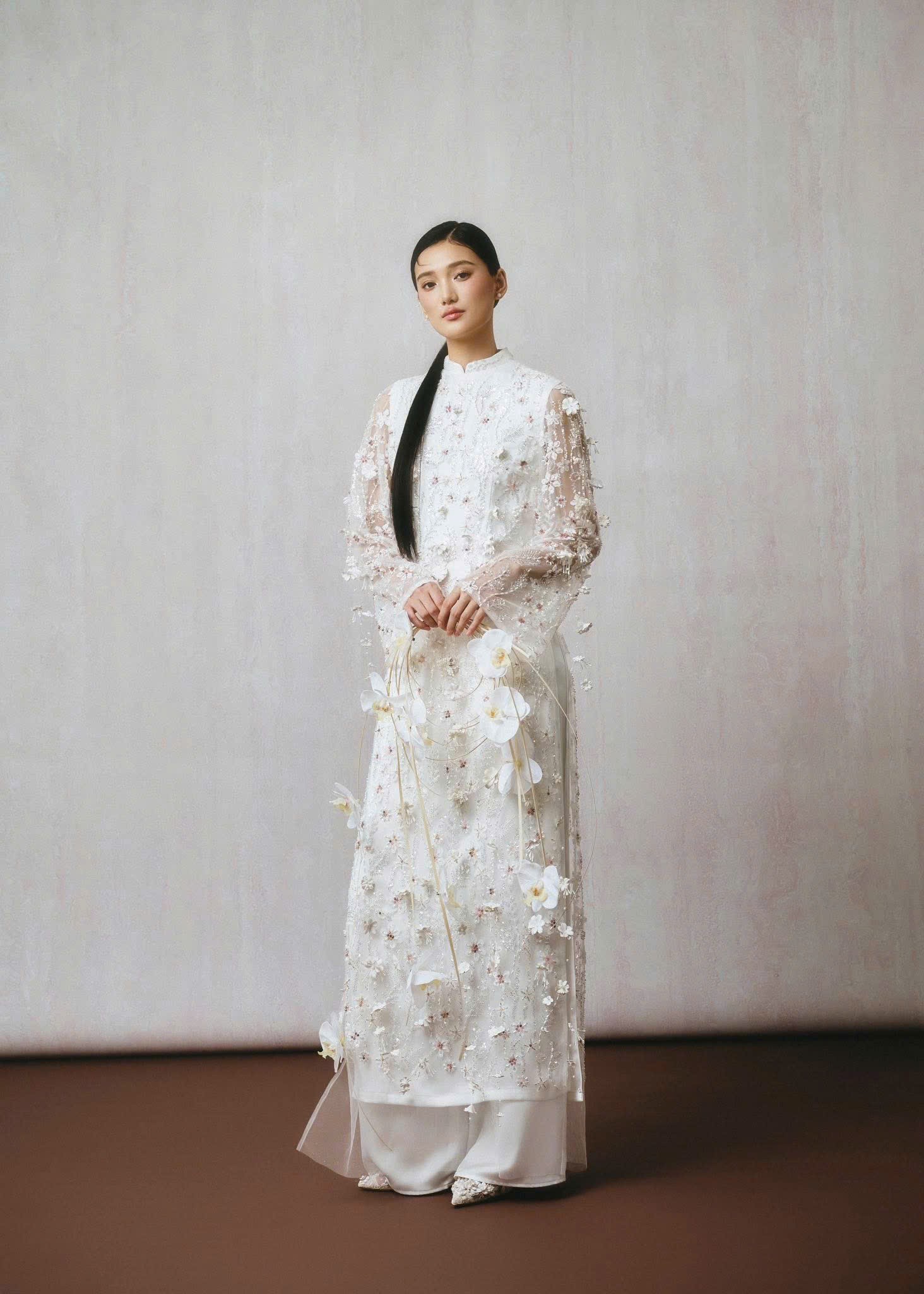 An Vân mở đầu bộ sưu tập bằng sắc lụa voan trong trẻo, gợi hơi sương buổi sớm. Uyển Dung tiếp nối với gam hồng dịu, thể hiện nét nữ tính hiện đại cùng sức mạnh mềm của sự tĩnh tại. Ở trung tâm BST là Ánh Liên, mẫu áo dài ren thêu hoa khẽ nở trong ánh sáng, mang đến vẻ thanh thuần nhưng giàu chiều sâu. Khi Diên Hoa khai thác gấm thêu và sắc đỏ trầm cho hình ảnh người phụ nữ trưởng thành, sâu lắng và đầy bản lĩnh; Tự Do Tĩnh Lặng biểu đạt sự giải phóng nhẹ nhàng sau khi tìm thấy sự yên bình từ bên trong với thiết kế kem tinh khôi kết hợp cấu trúc hiện đại.