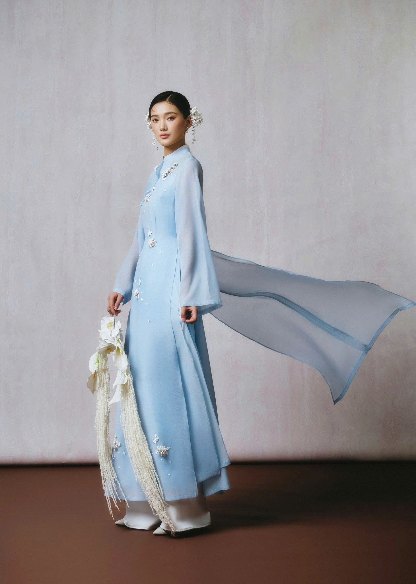 BST gồm nhiều thiết kế trải dài những gam màu đặc trưng của tranh lụa và mỹ thuật Đông Dương từ sắc hồng phấn, xanh lam, vàng champagne đến trắng ngọc và xanh lục non. Phom dáng áo dài được giữ nguyên sự kín đáo truyền thống: cổ cao, tay dài, thân áo suông thẳng, kết hợp với quần lụa mềm tạo nhịp rũ thanh thoát. Bên cạnh đó, một số mẫu được biến tấu tinh tế với cổ áo cài nơ lụa hoặc đính hoa đá 3D, mang lại hiệu ứng thị giác hiện đại nhưng không phá vỡ tinh thần cổ điển.