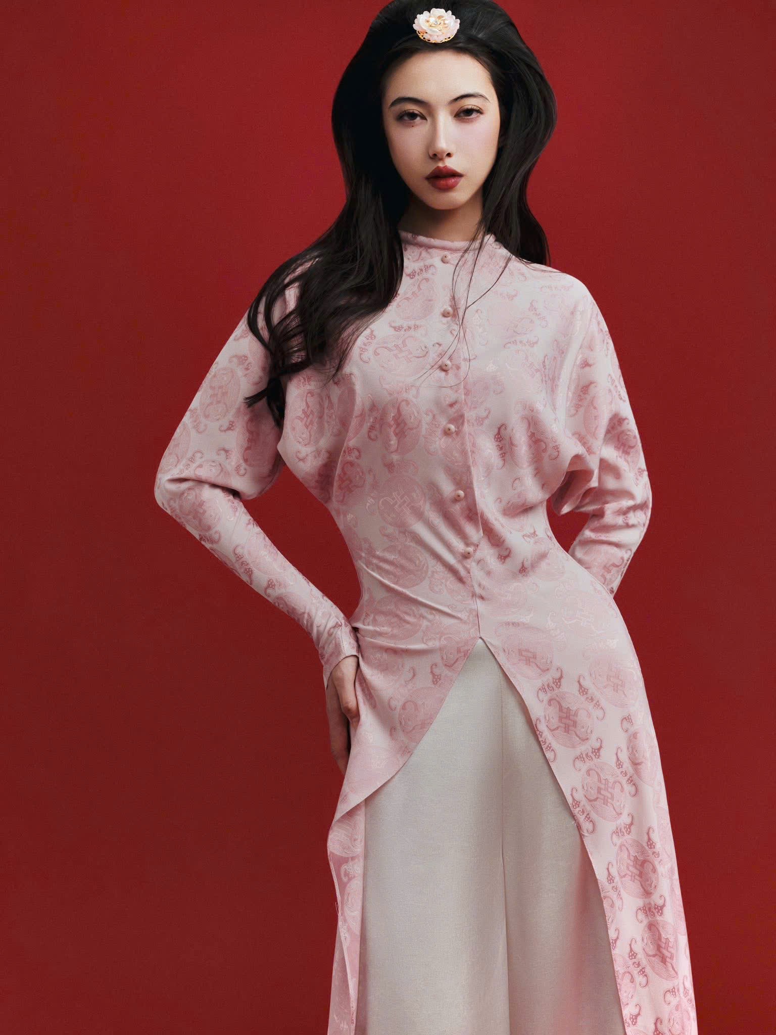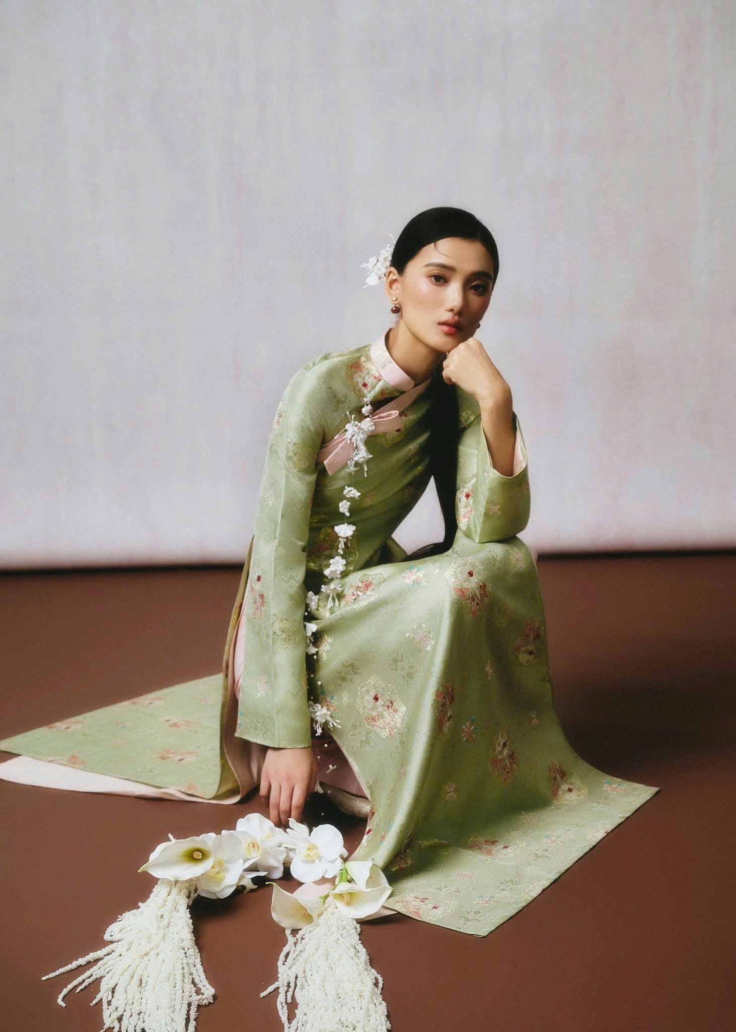 Với chất liệu chủ đạo gồm gấm, lụa, satin, jacquard và nhung cao cấp, BST khai thác hiệu ứng bề mặt một cách tinh tế: độ bóng nhẹ, họa tiết tròn cổ điển, đường dệt nổi mềm… tất cả cùng hòa vào bảng màu phong phú từ trắng ngà, hồng phấn, tím oải hương đến xanh cốm, vàng mật ong và đỏ son. Mỗi gam màu gợi một sắc thái cảm xúc: nhẹ nhàng, nữ tính, sang trọng hoặc đậm chất Á Đông.