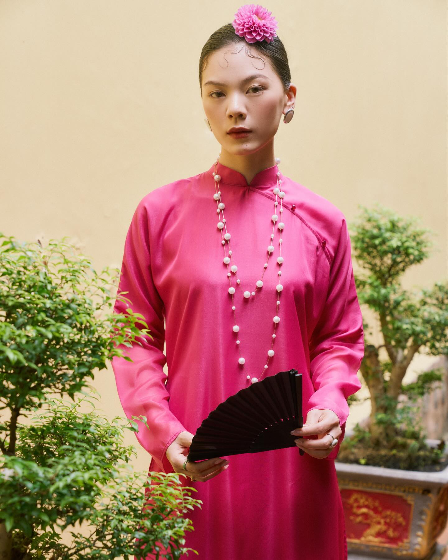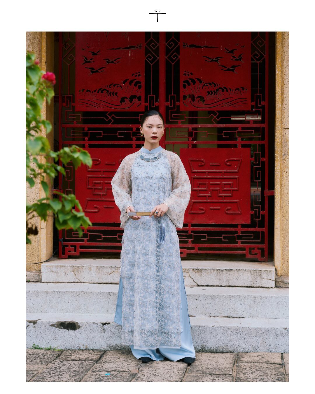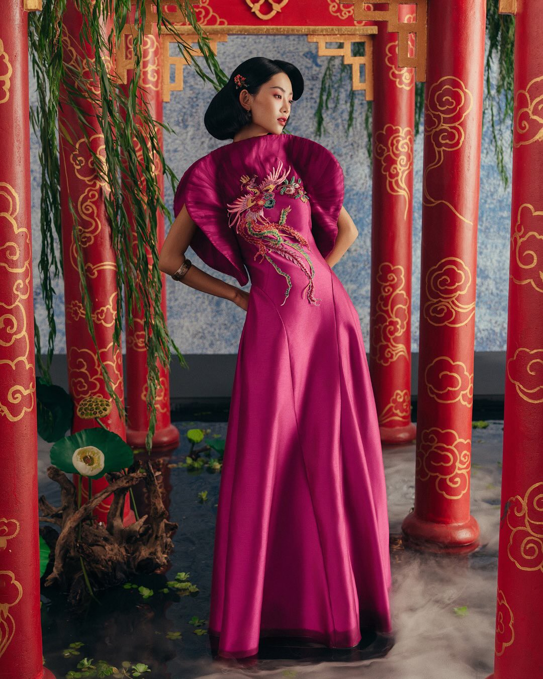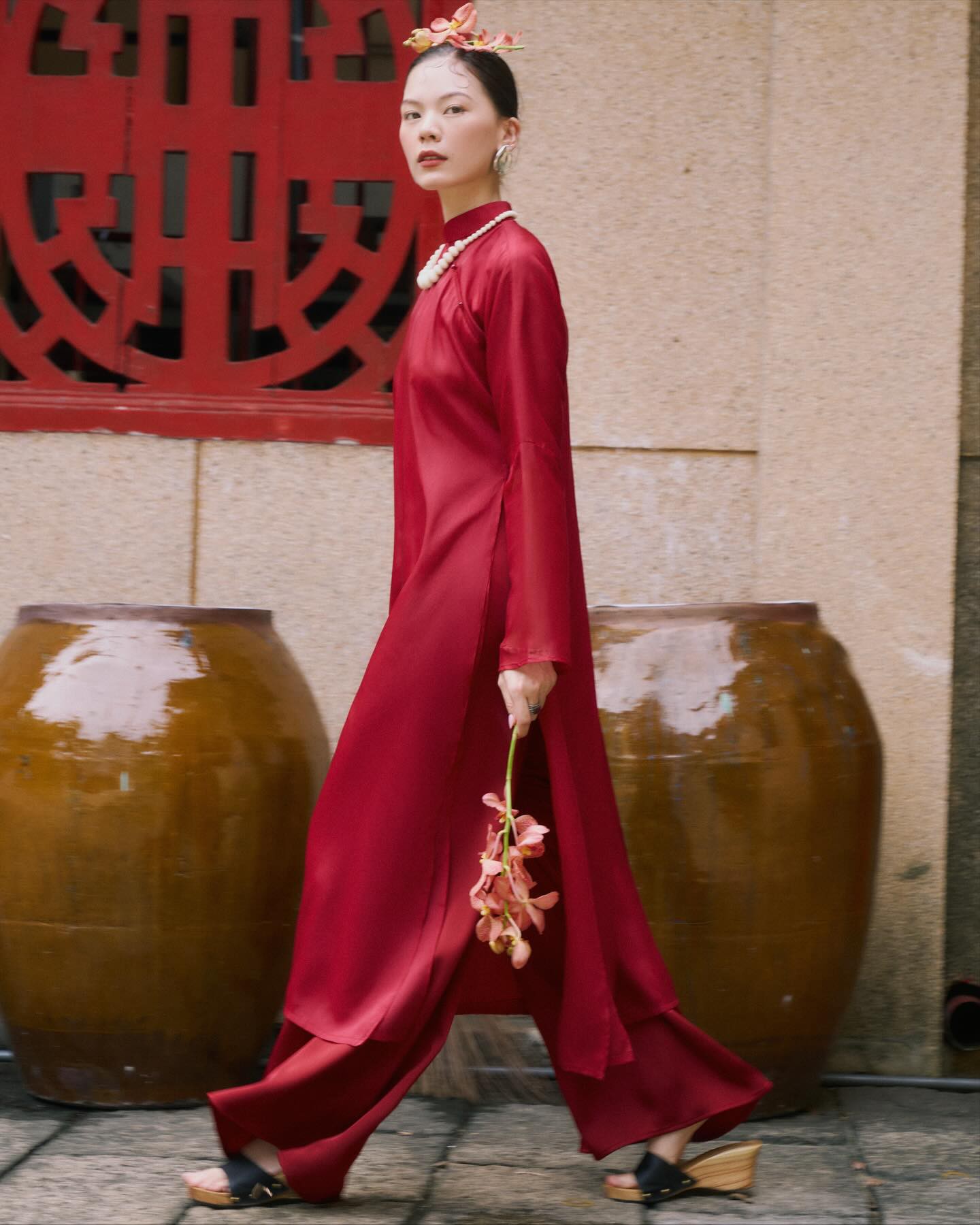 Phom dáng được giữ nguyên cấu trúc truyền thống với cổ cao, tay rộng, tà suông thẳng, nhưng được tinh chỉnh để phù hợp bối cảnh đương đại. Khi khoác lên mình, tà áo tạo cảm giác vừa kín đáo vừa mềm mại, vừa truyền thống lại vẫn hiện đại, nhờ cách xử lý độ rũ tinh tế và tỉ lệ layer được tính toán kỹ lưỡng. Một số thiết kế nổi bật sử dụng chất liệu nhung ôm nhẹ, tôn đường cong mà không phô diễn; hay áo dài gấm phối quần satin tương phản, tạo chiều sâu thị giác. Sự tiết chế trong chi tiết trang trí giúp chất liệu và dáng áo tự kể câu chuyện của mình: lặng thầm nhưng đầy sức gợi.