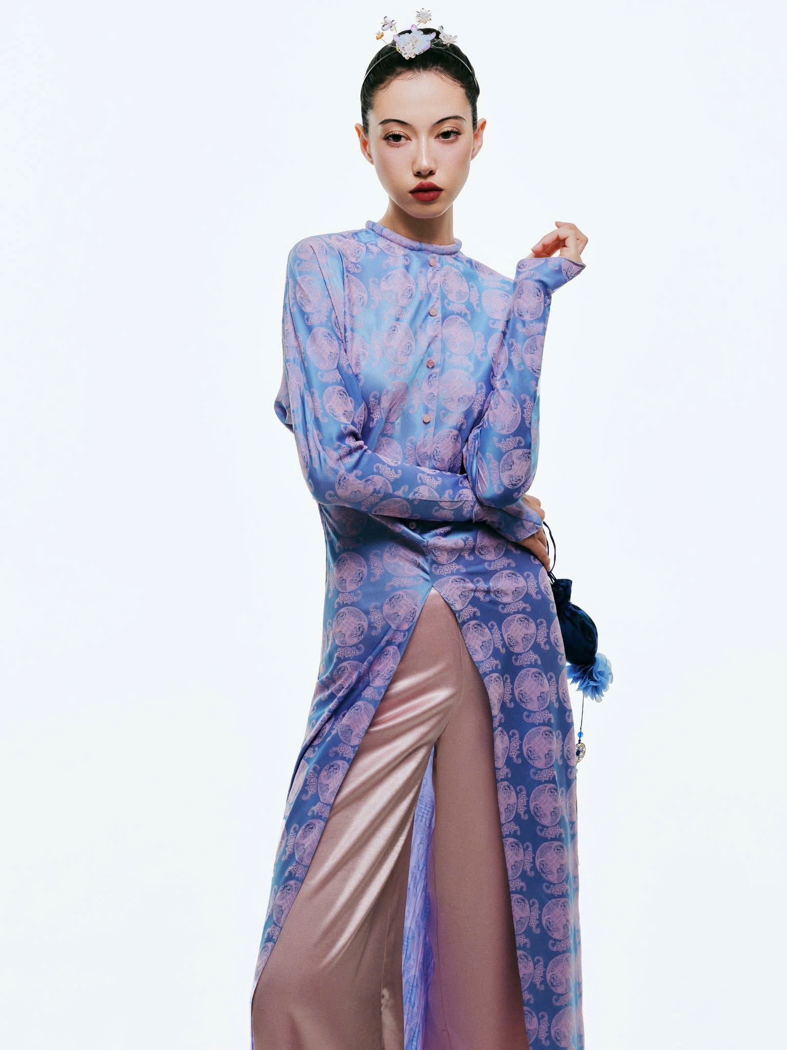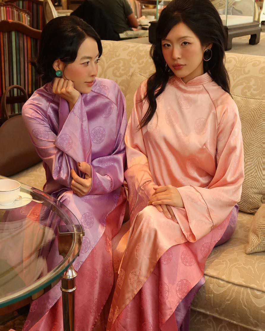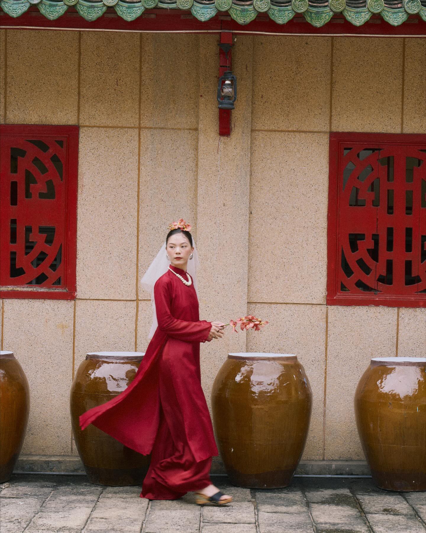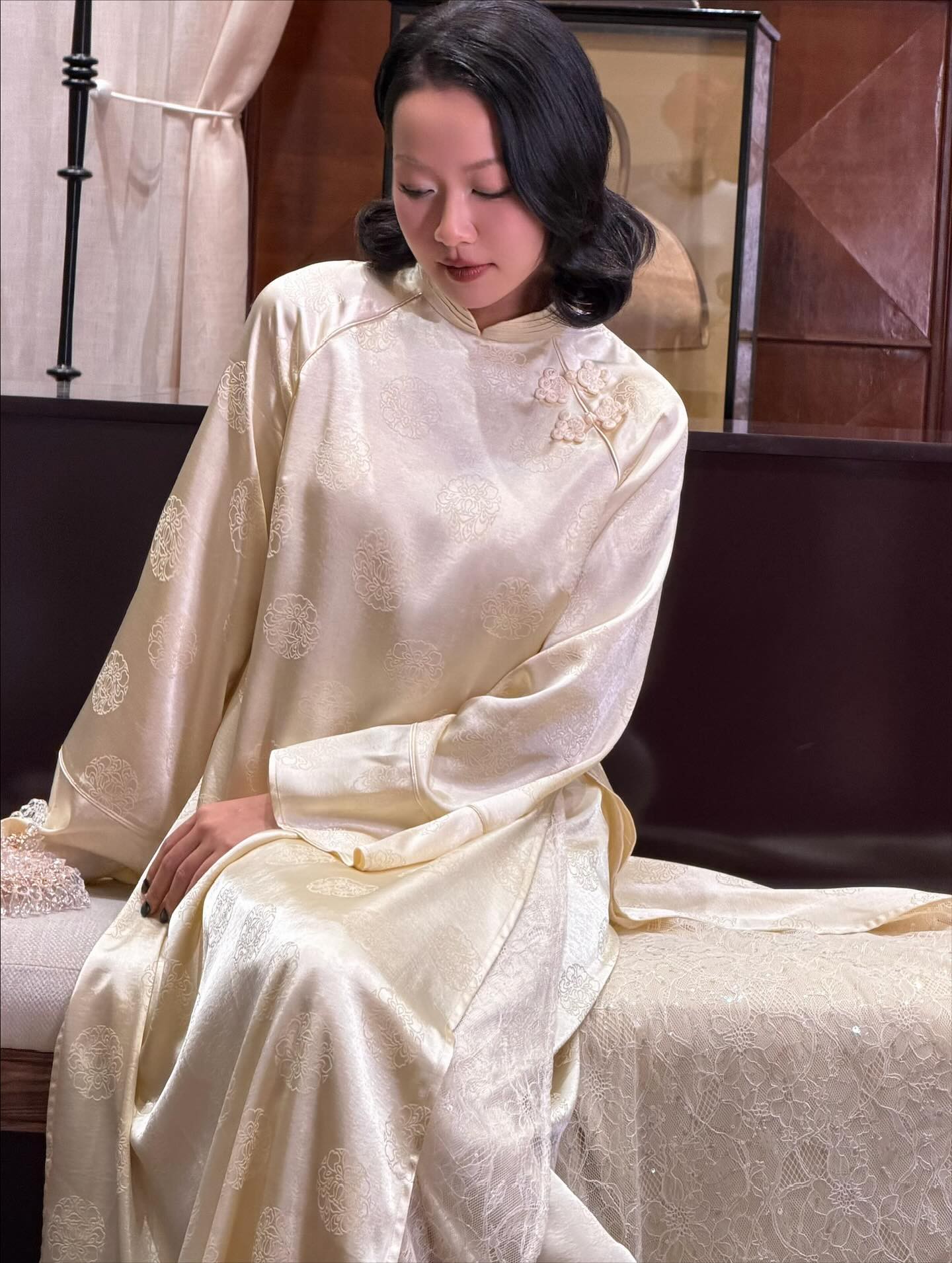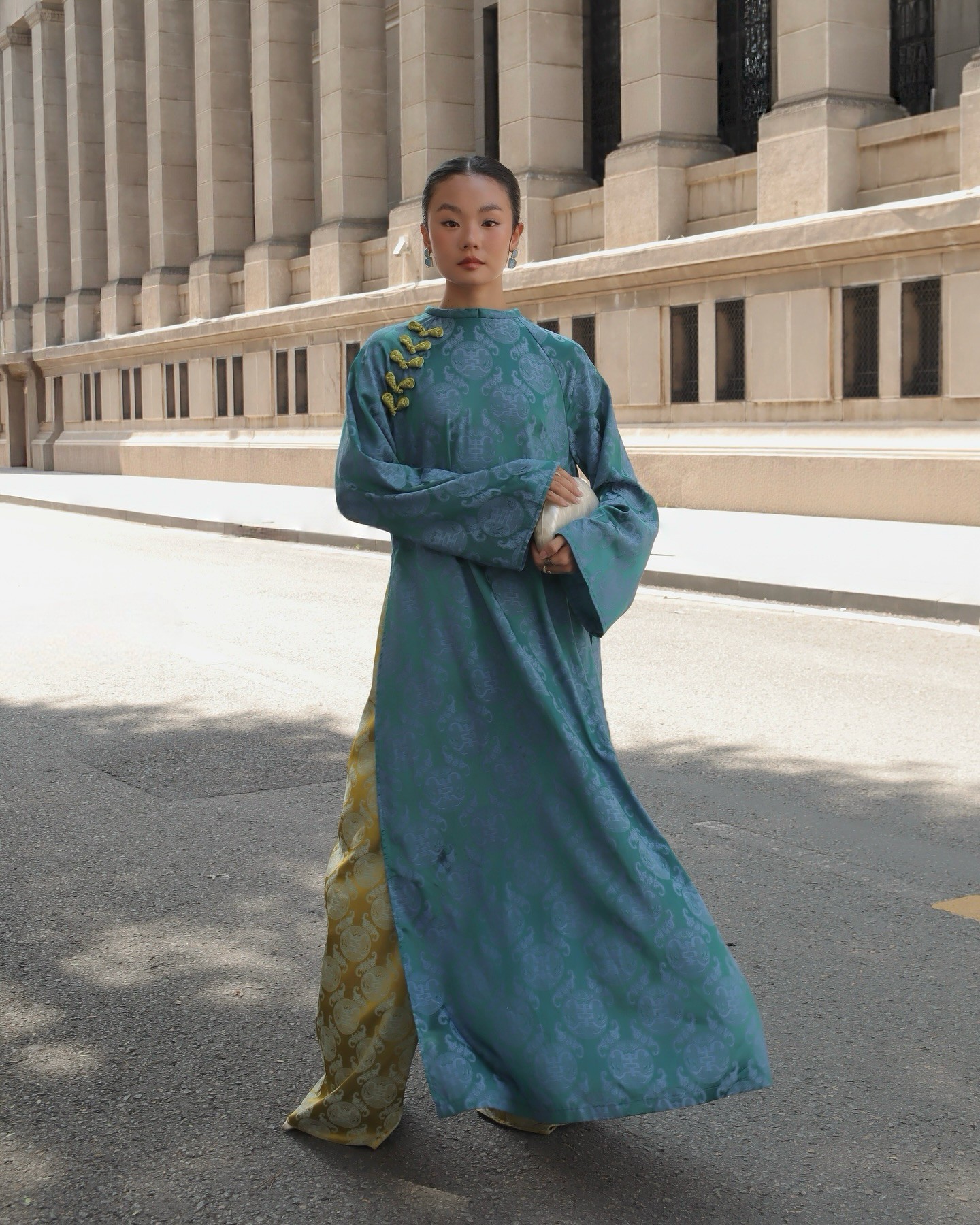 Phom dáng được giữ nguyên cấu trúc truyền thống với cổ cao, tay rộng, tà suông thẳng, nhưng được tinh chỉnh để phù hợp bối cảnh đương đại. Khi khoác lên mình, tà áo tạo cảm giác vừa kín đáo vừa mềm mại, vừa truyền thống lại vẫn hiện đại, nhờ cách xử lý độ rũ tinh tế và tỉ lệ layer được tính toán kỹ lưỡng. Một số thiết kế nổi bật sử dụng chất liệu nhung ôm nhẹ, tôn đường cong mà không phô diễn; hay áo dài gấm phối quần satin tương phản, tạo chiều sâu thị giác. Sự tiết chế trong chi tiết trang trí giúp chất liệu và dáng áo tự kể câu chuyện của mình: lặng thầm nhưng đầy sức gợi.