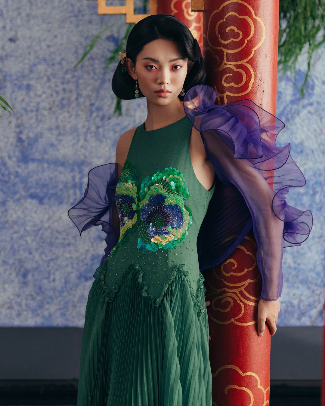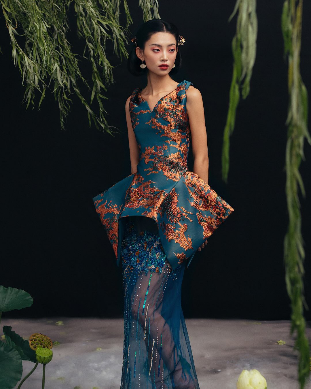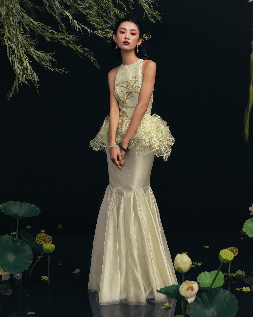 Mỗi thiết kế trong BST như một lát cắt của Huế từ màu nước rêu phủ mặt đình, sắc xanh hồ sen, tím ngọc phượng, đến vàng cổ kính của những bức tường nhuốm thời gian. Những hình ảnh ấy không được mô tả bằng ngôn từ, mà bằng chuyển động của chất liệu: ren, tơ, gấm, organza, jacquard… mỗi lớp vải như một lớp ký ức dần được hé lộ.