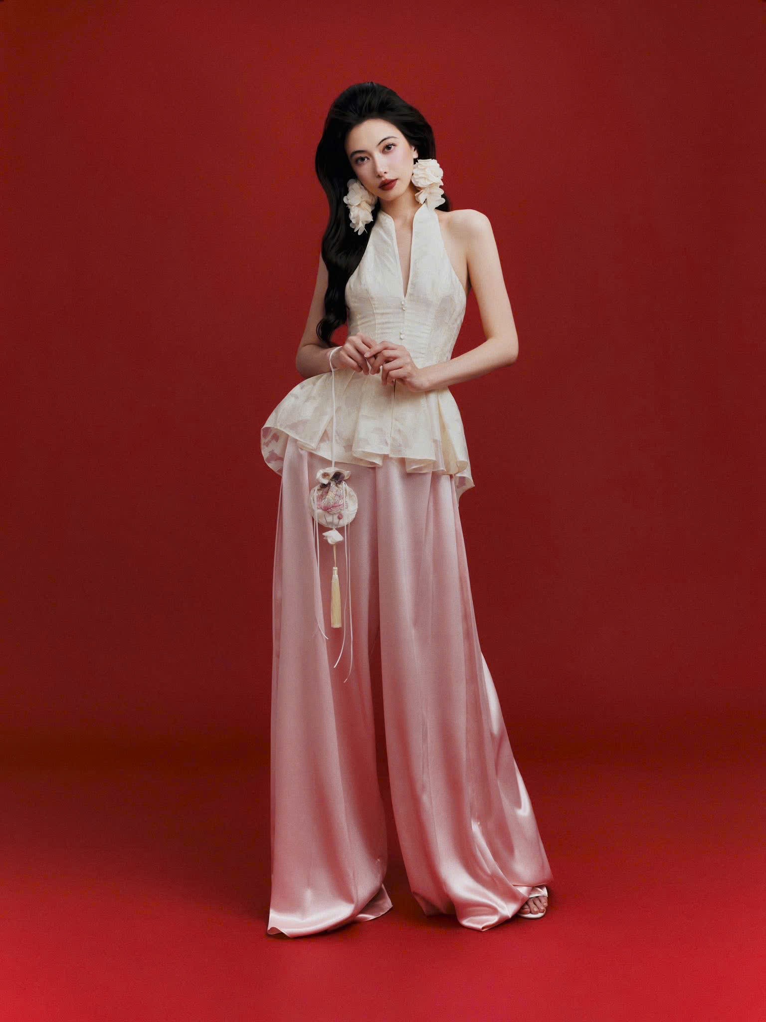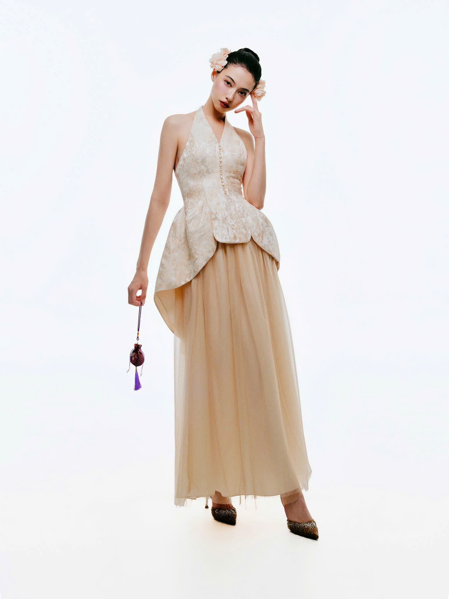 Khi chiêm ngưỡng BST, người xem dễ dàng cảm nhận sắc thái đặc trưng của “Giao”: dịu dàng, lặng lẽ và thấm đẫm tinh thần Á Đông. Những tấm lụa đón sáng, hiệu ứng layering trong - đục, cùng các hoa văn dệt cổ được xử lý tinh tế tạo nên chiều sâu thị giác rõ rệt. Tà áo dài, các mẫu váy yếm hiện đại hay những thiết kế lụa nhiều lớp đều mang chung nhịp điệu mềm mại, như đang chuyển động theo gió đầu mùa. Bảng màu của BST là một trong những điểm nhấn nổi bật, với các sắc độ được tiết chế vừa đủ: hồng phấn, vàng mơ, xanh rêu, ngọc khói… Mỗi thiết kế vì vậy mang đến cảm giác “giao hòa” – giữa trầm và tươi, quen thuộc và mới mẻ – đúng tinh thần của thời khắc bước sang năm mới.
