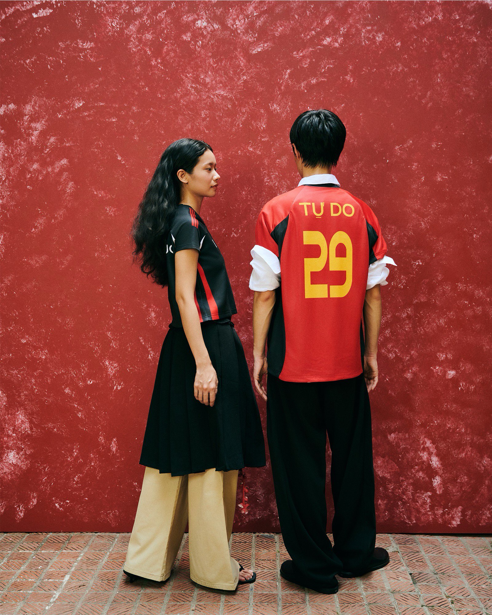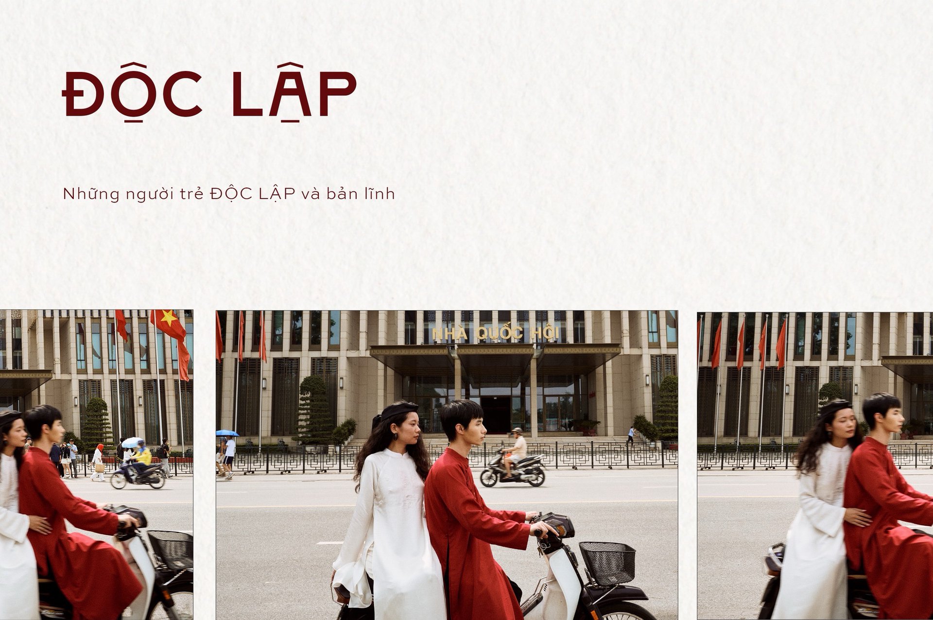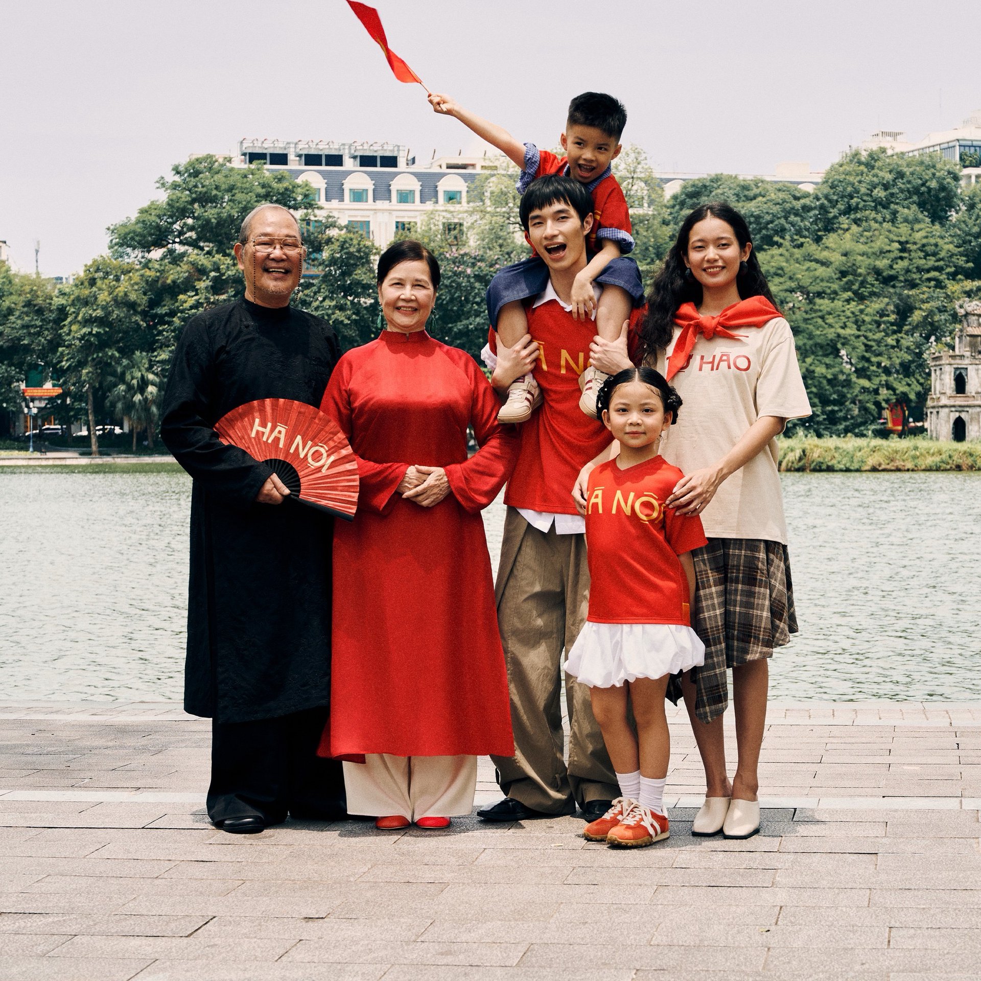Từ hình ảnh gia đình ba thế hệ cùng dạo quanh Hồ Gươm, cho đến những dòng chữ in đậm “Tự do – Độc lập” trên lưng áo, BST như bản giao thoa giữa Hà Nội 1945 và Hà Nội 2025. Trong từng khung hình, người ta thấy tiếng cười hồn nhiên của trẻ thơ, sự bản lĩnh của thế hệ trẻ và cả ánh mắt điềm tĩnh của ông bà – những chứng nhân cho tình yêu bền chặt và những giá trị Hà Nội vẫn luôn gìn giữ.