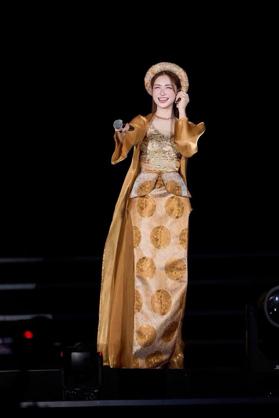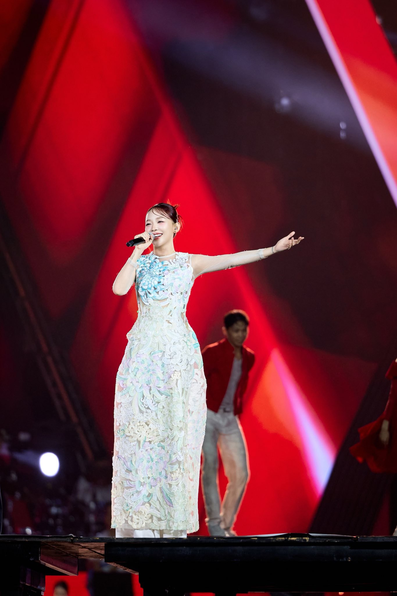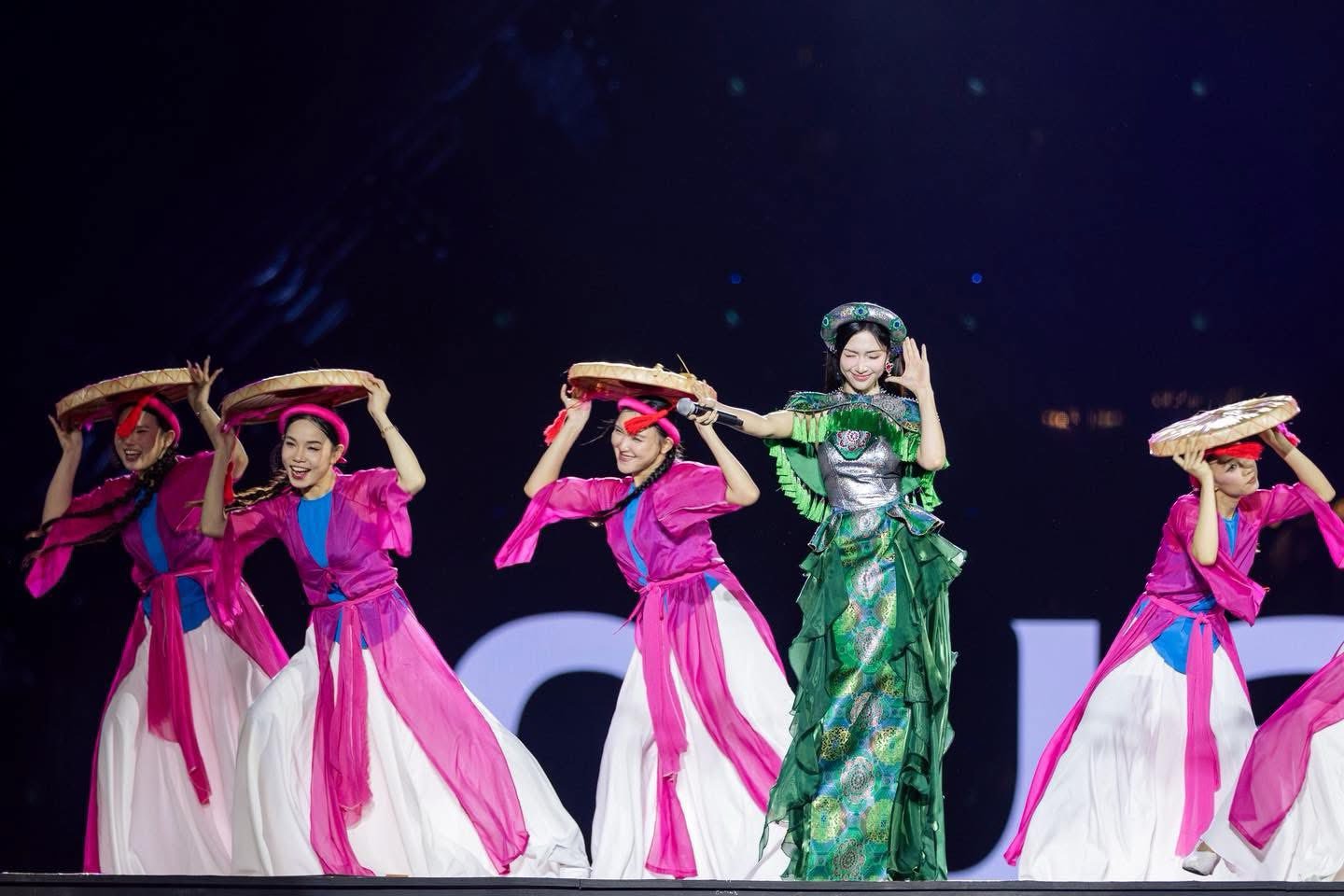 Tại VConcert – đại nhạc hội yêu nước 2025, Phương Mỹ Chi đã trở thành tâm điểm khi trình diễn trong thiết kế thời trang Việt độc bản “Cò Bay Trên Rừng Lụa – The Storks in the Silk Forest” của thương hiệu SBHN.