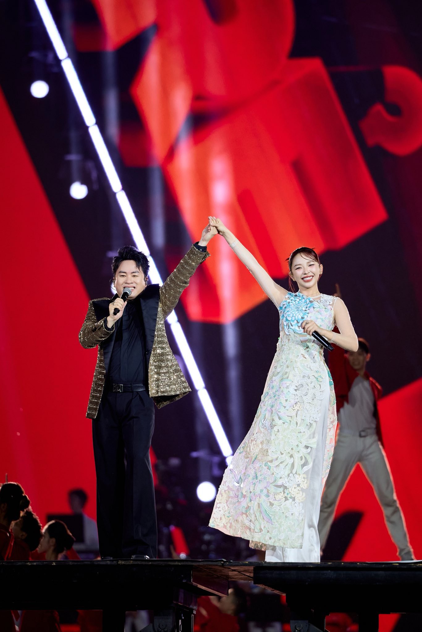 Phía sau sự cầu kỳ ấy là dấu ấn của nhà thiết kế Cao Minh Tiến – người nhiều năm gắn bó với áo dài cách tân và các kỹ thuật thêu tay tinh xảo. Nếu trong MV Bắc Bling – hiện tượng âm nhạc đầu năm 2025 anh đã xây dựng cho Hoà Minzy tới 7 tạo hình khác nhau, gợi nhắc hình ảnh khăn mỏ quạ, nón quai thao, liền chị quan họ thì tại V CONCERT, thiết kế dành cho nữ ca sĩ chính là sự tiếp nối trực tiếp: đưa tinh thần quan họ ra khỏi màn ảnh để chạm vào hàng chục nghìn khán giả trực tiếp.