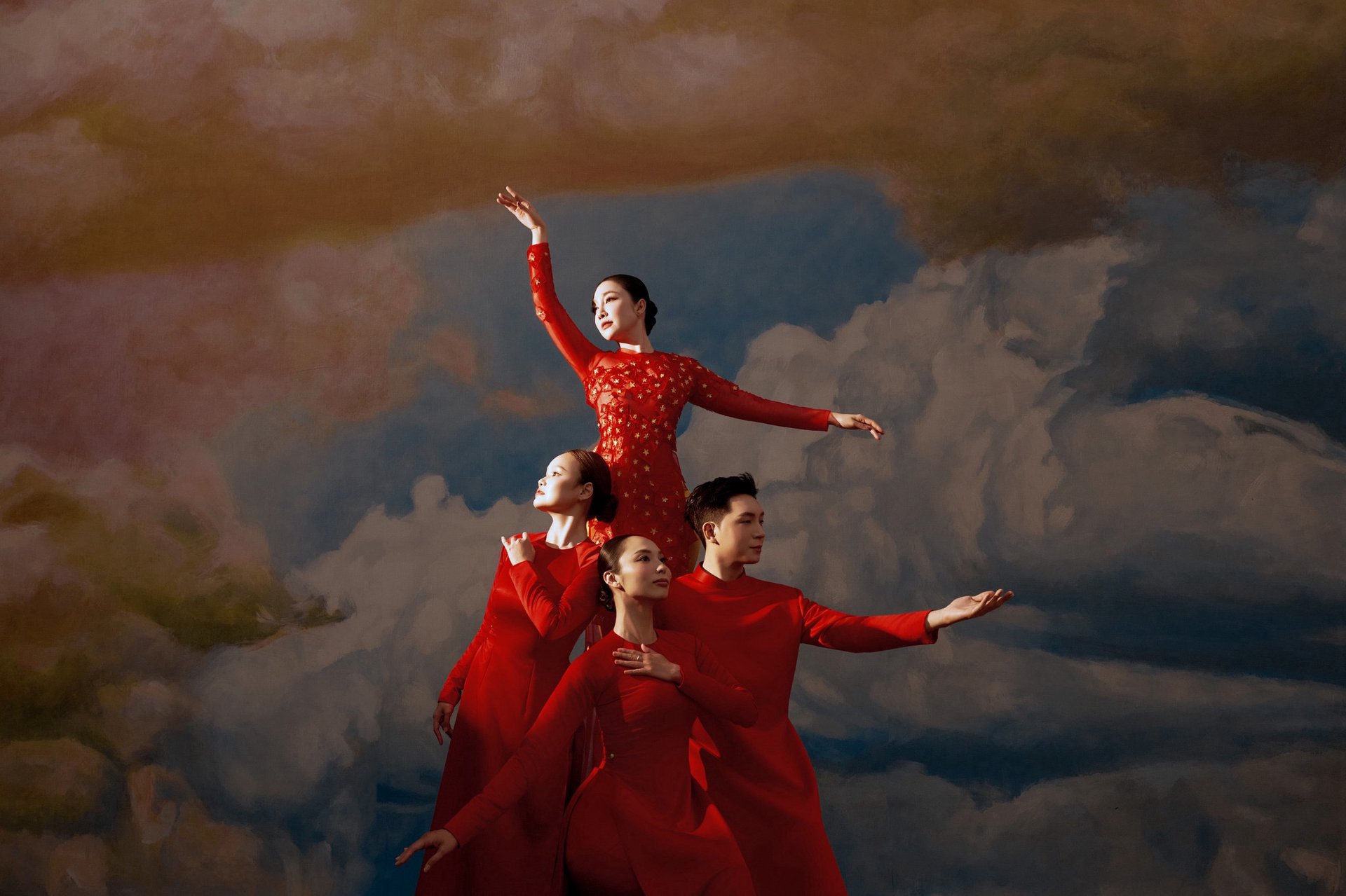 Trên nền lụa đỏ, hình ảnh cánh cò 3D sải cánh tạo nên trường liên tưởng phong phú: từ những cánh đồng làng quê Bắc Bộ đến biểu tượng cho sự thanh cao, tự do và khát vọng hòa bình. Chất liệu lụa và organza xuyên thấu được dựng thành nhiều lớp, cho hiệu ứng chuyển động mềm mại, như thể chính những cánh cò đang bay lên giữa không gian ánh sáng của đại nhạc hội.