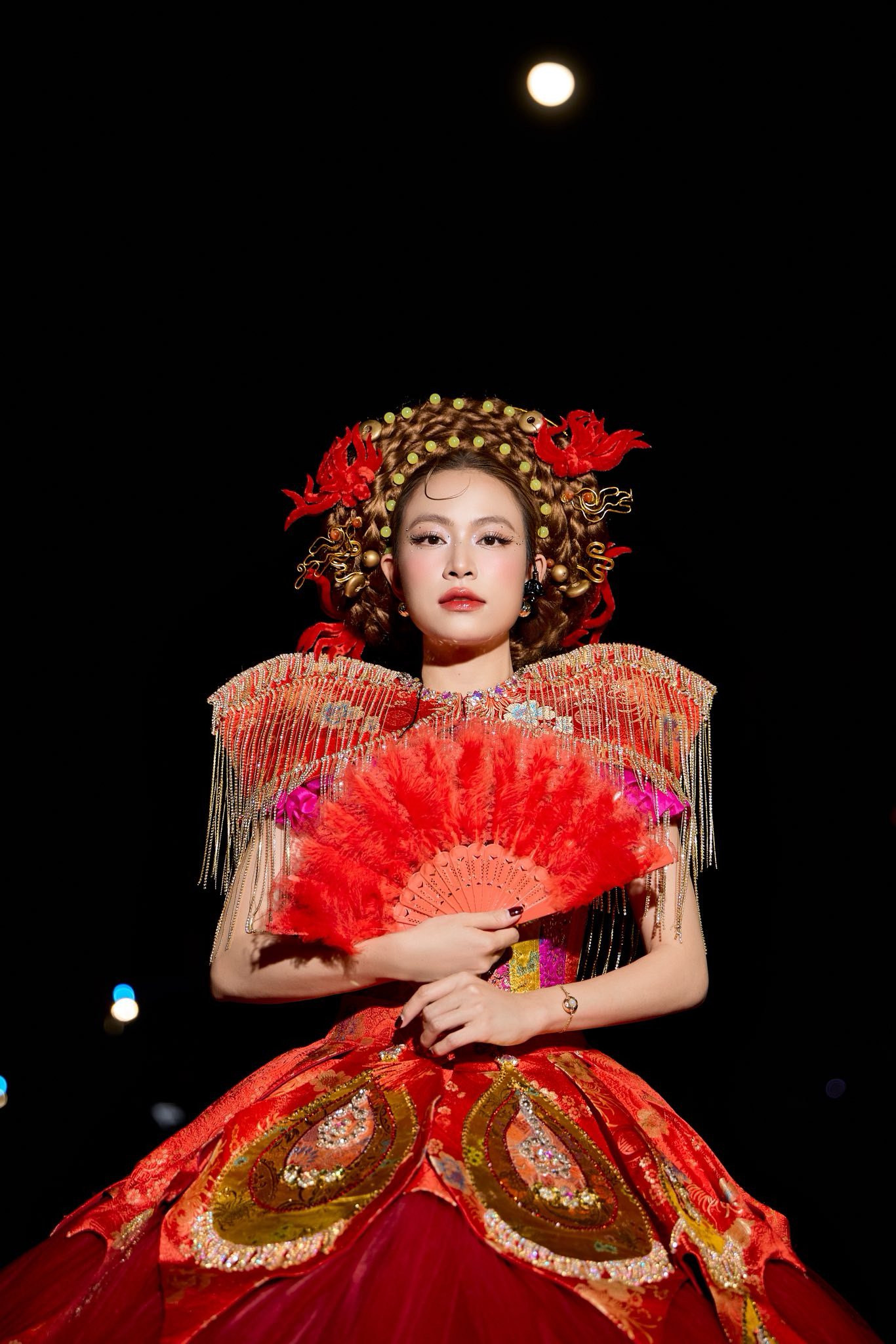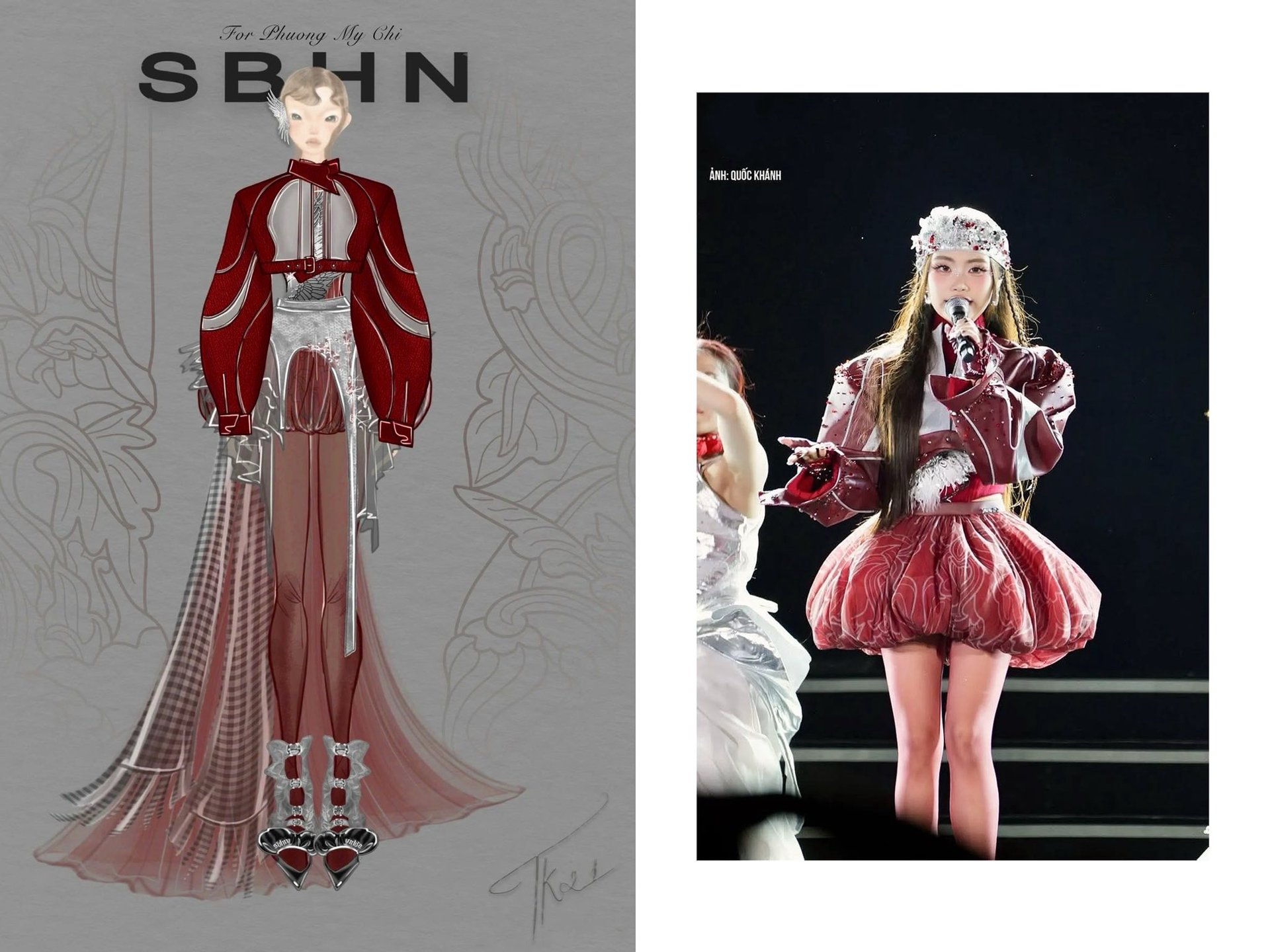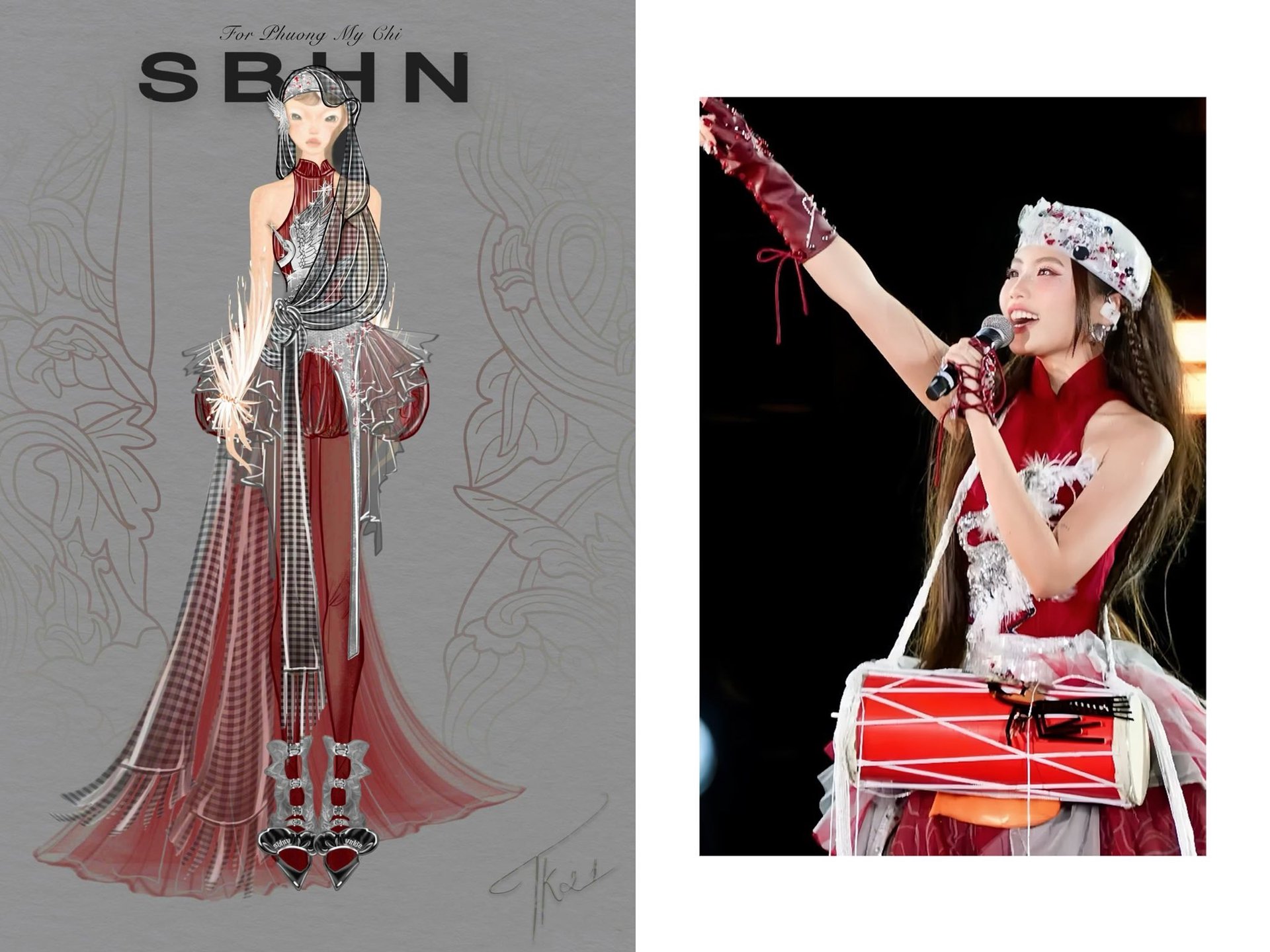 Đặc biệt, chiếc trống cơm xuất hiện cùng bộ trang phục, không chỉ là đạo cụ biểu diễn mà còn là “nhạc cụ sống” trong chính thiết kế, hòa quyện âm thanh dân gian vào ngôn ngữ thời trang. Trên sân khấu VConcert, mỗi chuyển động của Phương Mỹ Chi vì thế trở thành khoảnh khắc giao thoa của âm nhạc, thời trang và bản sắc Việt.