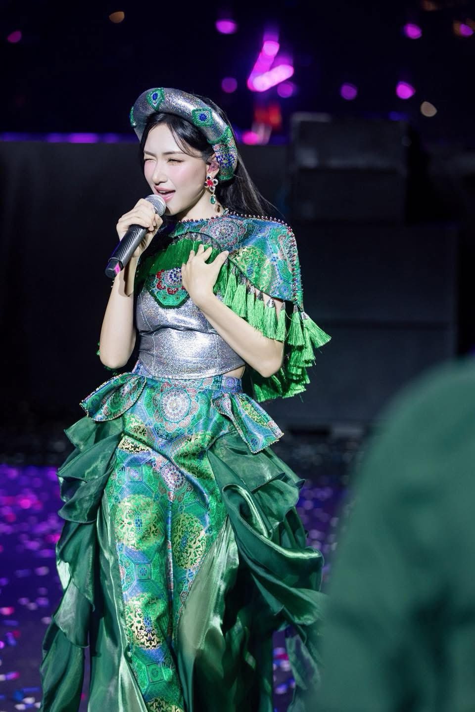 Một trong những tiết mục để lại dấu ấn sâu đậm nhất tại V CONCERT chính là “Bắc Bling” của Hoà Minzy, với sự góp mặt đặc biệt của nghệ sĩ Xuân Hinh. Trên sân khấu, Hoà Minzy xuất hiện trong bộ trang phục thời trang Việt gồm mấn, áo choàng, áo yếm và váy, tất cả phủ kín hoa văn, điểm xuyết bằng những mảng thêu nổi và đính kết cườm cầu kỳ. Bộ cánh như bức tranh mở ra không gian văn hoá ngập tràn màu sắc dân gian Bắc Bộ.
