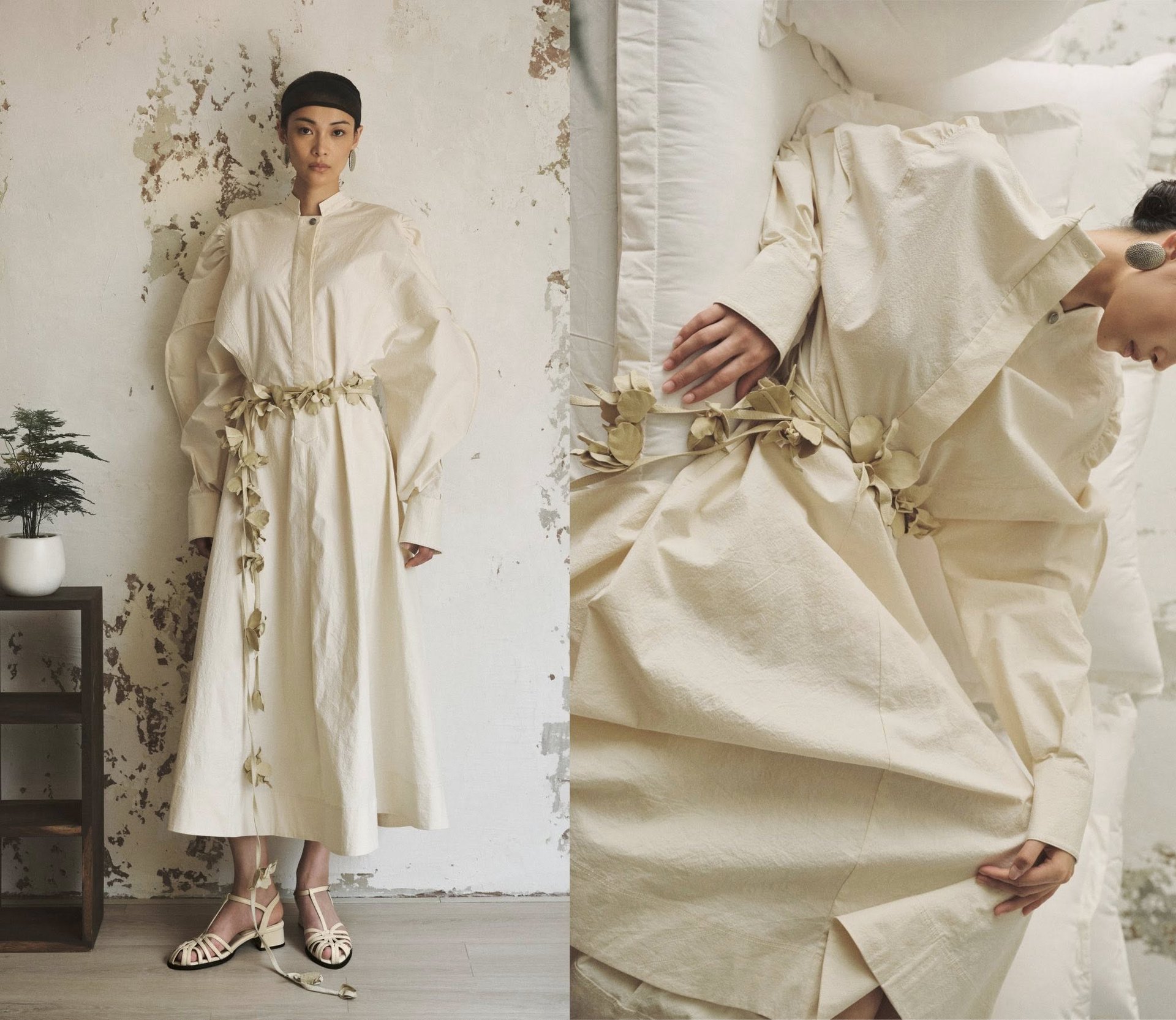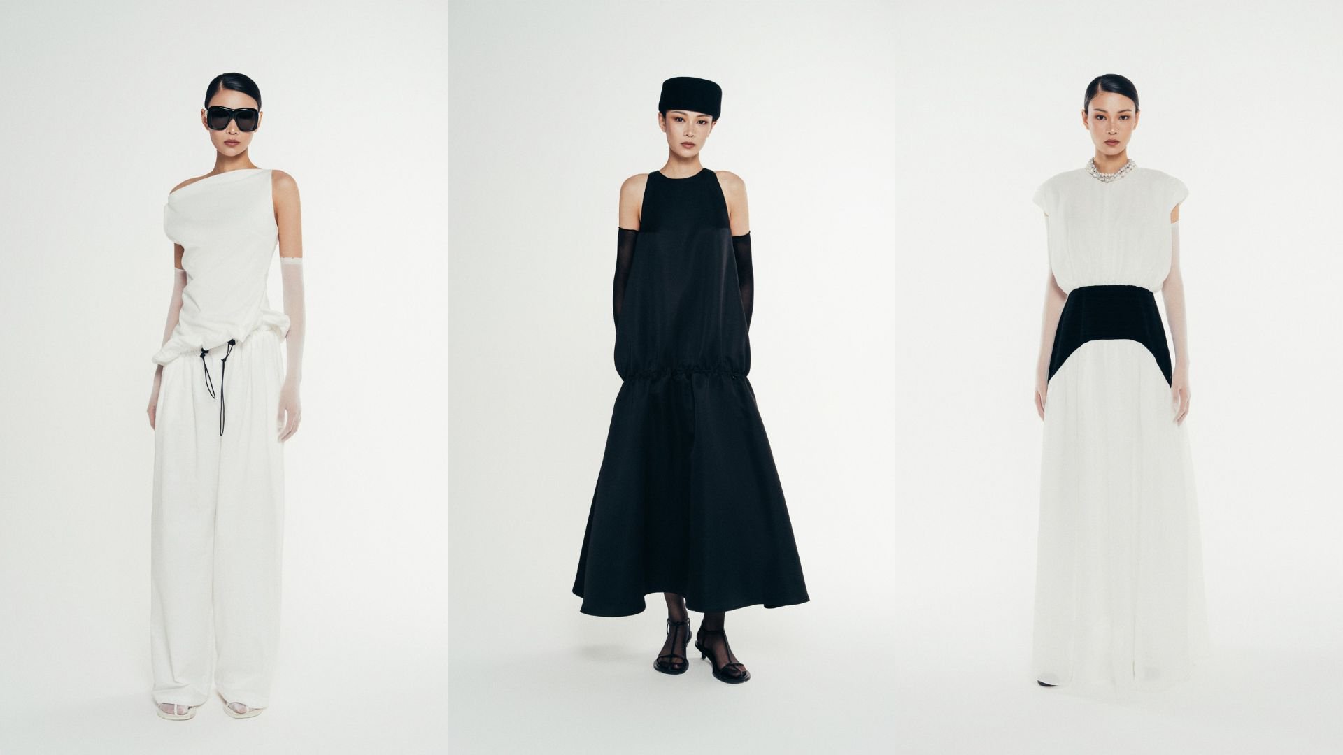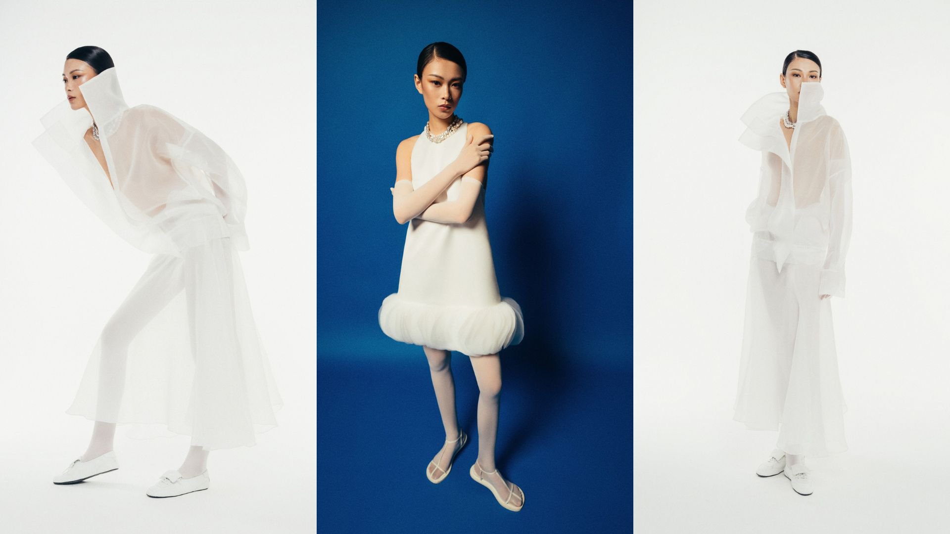 Chương đầu sẽ là màn đối thoại giữa chất liệu vải kaki gân và visco. Cả hai mang trong mình sự mộc mạc và cảm giác gần gũi. Mỗi thiết kế được cắt may ôm sát, tôn dáng trong sự tinh tế và đầy chủ động – như một cách người phụ nữ lắng nghe và đối thoại với cơ thể mình. Ở Đối thoại, vải lưới dẻo và su salin trắng, chất liệu mềm, rủ nhẹ ôm lấy đường cong, phom dáng mở và thoáng. Cuối cùng, ta được chiêm ngưỡng lụa crep trắng, mịn như hơi thở, bay theo từng chuyển động. Đường cắt thả tự nhiên, không níu giữ, không kiểm soát, và đang ôm lấy sự tự do.