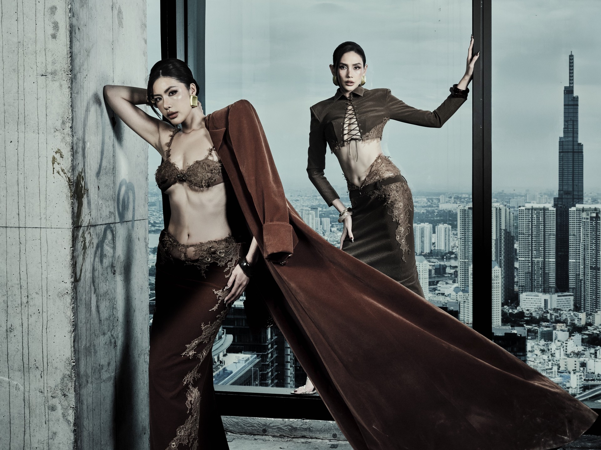 Trong bộ ảnh thứ hai, Huỳnh Tú Anh và Lại Mai Hoa diện các thiết kế da nâu bóng kết hợp cổ lông trắng, tạo đối lập ấn tượng, tập trung phom tay phồng, thắt lưng bản rộng siết eo, mang vẻ hoang dã, hiện đại và quyền lực. Minh Tú hóa thân thành nữ hoàng sa mạc tương lai với áo choàng layering phủ lên bra ren và chân váy corset, chất liệu nhung nâu đất kết hợp ren loang gợi hình ảnh cát gió chuyển động. Võ Hoàng Yến xuất hiện quyền lực và sang trọng trong croptop dây đan kết hợp chân váy dài da, ren được đắp dọc tay áo, eo và hông, tạo điểm nhấn mềm mại đối lập với chất liệu da.