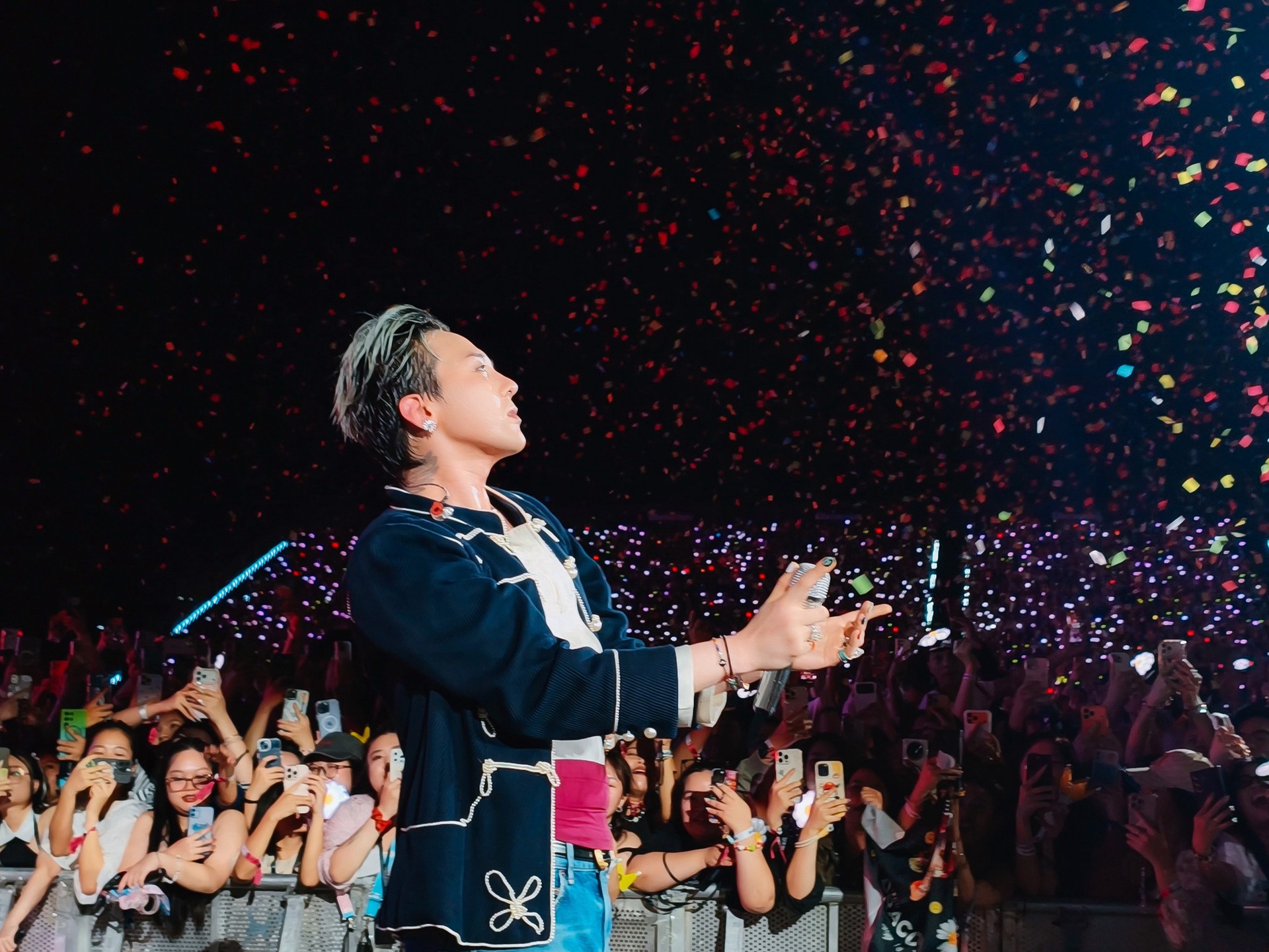 Và khi show bắt đầu, khán đài Hà Nội không khác gì một cỗ máy đồng thanh khổng lồ. Từng câu fanchant nổ ra chuẩn từng nhịp beat, từng đoạn ngân dài được fan giữ vững không lệch một nhịp nào. Trong những khoảnh khắc im lặng giữa các chương diễn, G‑Dragon lặng người vài giây, mắt quét xuống biển người đầy ánh sáng, rồi mỉm cười nhẹ. Đó không phải là nụ cười của một nghệ sĩ đang được cổ vũ, mà là của một người vừa nhận ra rằng mình đang đứng trước một cộng đồng thực sự hiểu và yêu mình đúng cách.