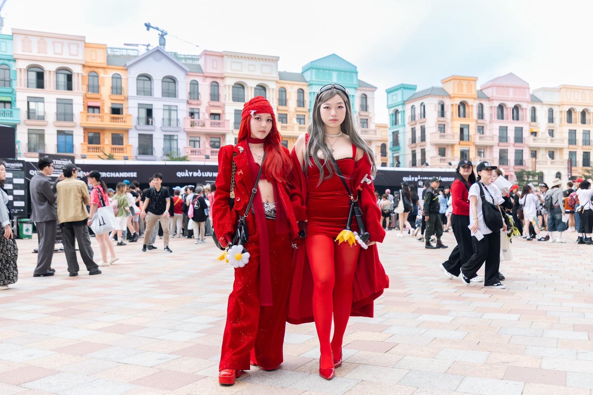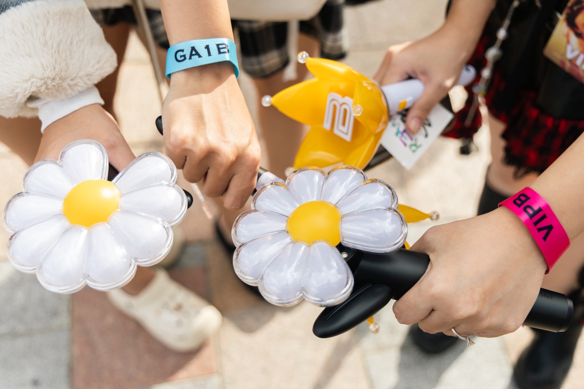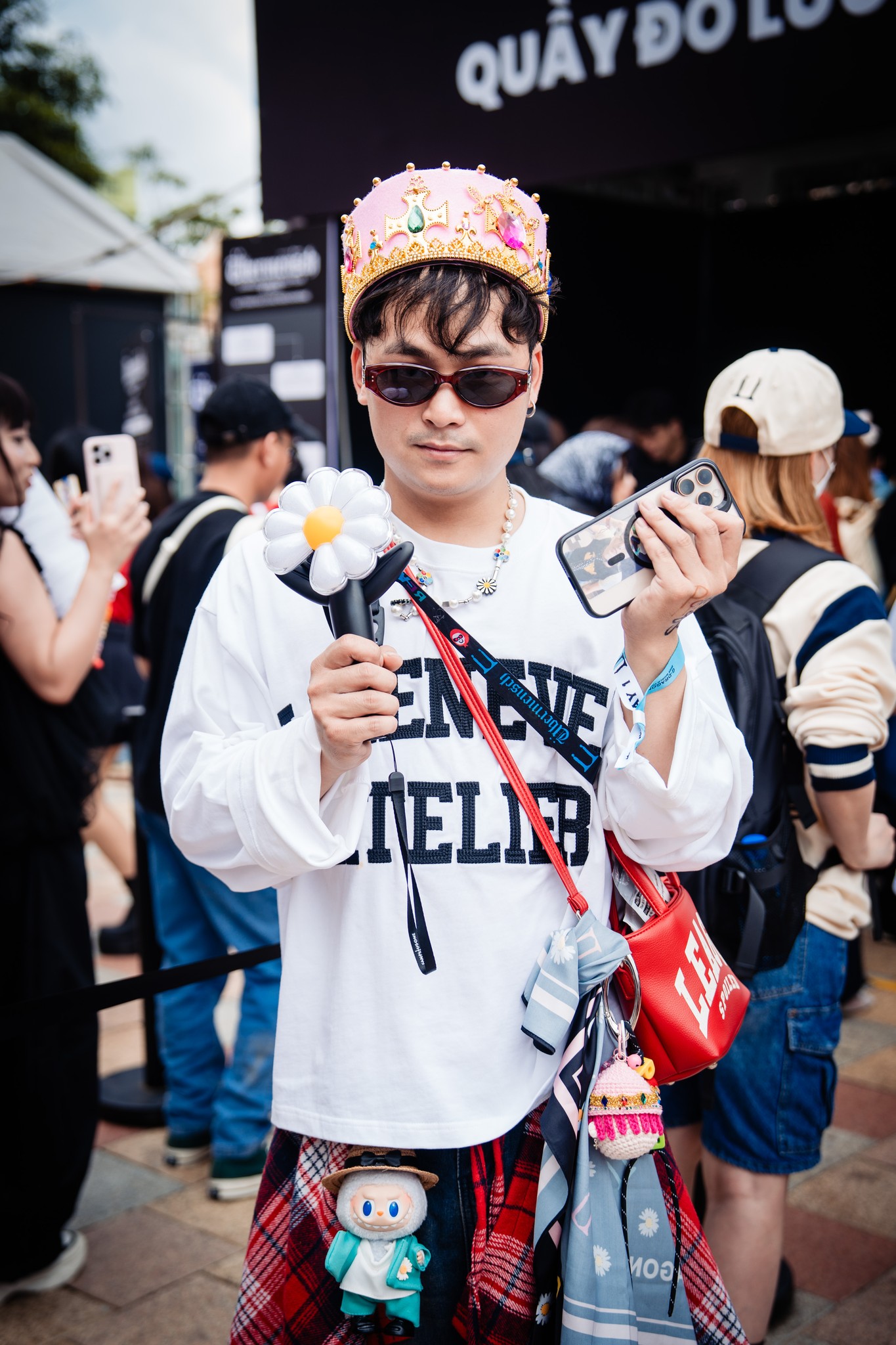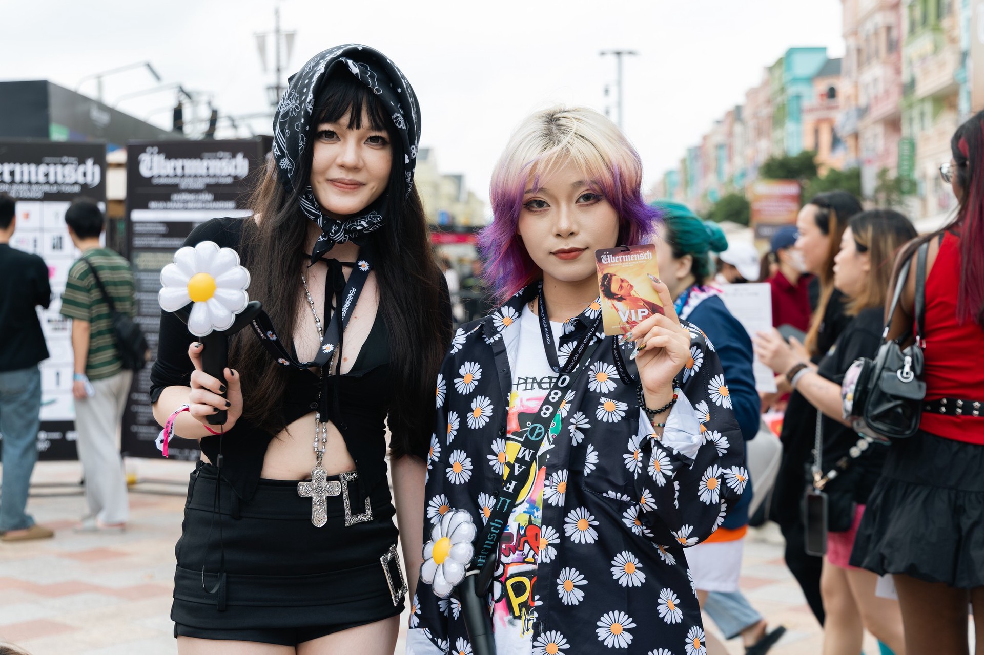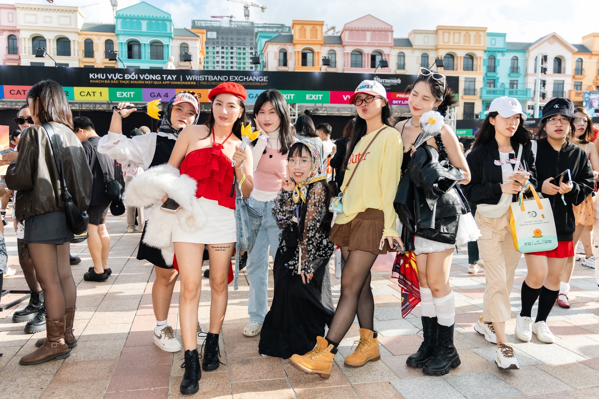 Ngay từ sáng sớm ngày 8 và 9 tháng 11, khu vực Ocean City đã náo nhiệt như một lễ hội thời trang đúng nghĩa. Từ sáng ngày diễn ra concert, các khu vực quanh sân khấu Ocean City đã trở thành địa bàn “lên đồ” của cộng đồng fan: mini skirt metallic, giày boots cao cổ, áo khoác varsity, khăn bandana, túi đeo chéo bản to, layering streetwear đa màu sắc. Điều đặc biệt chính là bông hoa cúc thiếu cánh ở khắp nơi: trên lưng áo khoác da, trên khăn quàng, trên áo mưa trên sticker dán đầy tay, những chiếc móc khóa, hay chỉ đơn giản là chiếc lightstick được cầm trên tay mỗi người.