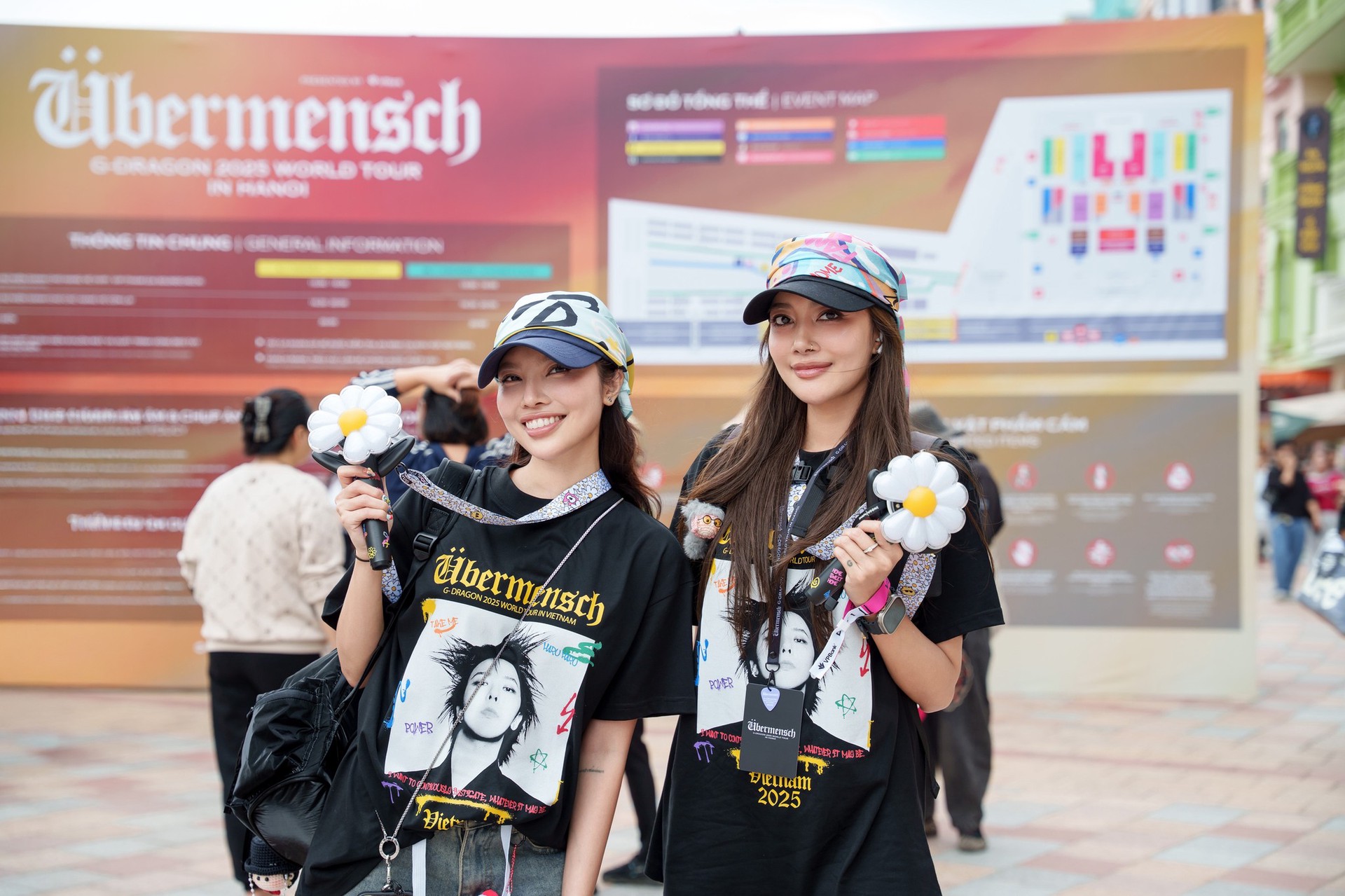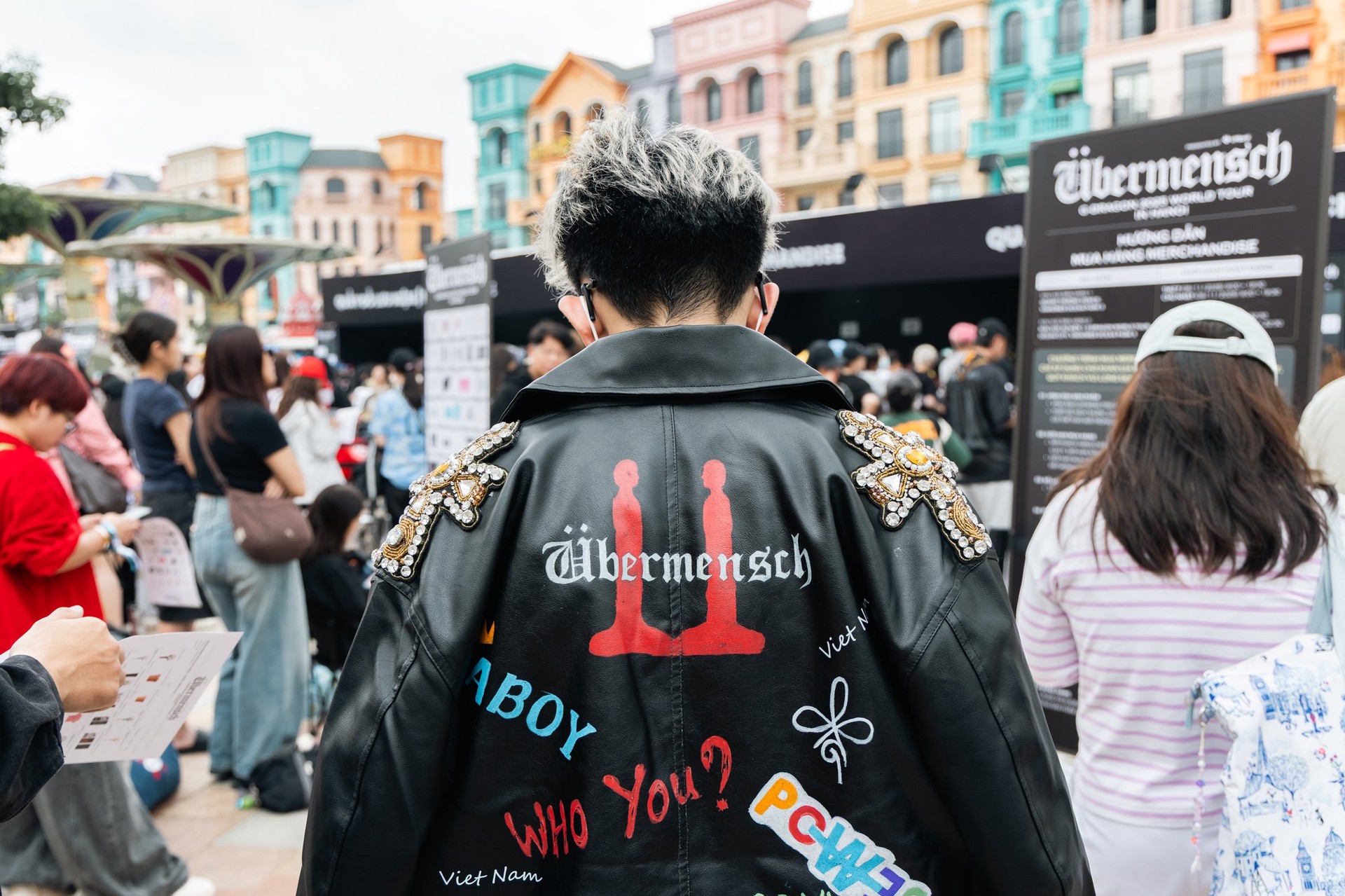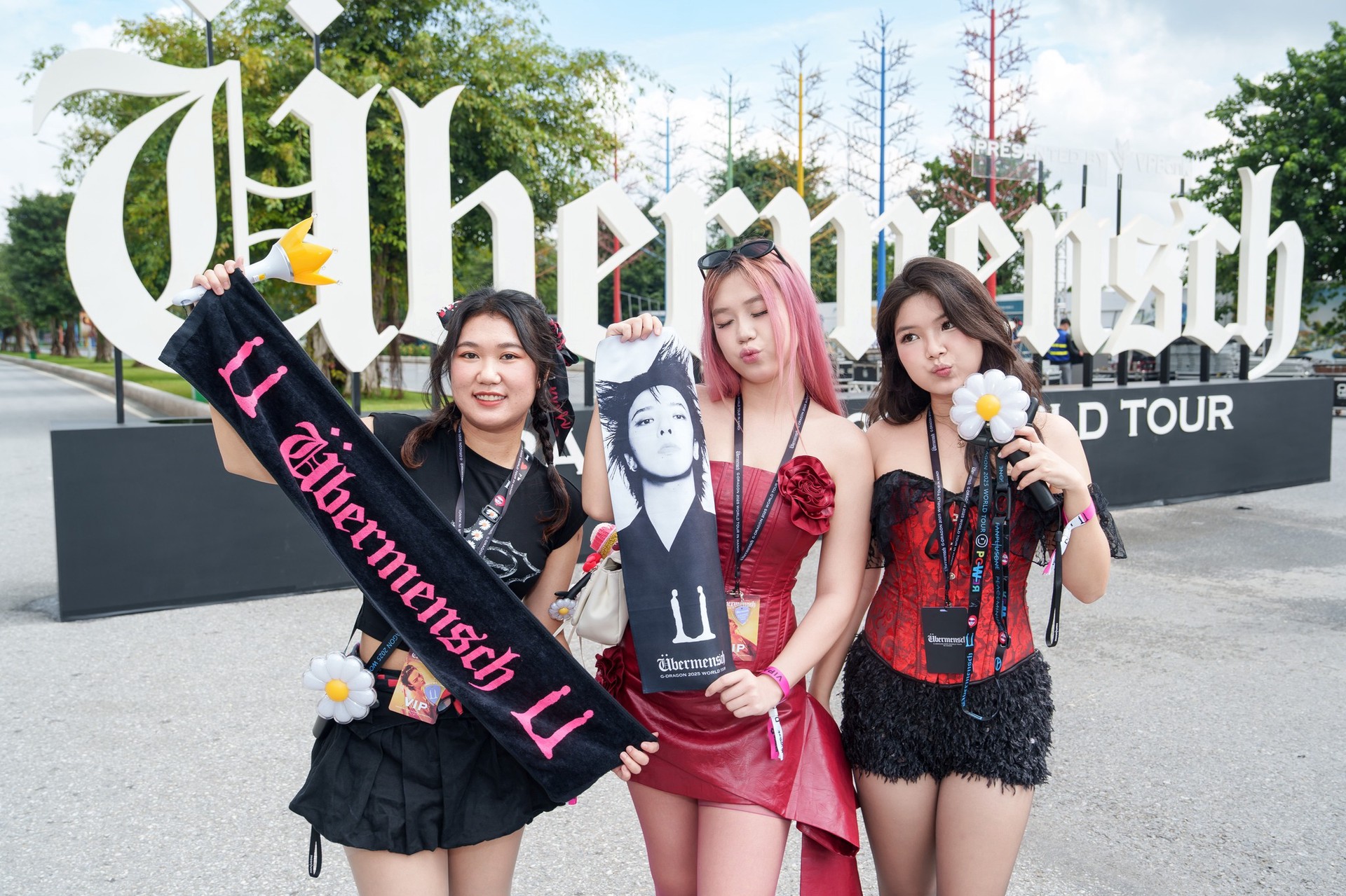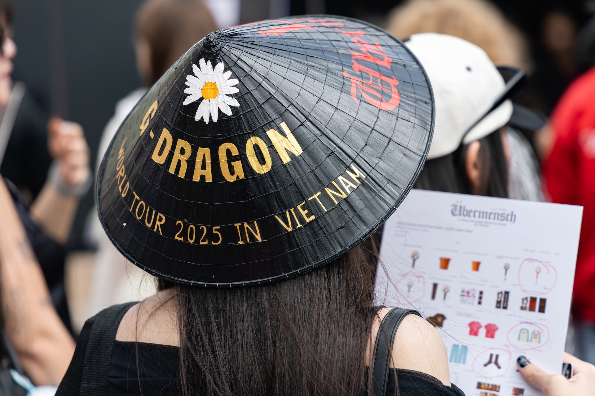 Ở concert của G-Dragon, mặc đẹp là chưa đủ. Mặc độc là bắt buộc. Và mặc để kể một câu chuyện cá nhân là điều tối thiểu. Nhiều fan đã không chỉ “phối đồ” mà tự tạo ra trang phục của riêng mình. Một chiếc áo denim được vẽ tay hình G-Dragon kèm vô vàn ký hiệu logo album và lyrics. Một chiếc nón lá được decor logo concert và G-Dragon bằng màu đỏ và vàng. Một chiếc túi vải tote in bằng decal thủ công. Khi biết thời tiết sẽ mưa, các fan rủ nhau vẽ trang trí chiếc áo mưa với logo hoa cúc và Übermensch tràn ngập trên Threads và TikTok. Tất cả không mua từ cửa hàng in sẵn, mà được “đắp lên” bằng thời gian, công sức và cảm xúc cá nhân.