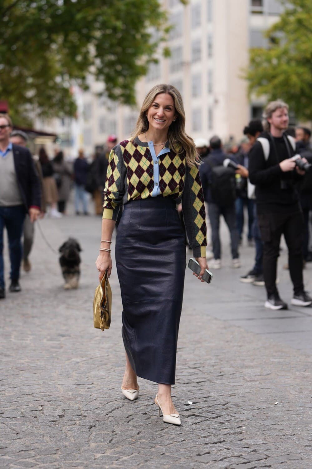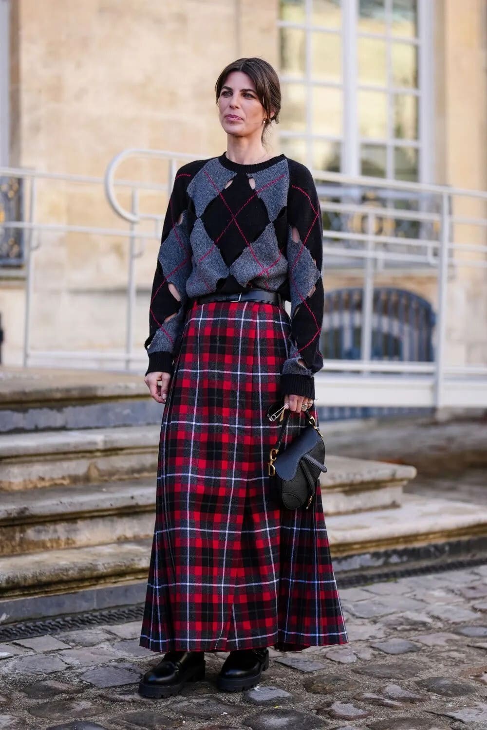 Đây là công thức dành cho những ai yêu nét mềm mại. Cardigan argyle dáng crop hoặc oversize khi kết hợp với chân váy xếp ly, váy bút chì hoặc váy midi sẽ tạo cảm giác dịu dàng, gợi nhớ phong thái nữ sinh Paris thập niên 60.