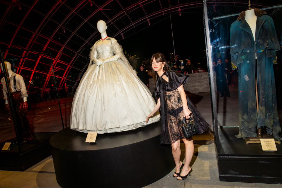 Hawley cũng chia sẻ biểu tượng gia tộc Frankenstein được kết hợp vào chất liệu của chiếc váy. Chi tiết Hawley yêu thích nhất ở thiết kế này chính là chuyển động mềm mại như mơ của lớp vải trên màn ảnh. “Chúng tôi đã sử dụng loại lụa mỏng nhất và Mia liên tục chạy ra chạy vào cầu thang nên trông thật tuyệt vời. Vẻ ngoài cũng có chút gì đó giống Biba, một chút mơ mộng của thập niên 60 và điều đó được tôn lên nhờ phần trang điểm tinh xảo của Jordan Samuel cùng mái tóc dài thướt tha do Cliona Furey thực hiện.”