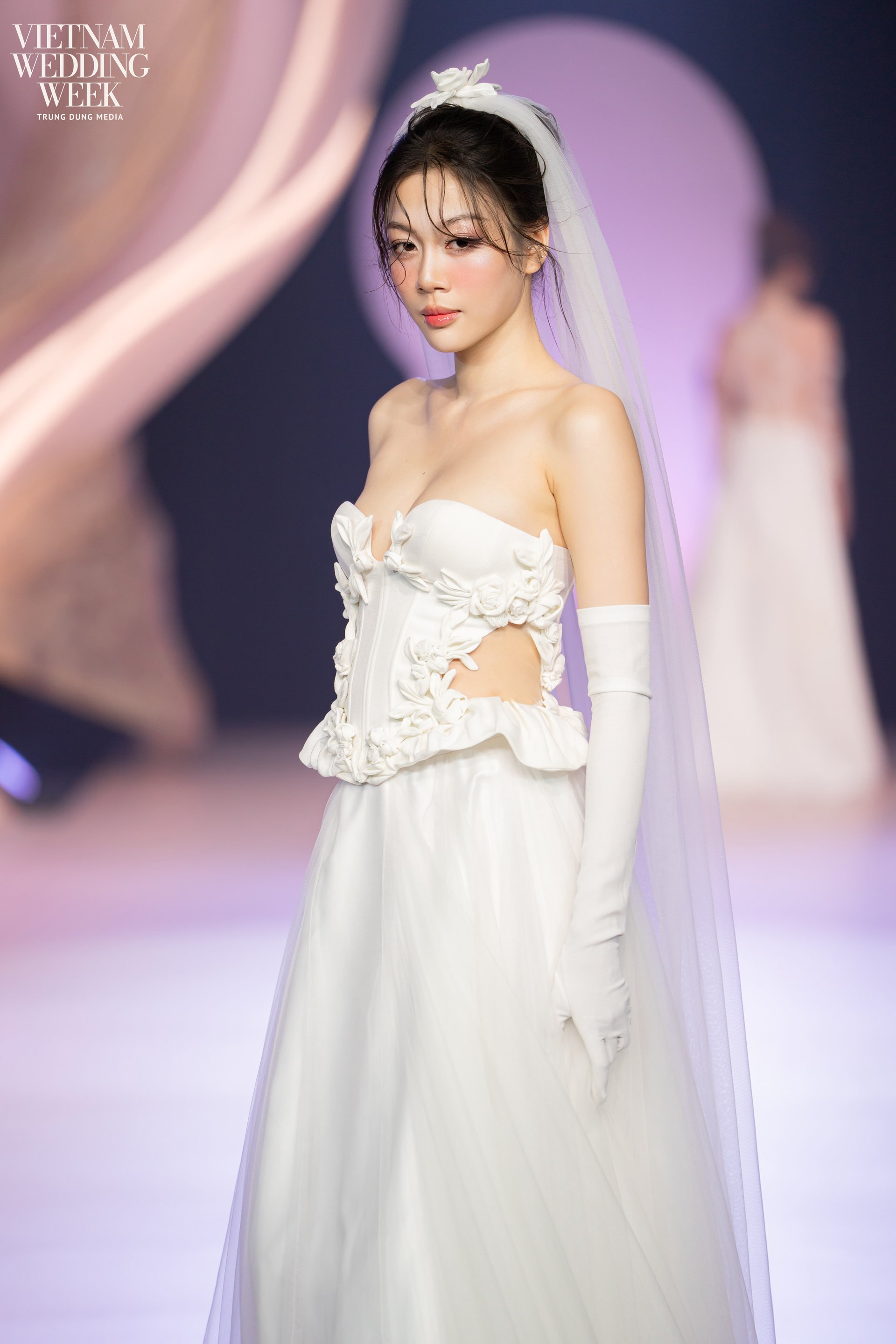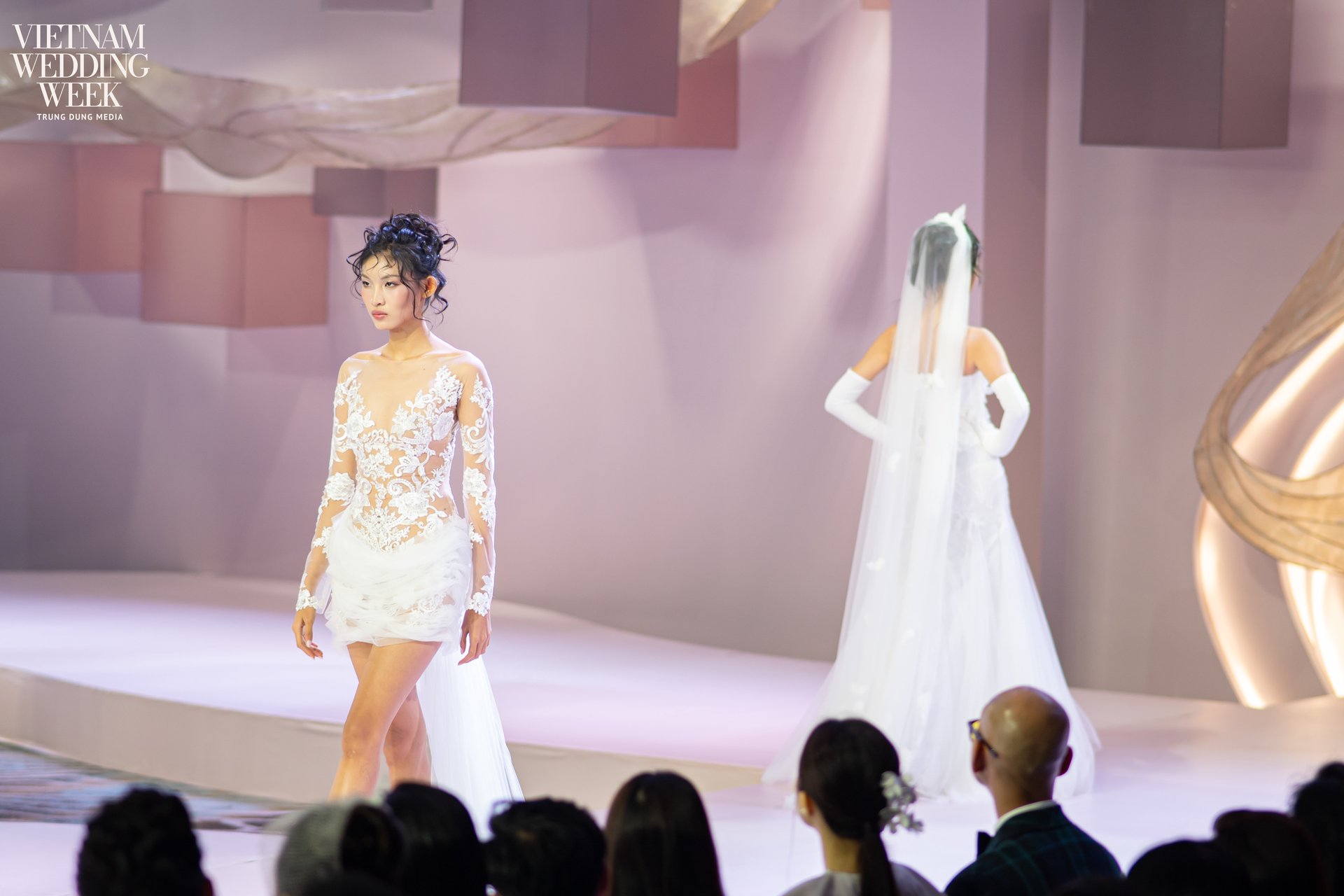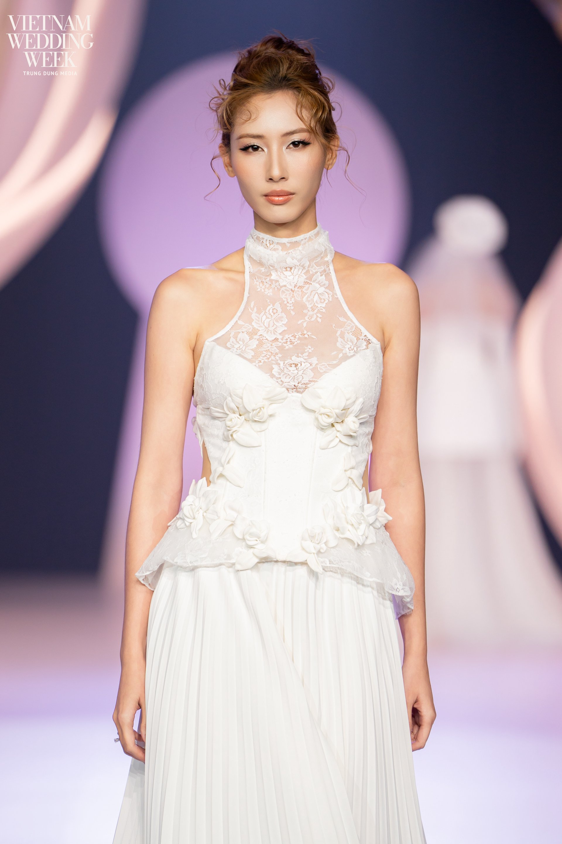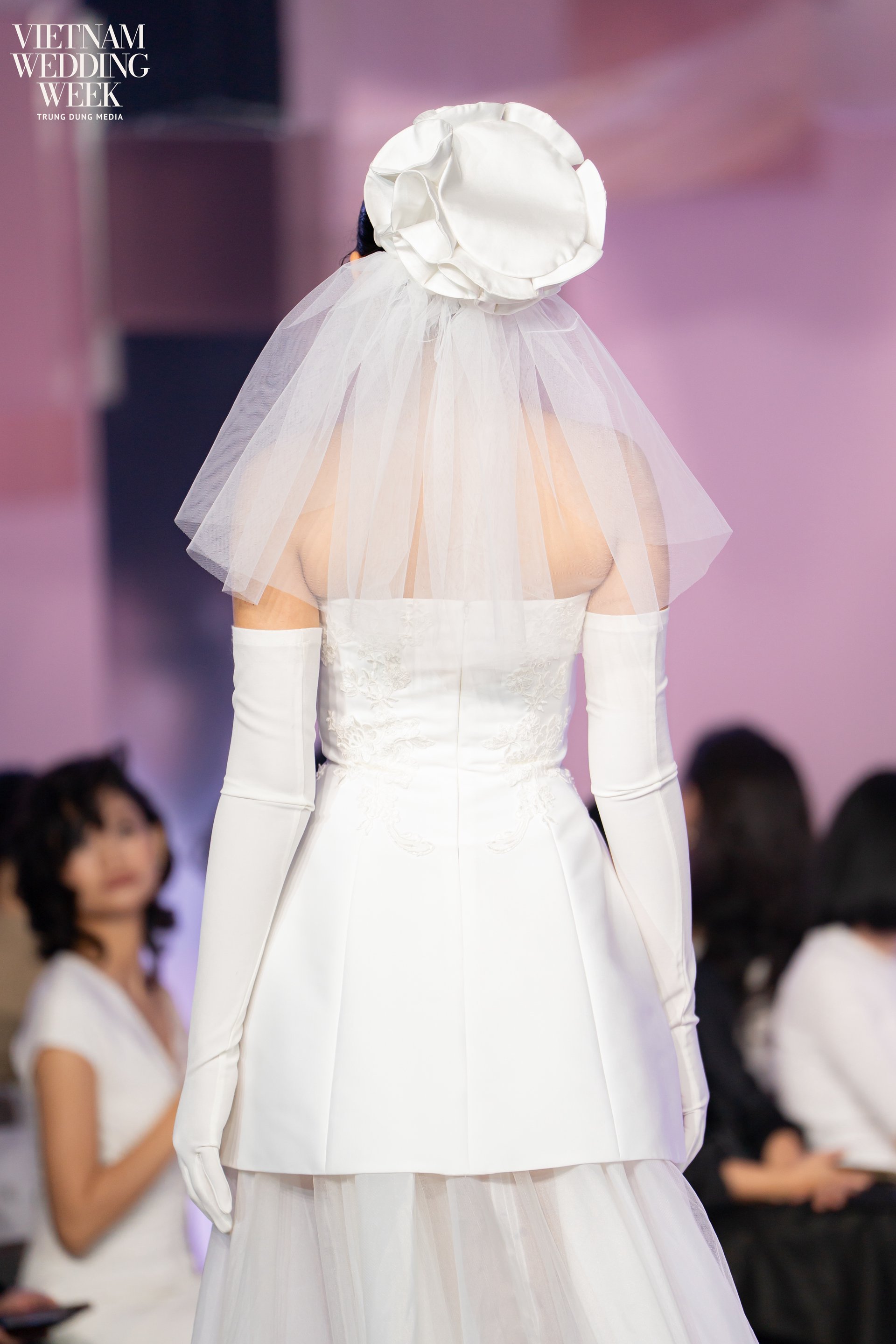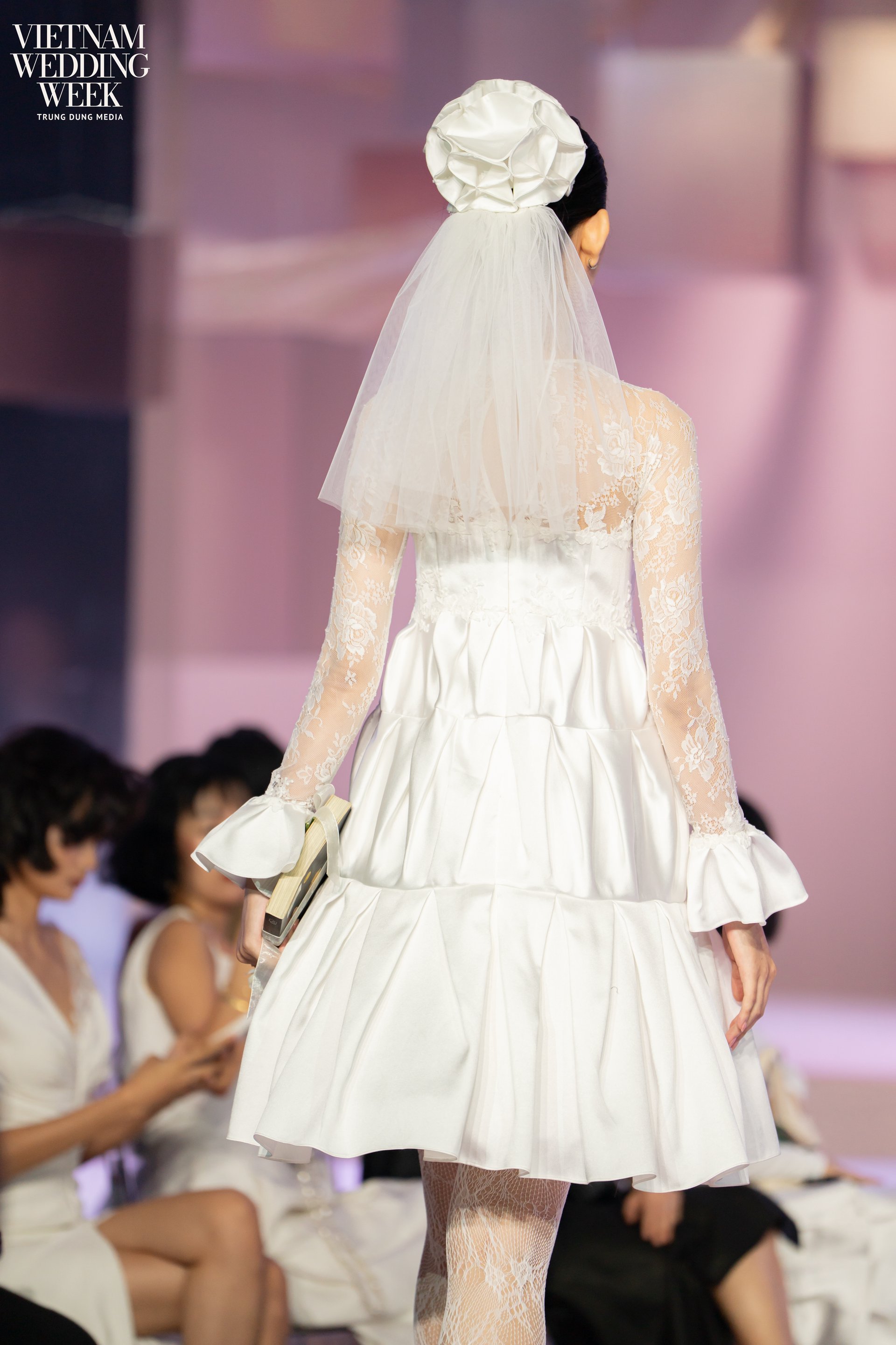 Nhìn gần, những chi tiết nếp gấp tạo thành khối hình học, hay chi tiết bèo nhún trên corset hoà quyện giữa tính trang trí và cách xử lý khối. Điểm nhấn của BST là chất liệu xuyên thấu và ren thêu nổi. Những thiết kế phía sau sân khấu hé lộ phần lưng trần phủ ren hoa, hàng nút nhỏ tinh xảo kéo dài dọc sống lưng. Các chi tiết gợi đến sự tương phản khi phía trước là cấu trúc mạnh mẽ, phía sau lại là sự mềm mại, nữ tính. Sự đối lập này làm BST không bị khô cứng bởi tính kiến trúc, mà vẫn giữ được chất trữ tình vốn có của thời trang cưới.