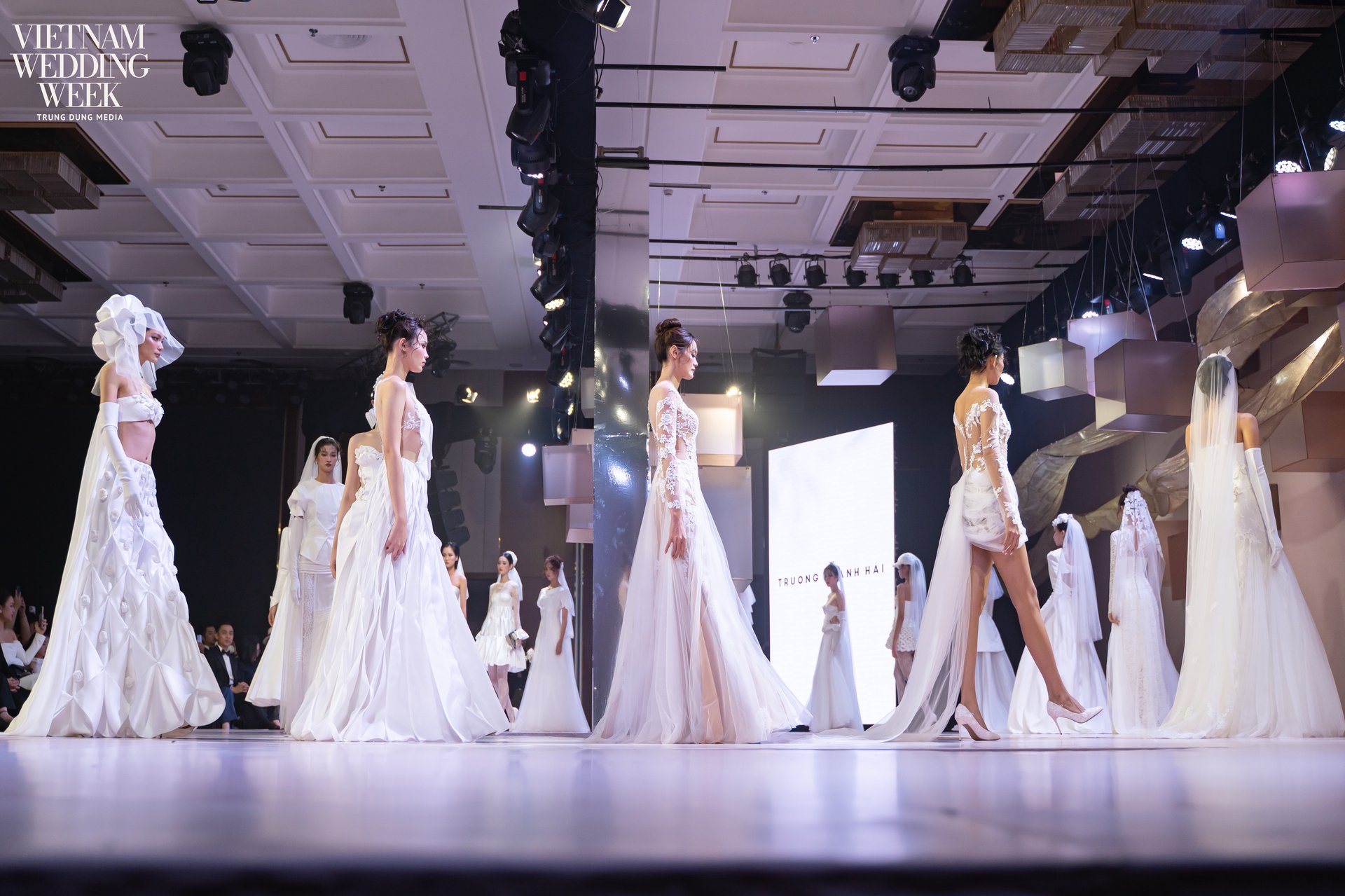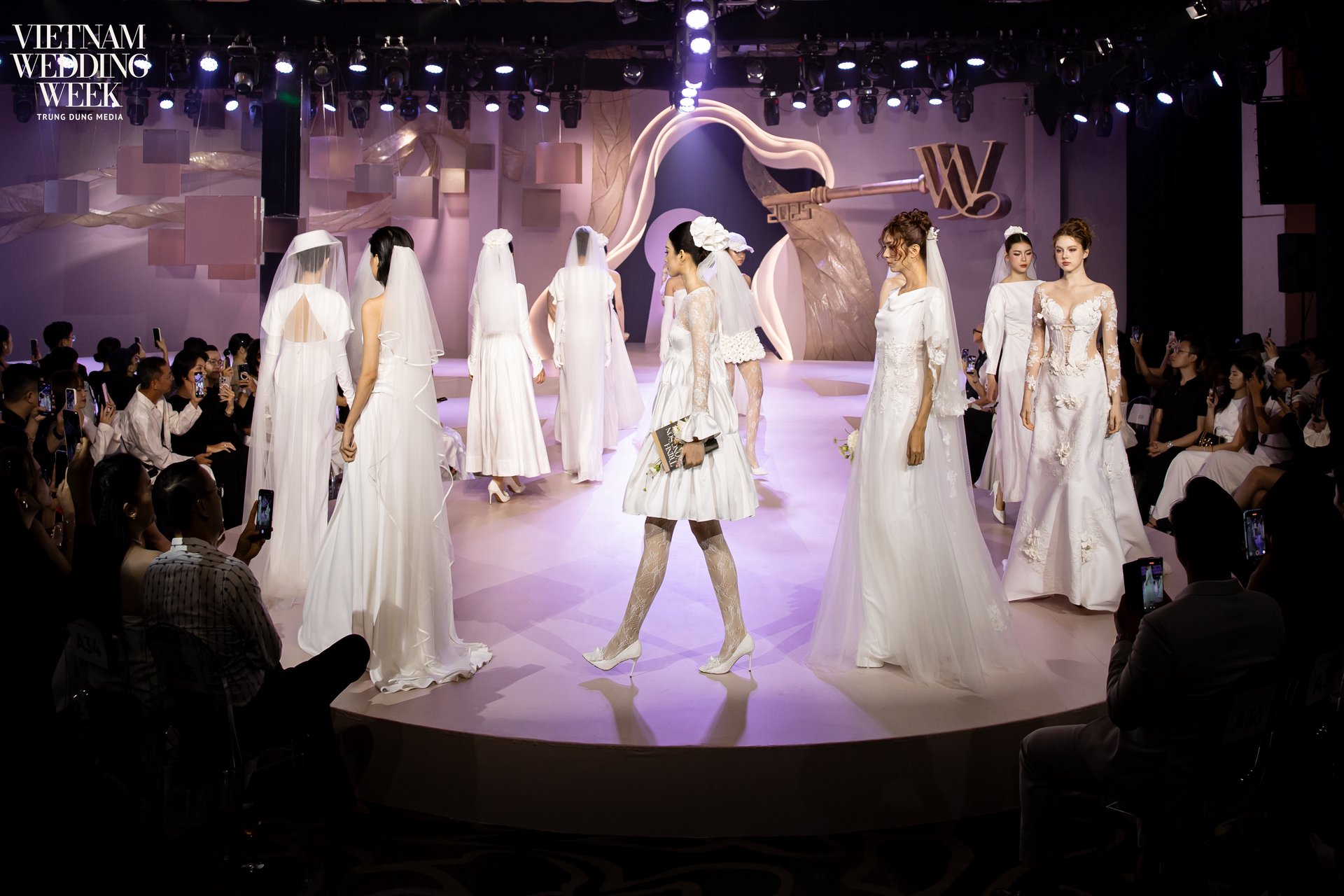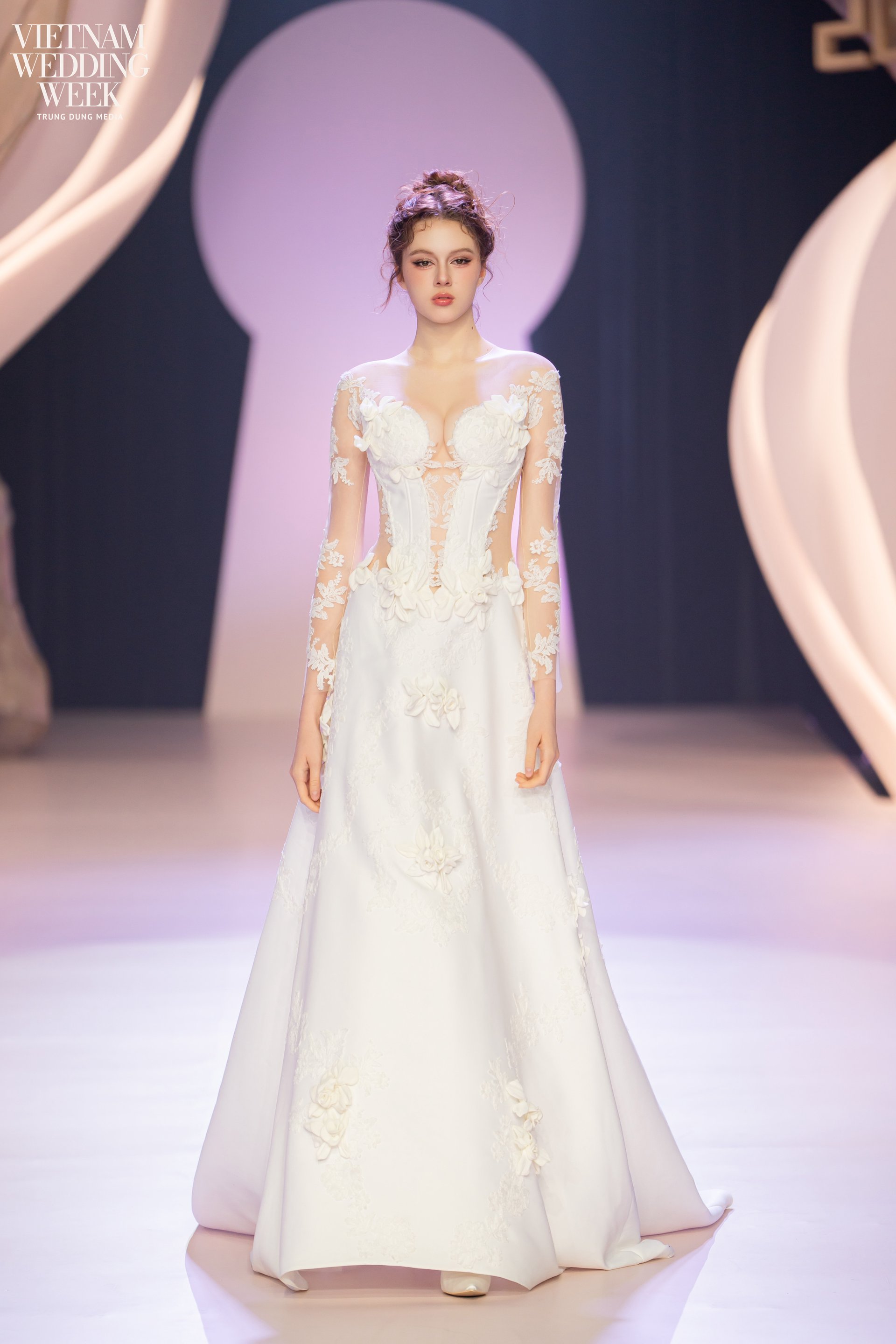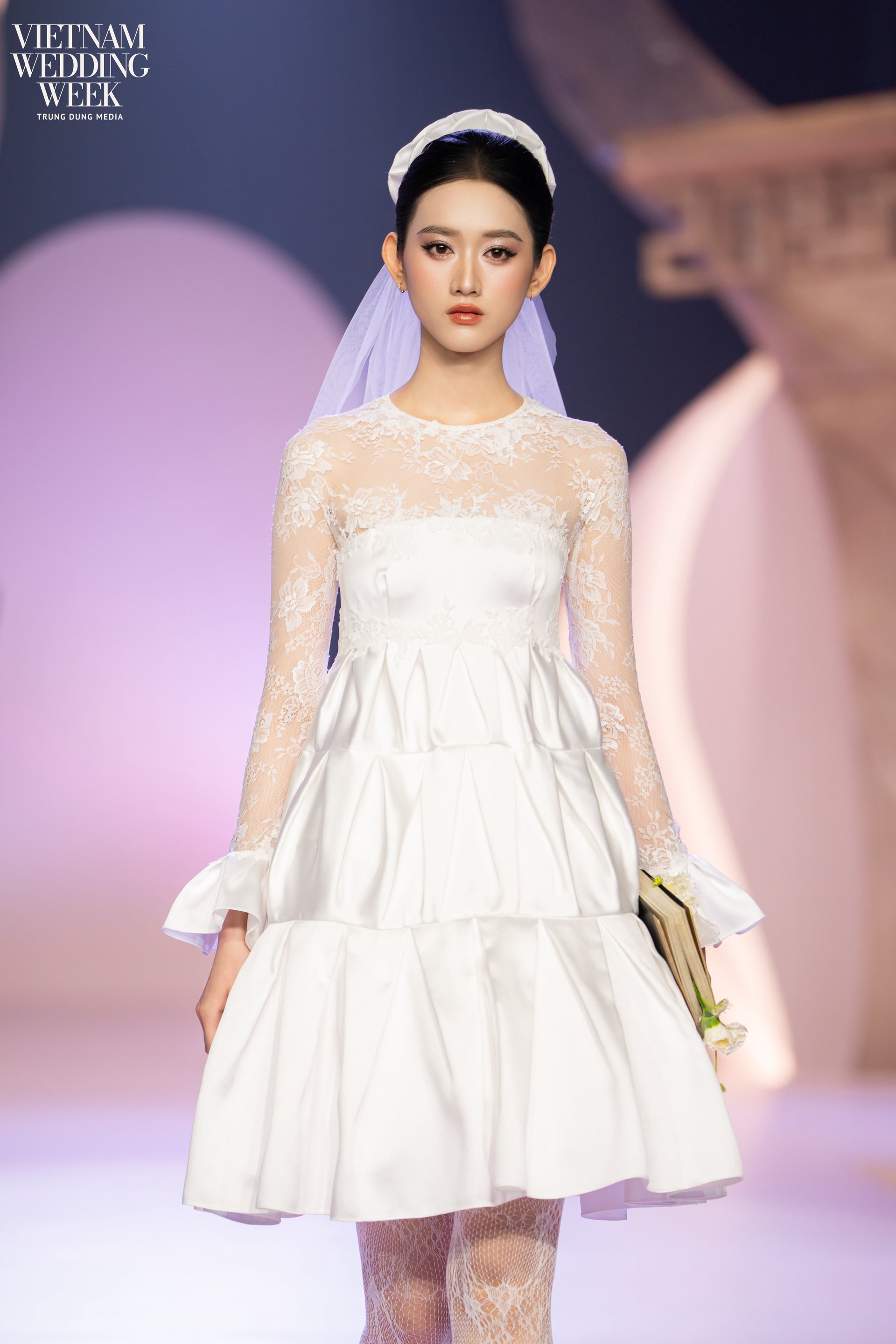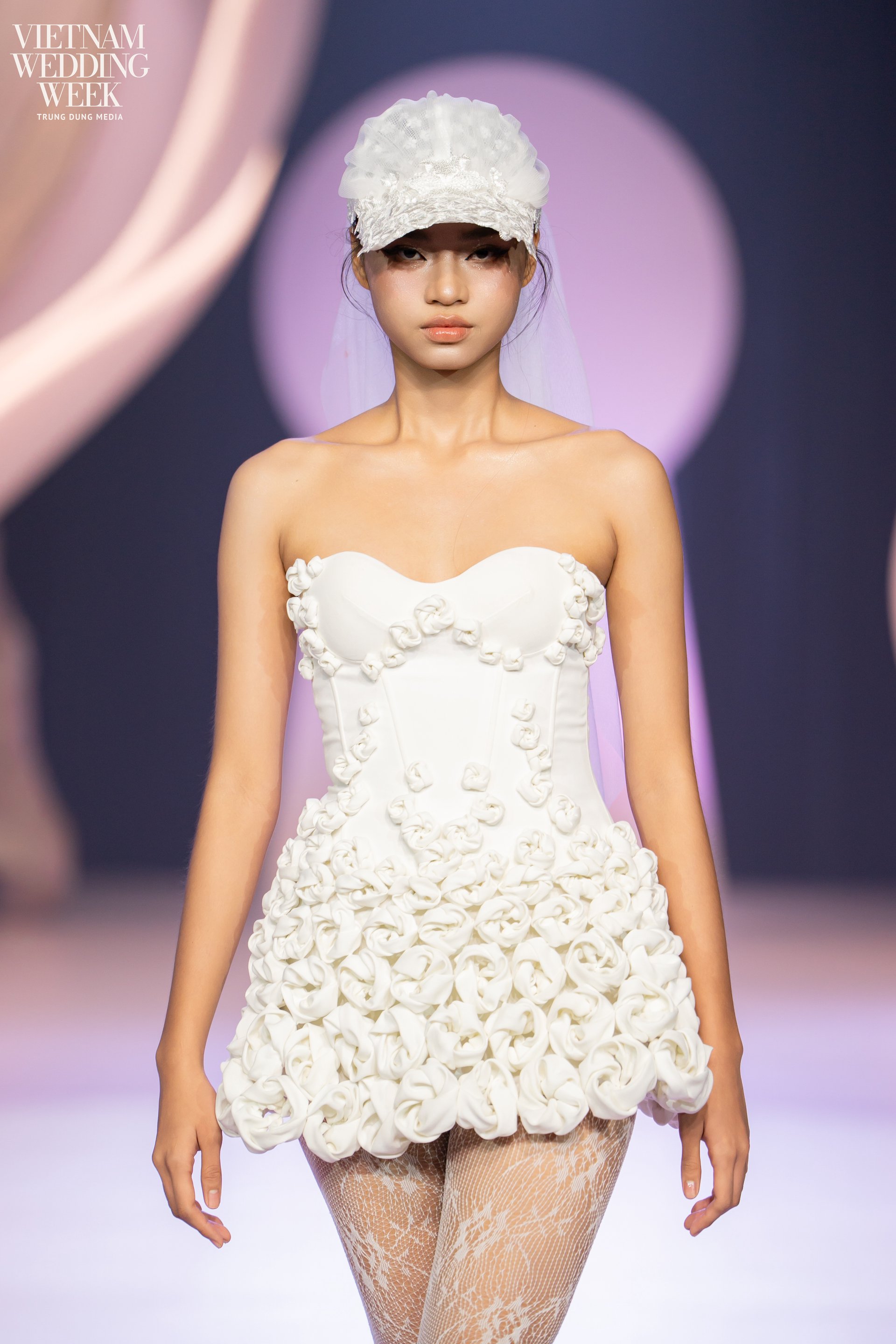 Nhìn gần, những chi tiết nếp gấp tạo thành khối hình học, hay chi tiết bèo nhún trên corset hoà quyện giữa tính trang trí và cách xử lý khối. Điểm nhấn của BST là chất liệu xuyên thấu và ren thêu nổi. Những thiết kế phía sau sân khấu hé lộ phần lưng trần phủ ren hoa, hàng nút nhỏ tinh xảo kéo dài dọc sống lưng. Các chi tiết gợi đến sự tương phản khi phía trước là cấu trúc mạnh mẽ, phía sau lại là sự mềm mại, nữ tính. Sự đối lập này làm BST không bị khô cứng bởi tính kiến trúc, mà vẫn giữ được chất trữ tình vốn có của thời trang cưới.
