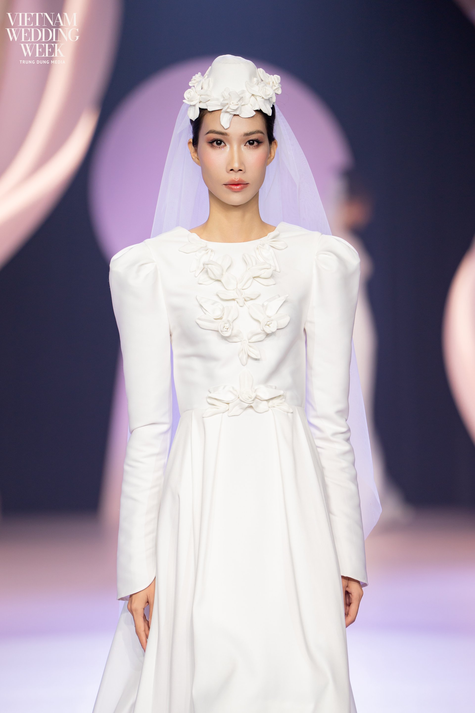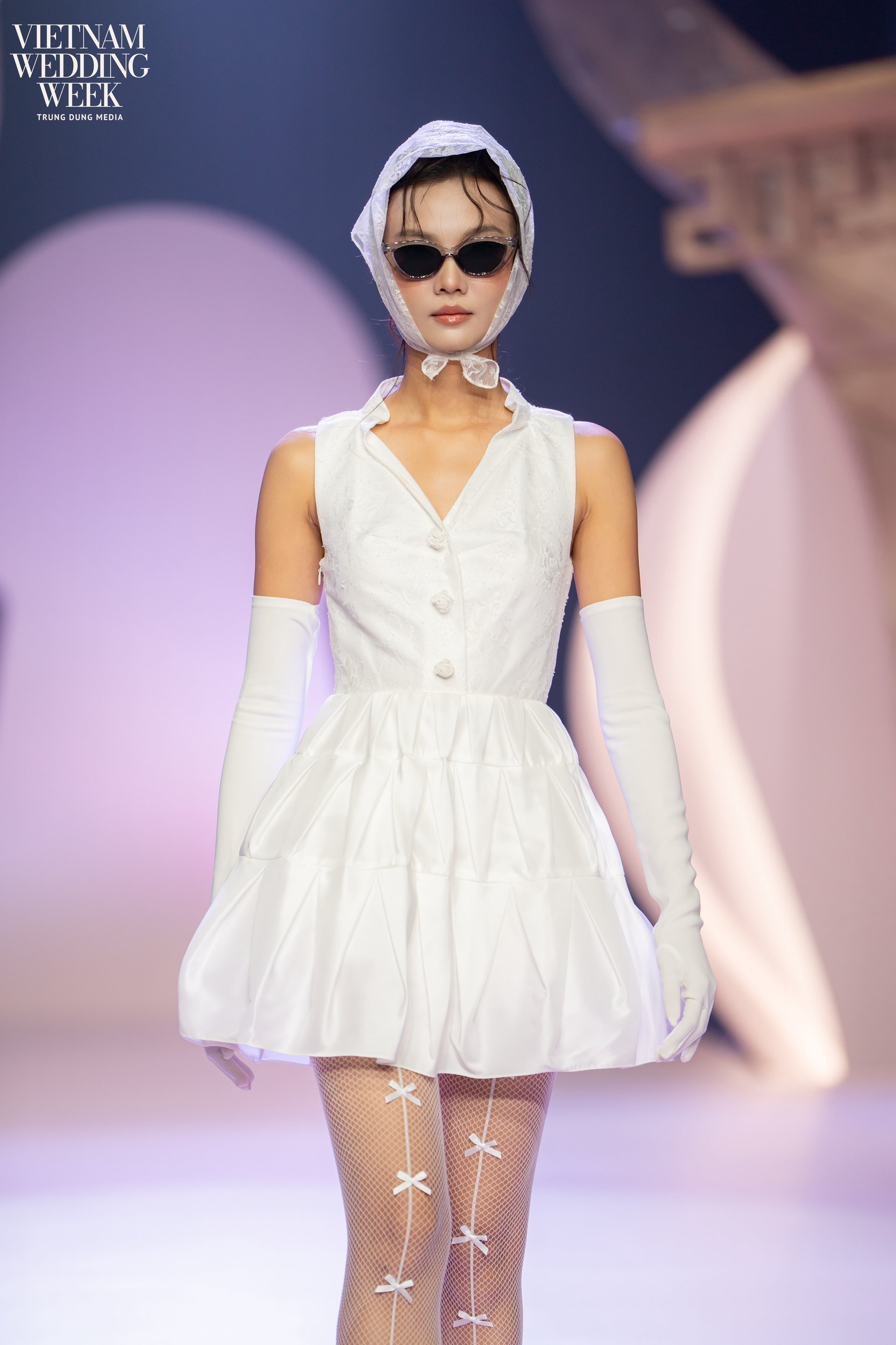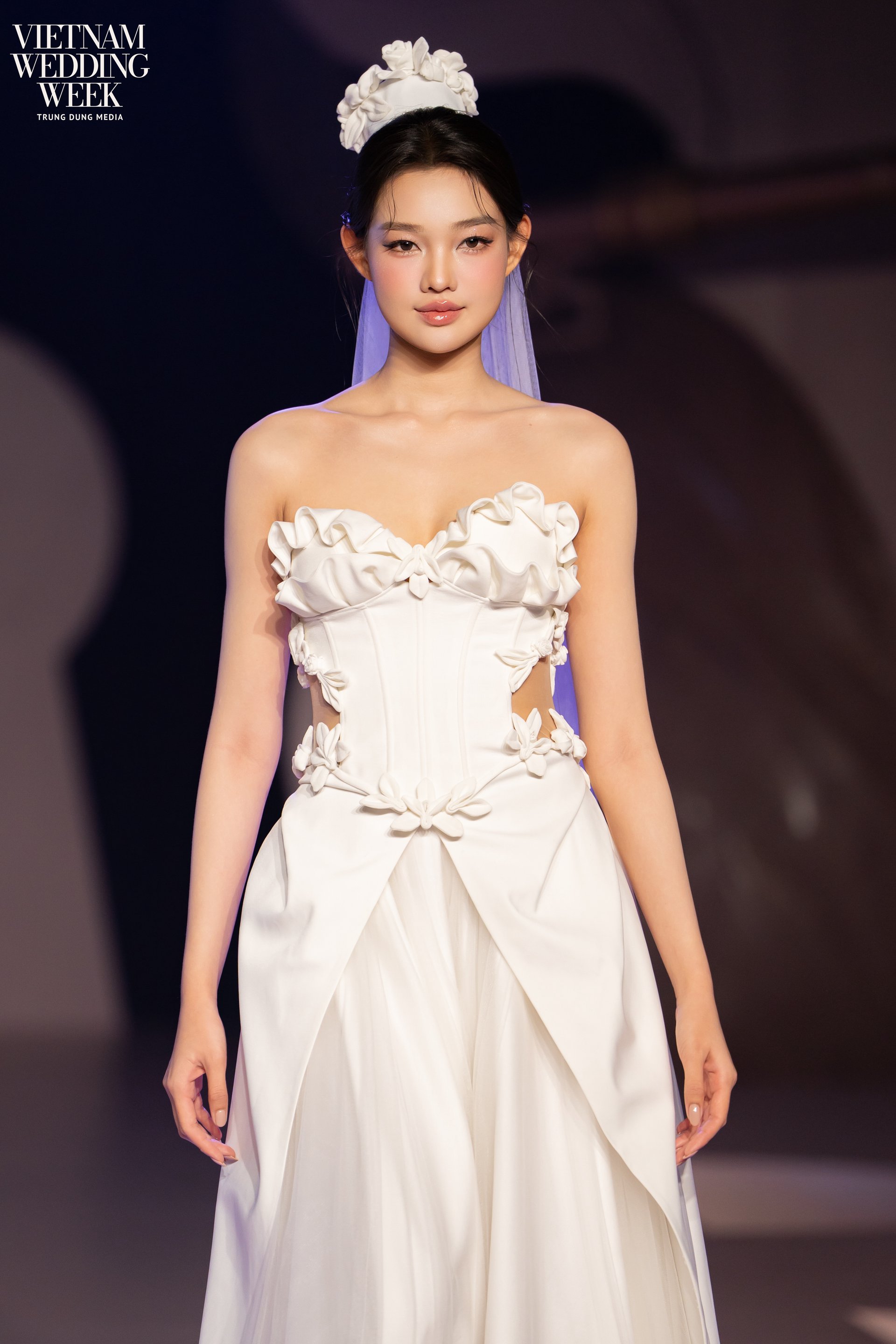 Khởi nguyên ý tưởng từ hình ảnh nhà thờ Kollegienkirche (Salzburg, Áo), “Mono Echo” tìm đến vẻ uy nghi của dòng nhạc baroque để chuyển hóa vào trang phục cưới. Các kỹ thuật couture – smocking, pleating, hoa văn nổi bằng vải, dựng form 3D được NTK khai thác trên nền trắng đơn sắc. Trên sàn diễn, dải váy cưới lần lượt xuất hiện như những “khối điêu khắc di động” với thiết kế đầm corset ôm sát nhưng kết thúc bằng những nếp gấp phóng khoáng; tùng váy nhiều tầng vải với hiệu ứng ánh sáng làm nổi bật nhịp điệu xếp lớp; hay dáng váy suông dài được nhấn bằng đường cắt gọn gàng nhưng vẫn mang tới vẻ uy nghi.