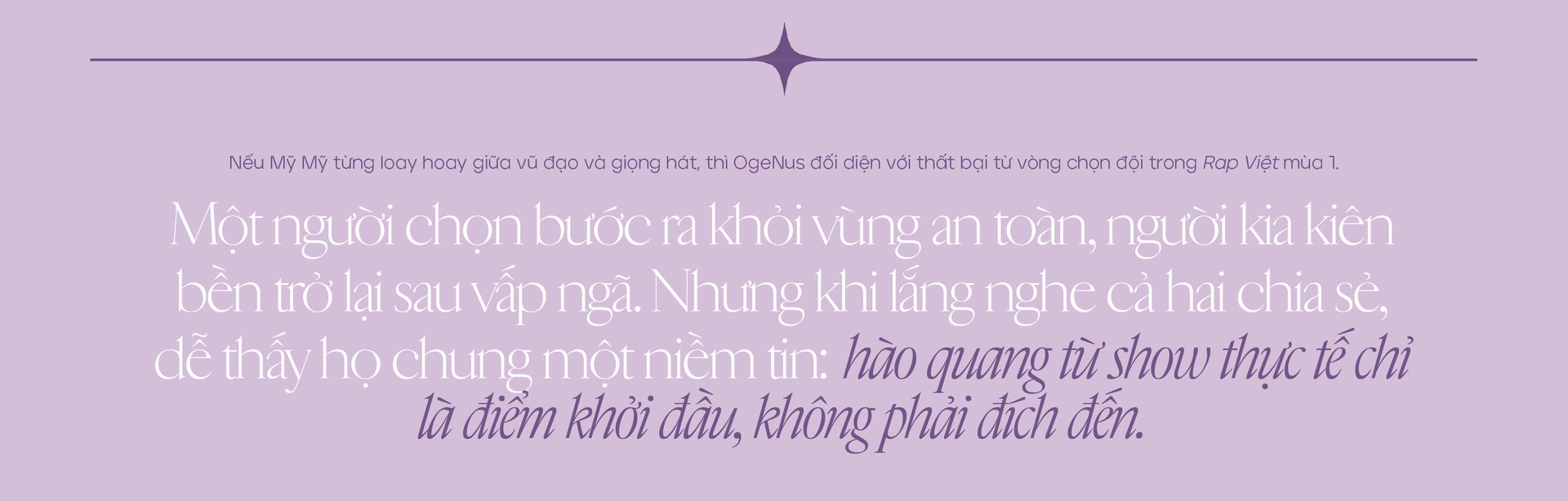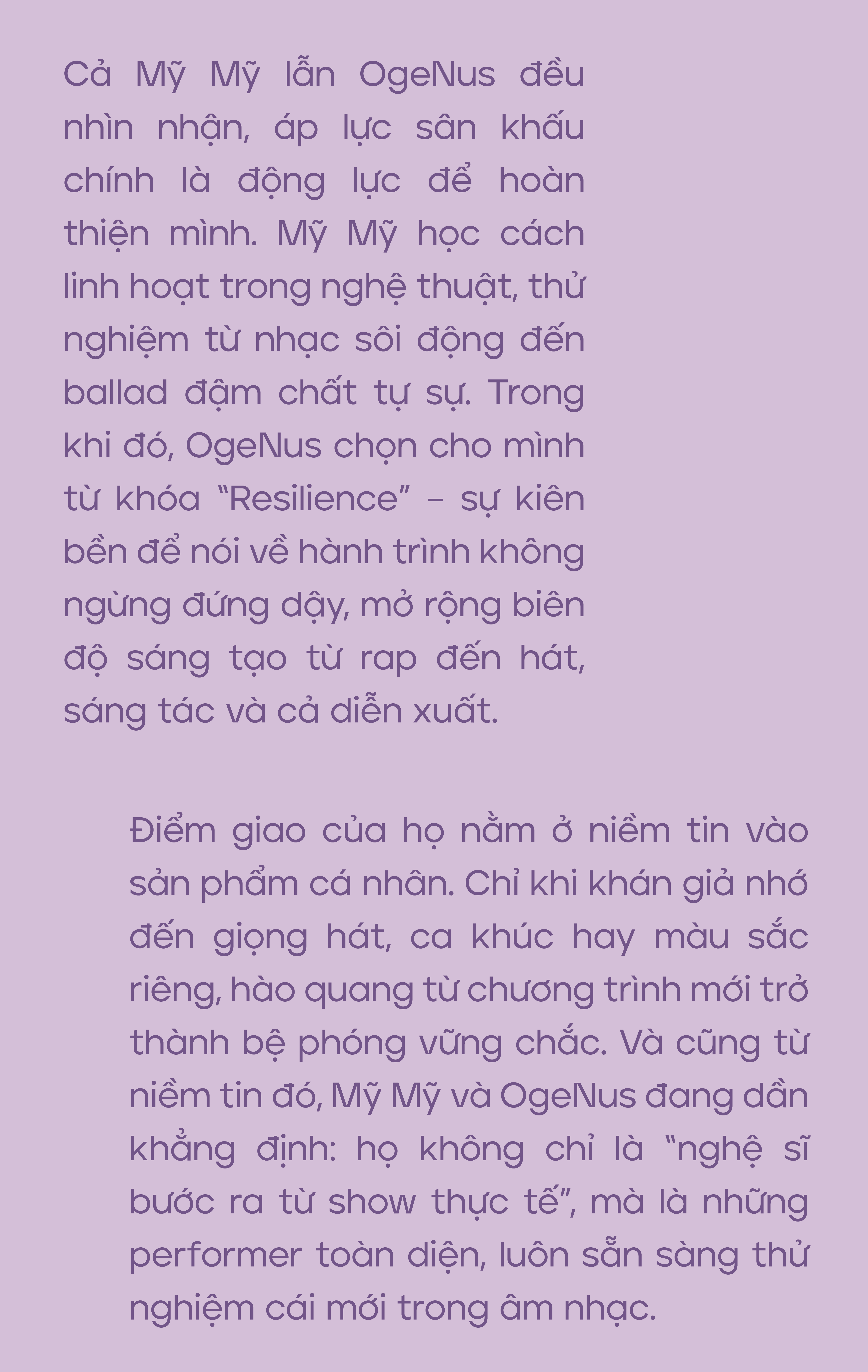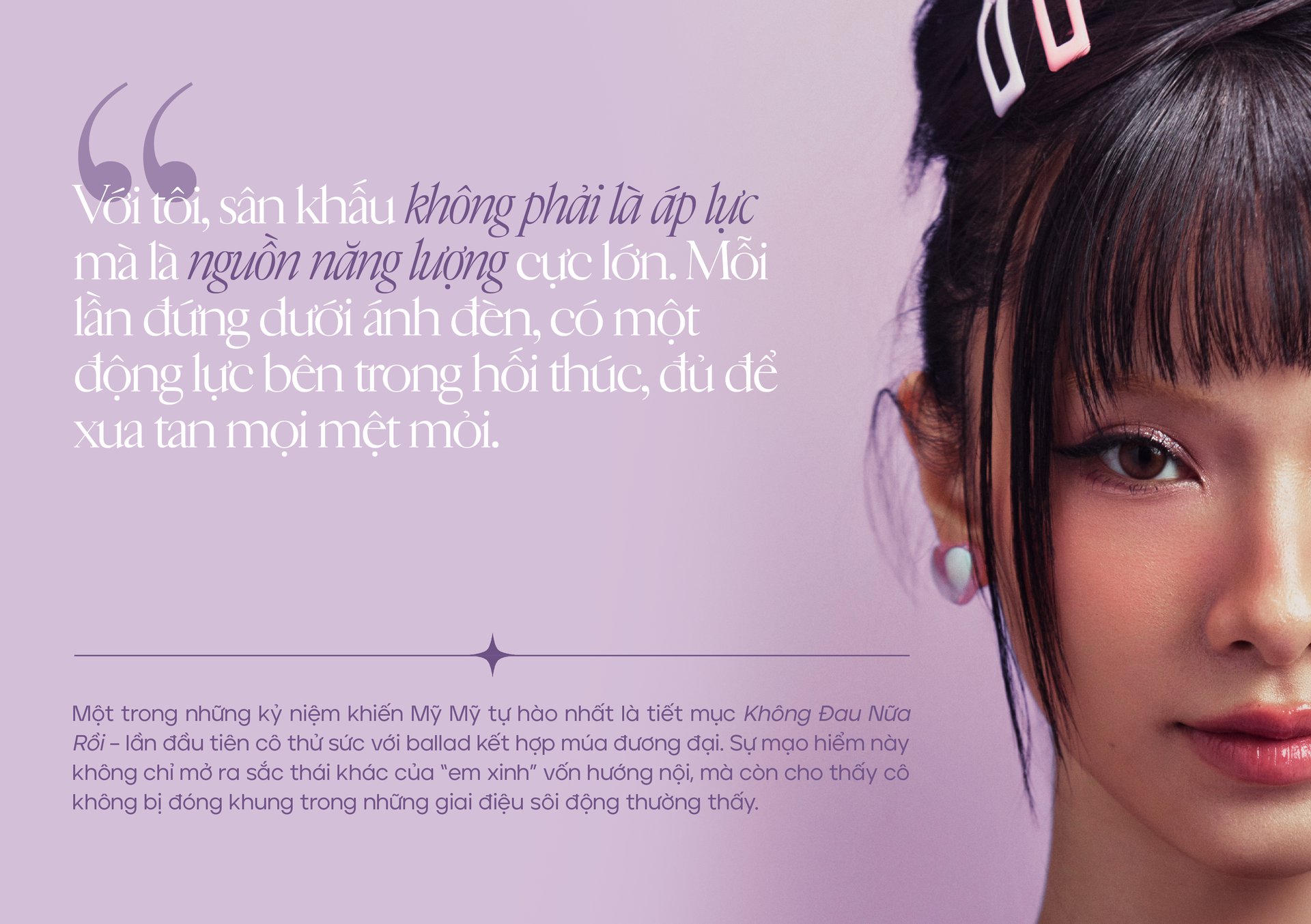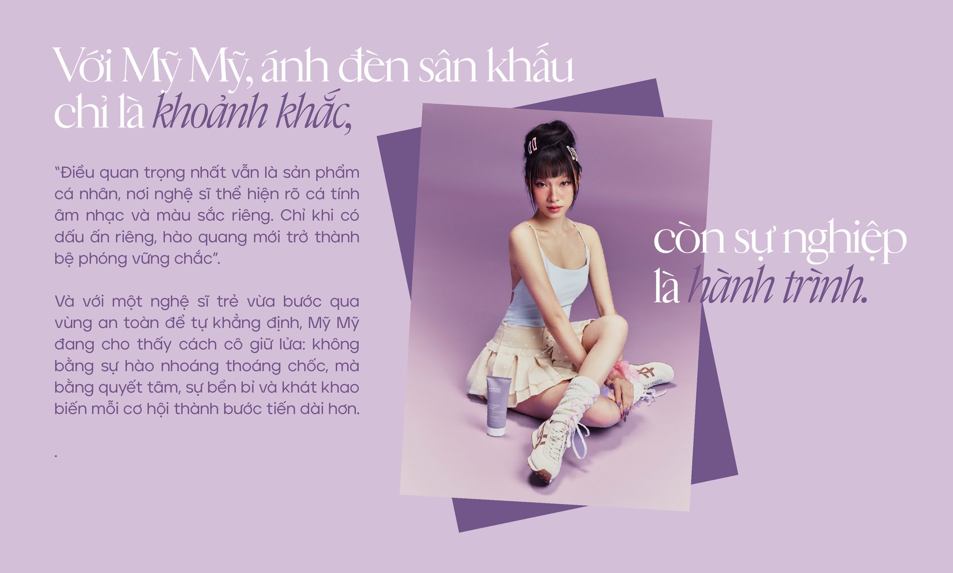 Trước khi được khán giả biết đến qua chương trình Em Xinh “Say Hi”, Mỹ Mỹ từng là dancer của Vũ Đoàn Bước Nhảy. Cô vốn yêu âm nhạc từ nhỏ nhưng sự rụt rè khiến cô chỉ dám đứng ở vị trí hỗ trợ phía sau. Khi dịch Covid bùng lên 5 năm trước, những đoạn clip cover ngẫu hứng lại mở ra cho cô một lối đi mới. “Một ngày, sếp gọi tôi lên văn phòng và hỏi: Em có muốn thử sức làm ca sĩ không?” - câu hỏi ấy đã đưa Mỹ Mỹ rời khỏi cái bóng dancer để lần đầu đối diện trực tiếp ánh đèn sân khấu.