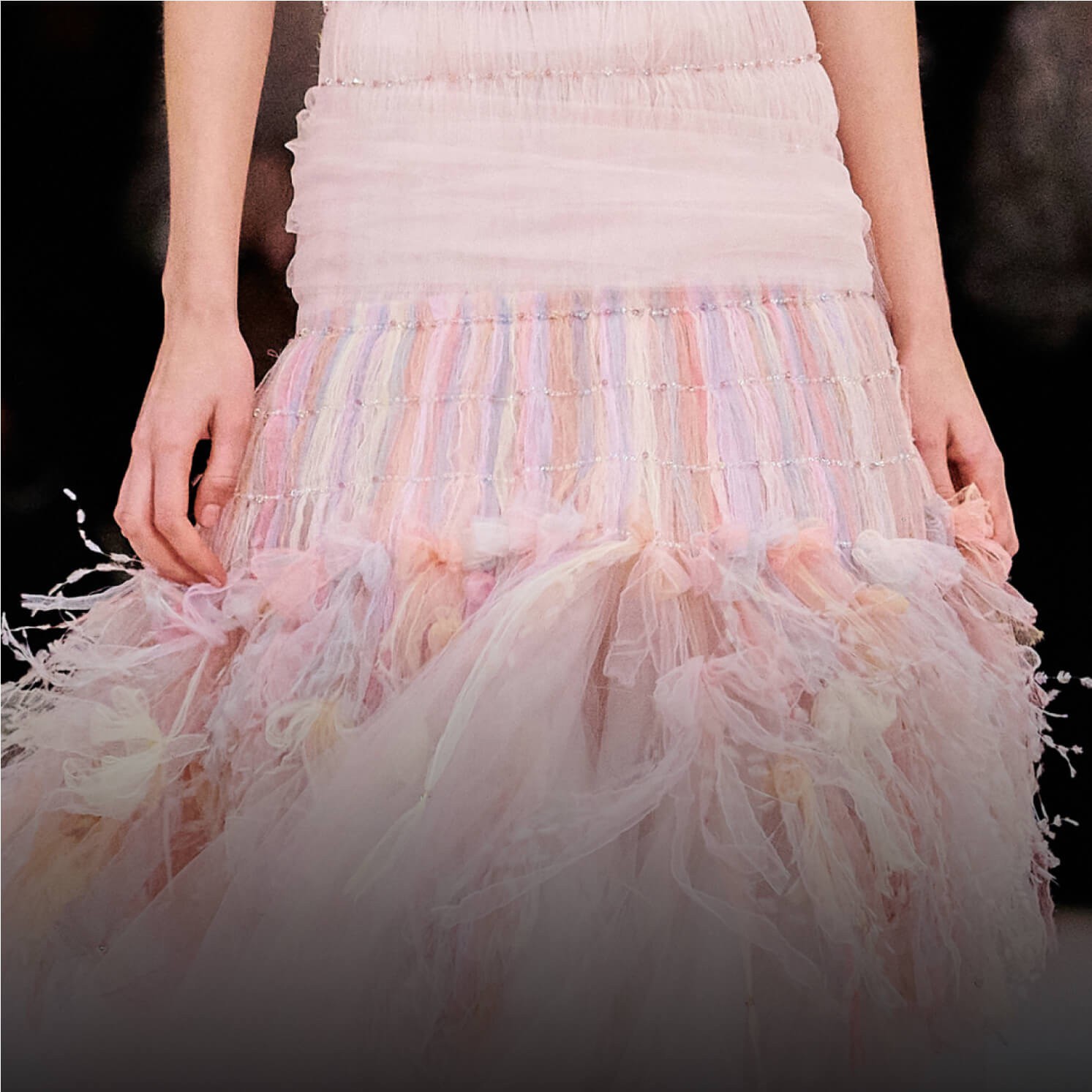 Trong các show Métiers d’Art của CHANEL, Lesage Intérieurs thường đóng góp các panels tweed cấu trúc hoặc chi tiết trang trí vải cao cấp, điển hình như các tấm váy, áo khoác hoặc chi tiết layering mang họa tiết tweed mới mẻ.
