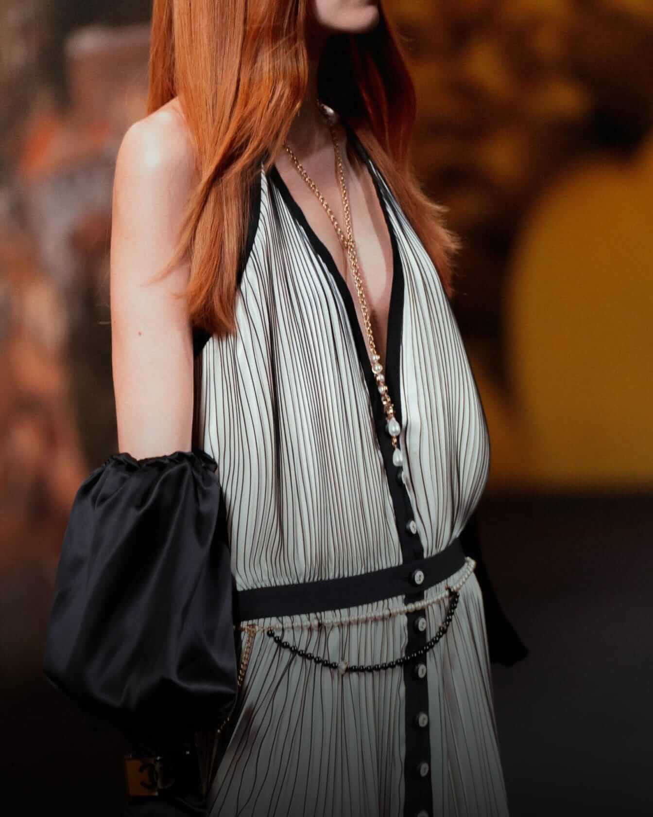 Đó cũng chính là tinh thần được Matthieu Blazy khai triển rõ rệt ở CHANEL Xuân Hè 2026, nơi các dạng tweed “mở” – nhẹ, thoáng, như được giải phóng khỏi độ nặng cổ điển – trở thành chất liệu dẫn dắt. Nhiều look trong mùa này gợi cảm giác về một tweed đang dịch chuyển: thay vì mật độ dệt dày, Lesage mang đến những khoảng trống có chủ ý, nơi sợi kim loại và chỉ cotton đan xen như những dòng sáng, cho phép ánh sáng tự do đi qua.