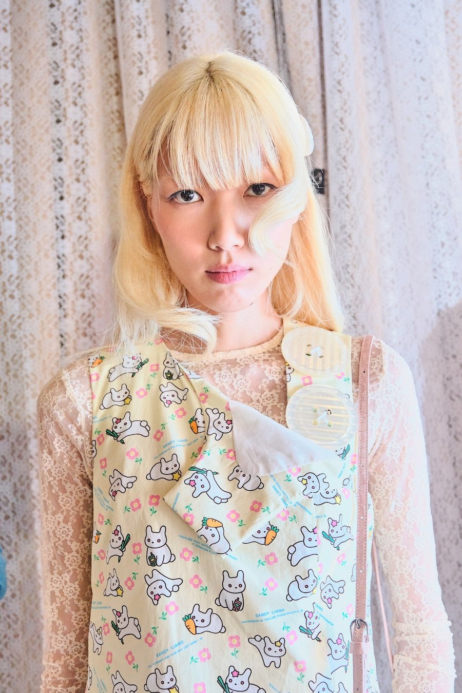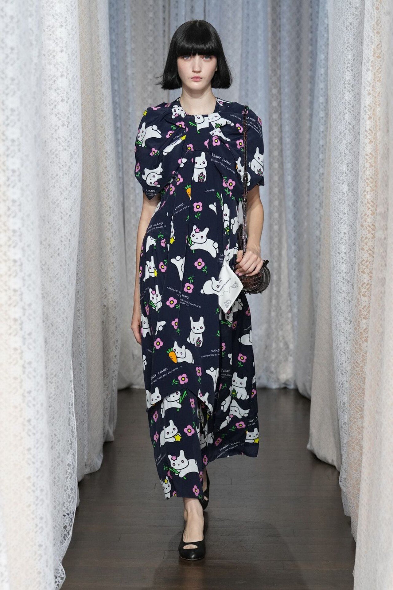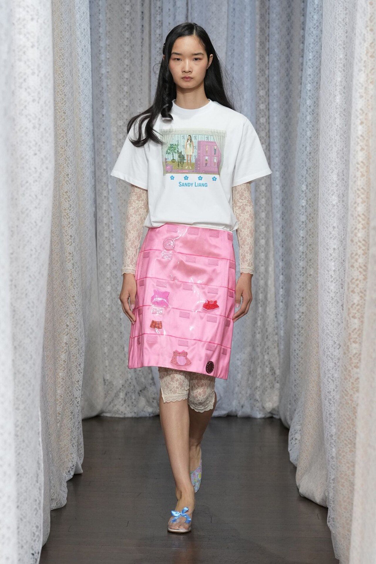 Dưới góc nhìn hóm hỉnh của Sandy Liang, những vật dụng nhỏ bé bỗng trở thành chất liệu kể chuyện. Giày Tabi hóa thân với hình thỏ nhảy múa và hành lá, hay giày ba lê quen thuộc biến thành chiếc ví màu hồng và đen. Những kỷ vật tuổi thơ cũng hiện diện trên sàn diễn một cách duy mỹ. Chẳng hạn, túi PVC trên váy để cất giữ khoảnh khắc xưa, dép nhựa trong suốt phủ kín nhãn dán, cúc áo thất lạc nay lại trở thành một dấu hiệu nhận diện. Ngay cả nhãn chăm sóc quần áo cũng được Liang phóng to thành những chú thích đời thường với câu chữ thân mật. Ẩn mình trong một bộ sưu tập thời trang là những trò chơi thị giác đầy thú vị.