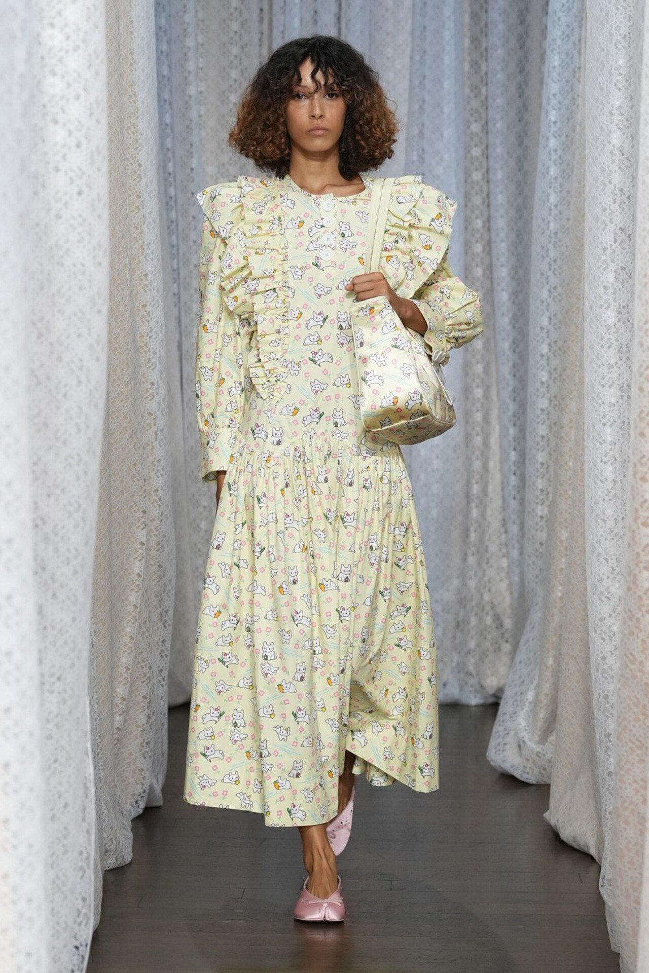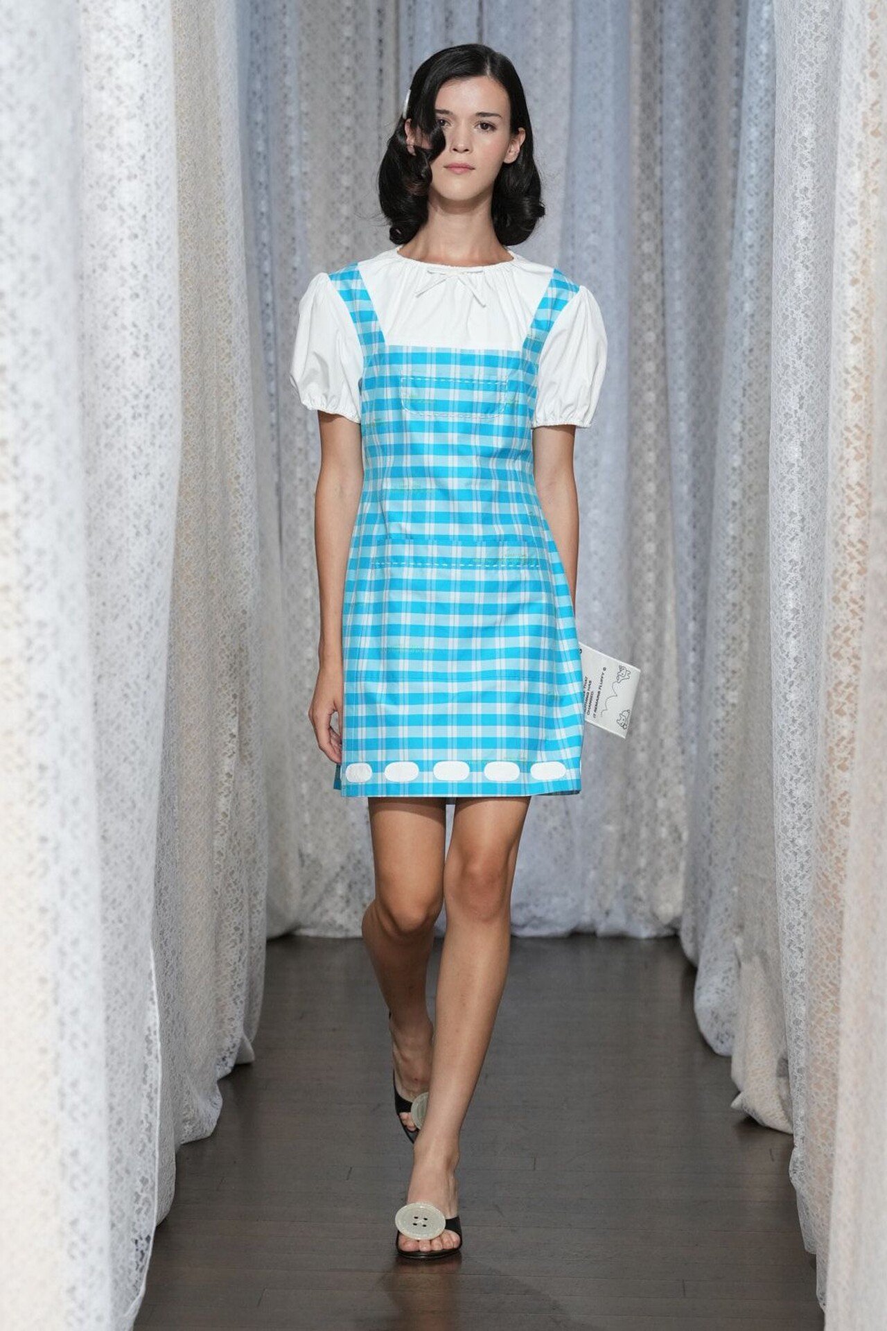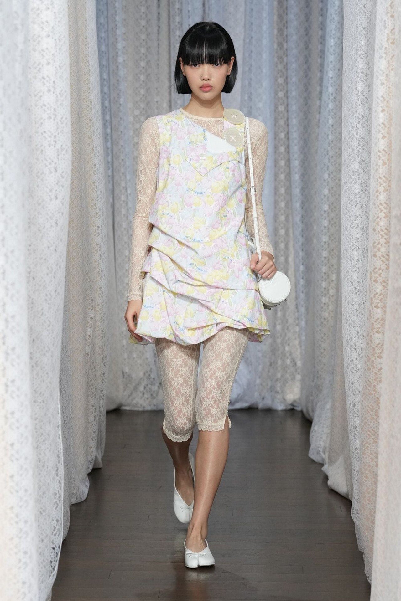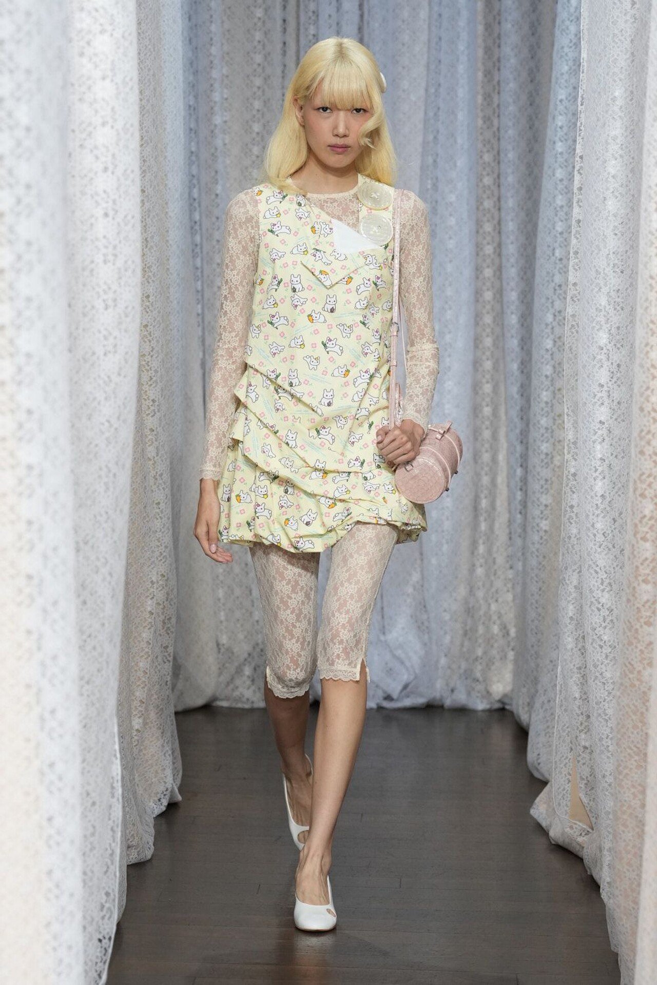 Từ ký ức hoài niệm đến chất liệu sáng tạo, Sandy Liang chuyển dịch tinh thần ngây ngô thành ngôn ngữ thời trang duy mỹ. Đầm búp bê tinh xảo phóng to, váy ngắn in hoạ tiết tối đa, tinh nghịch – phủ dày những món đồ lót chẳng ngại ngùng hoặc những bộ đồ búp bê nhỏ nhắn. Lấy cảm hứng từ lớp ren quen thuộc trong những ngôi nhà búp bê, nhà thiết kế khai thác kỹ thuật này xuyên suốt, nổi bật là chiếc váy ren gắn dải ruy băng xanh lam, gợi hình một tấm rèm cửa nhỏ bé được khéo buộc lại. Trong khi, chân váy gingham xanh sáng phối cùng áo ngực và áo khoác cổ tròn gợi nhớ đến thế giới mộng mơ của Arrietty trong Studio Ghibli. Bảng màu tươi tắn cũng là một “cú gật đầu” khác của Sandy Liang về nguồn cảm hứng về những món đồ chơi trẻ nhỏ.