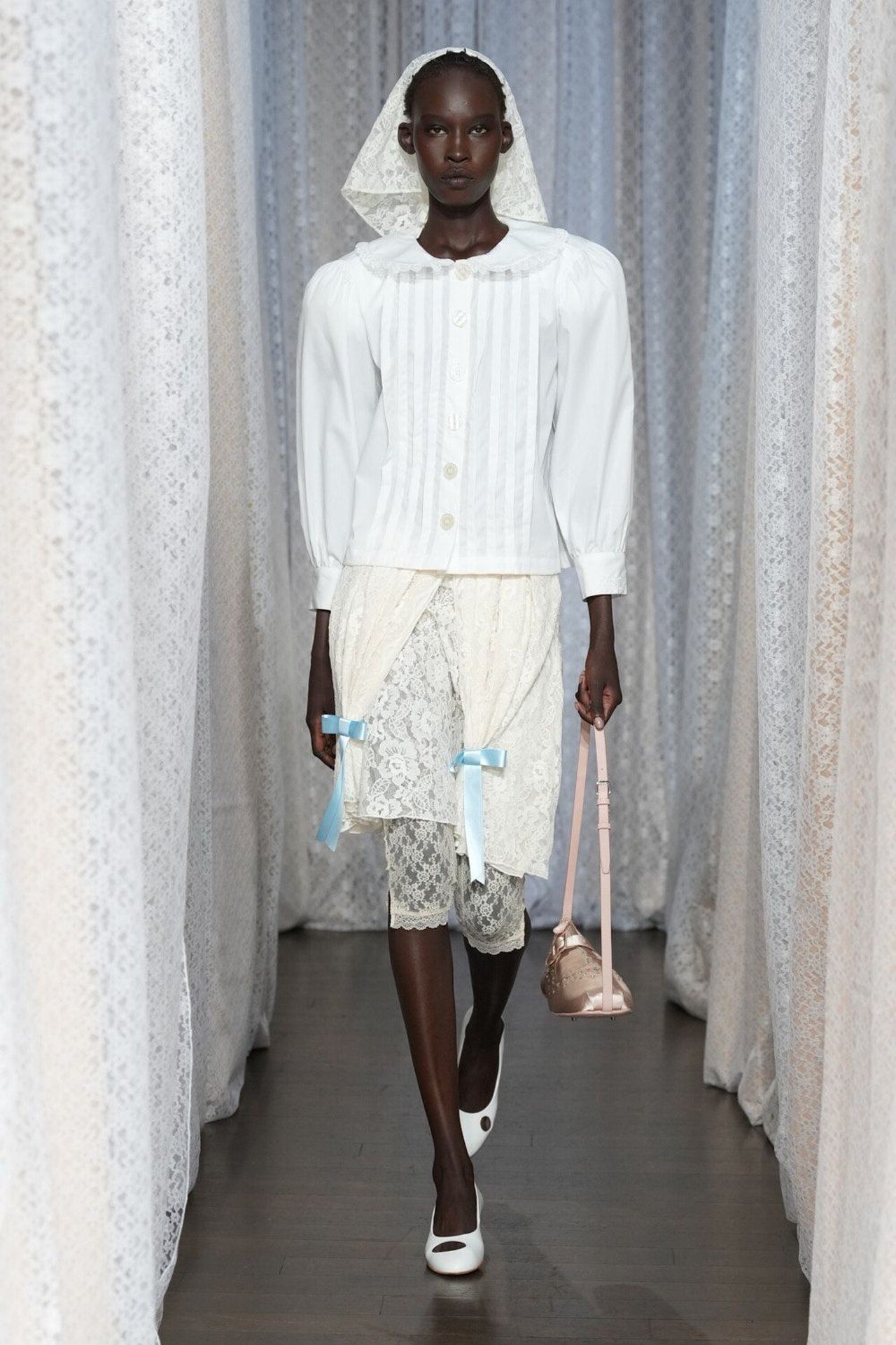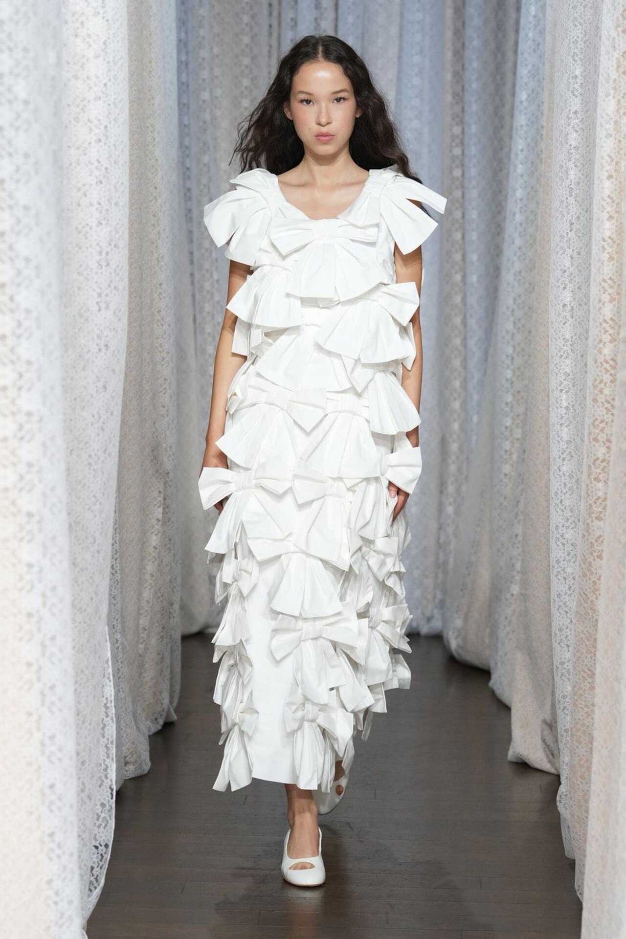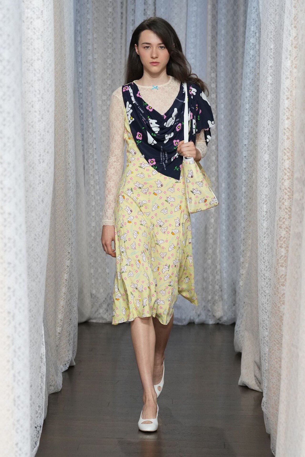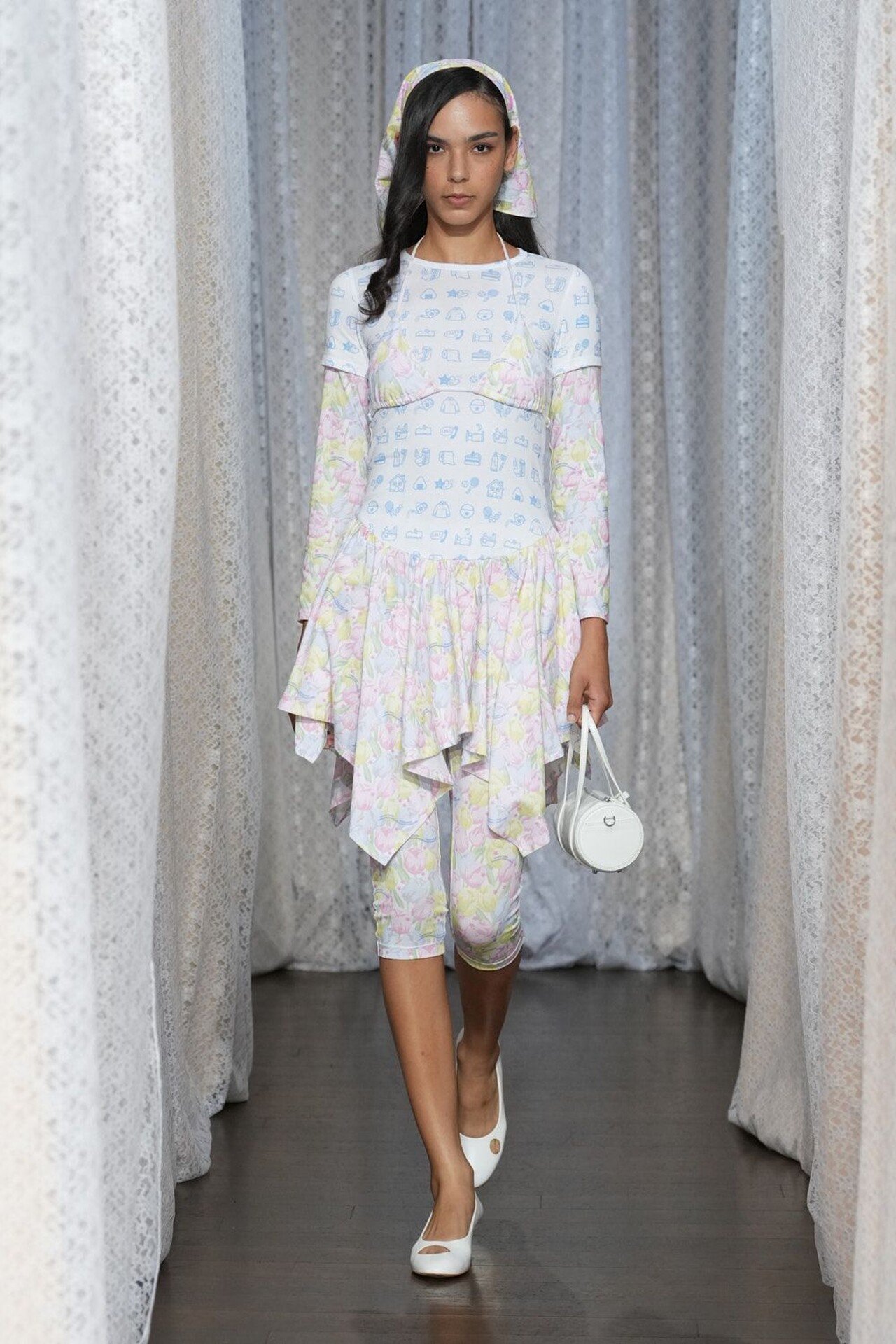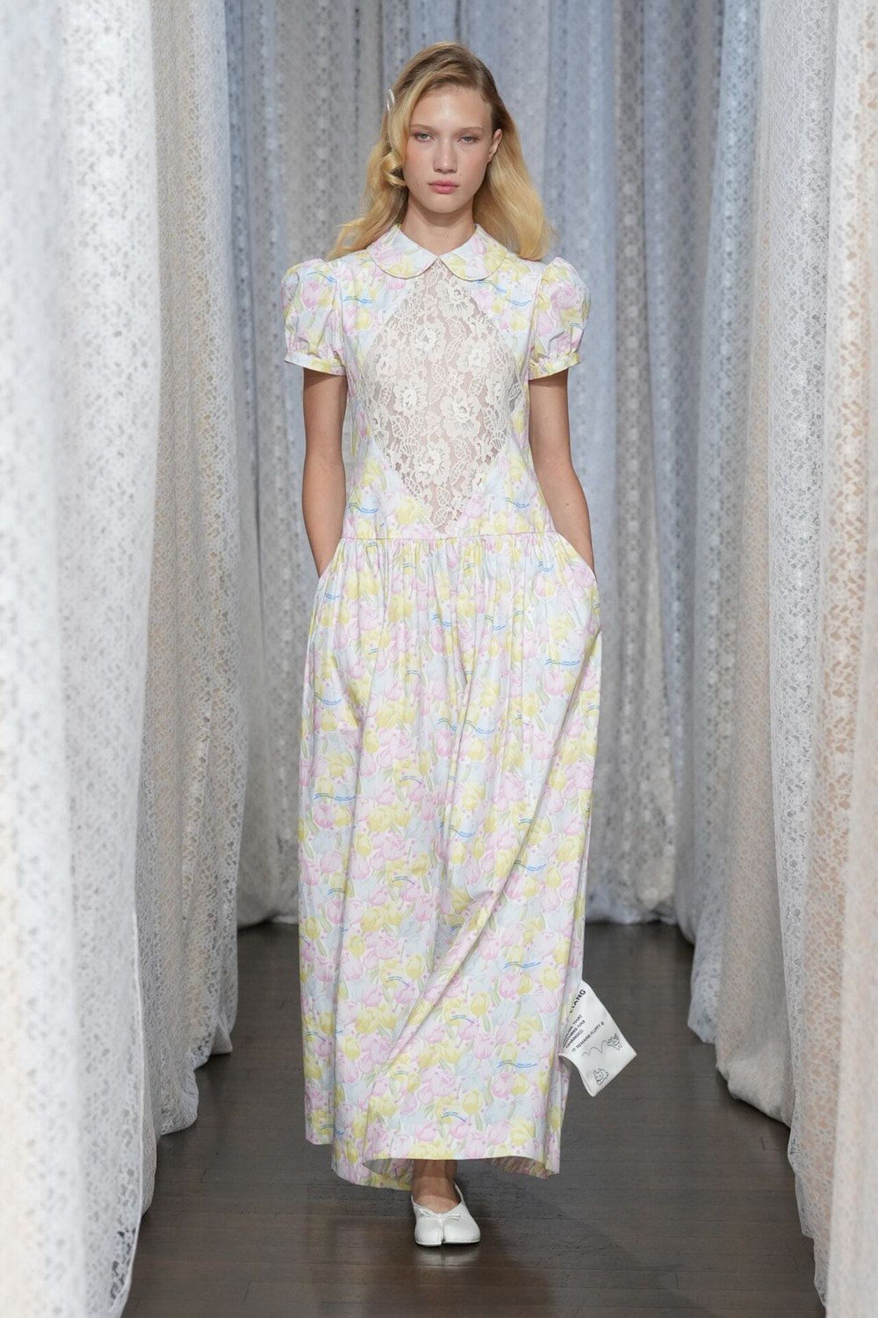 Từ ký ức hoài niệm đến chất liệu sáng tạo, Sandy Liang chuyển dịch tinh thần ngây ngô thành ngôn ngữ thời trang duy mỹ. Đầm búp bê tinh xảo phóng to, váy ngắn in hoạ tiết tối đa, tinh nghịch – phủ dày những món đồ lót chẳng ngại ngùng hoặc những bộ đồ búp bê nhỏ nhắn. Lấy cảm hứng từ lớp ren quen thuộc trong những ngôi nhà búp bê, nhà thiết kế khai thác kỹ thuật này xuyên suốt, nổi bật là chiếc váy ren gắn dải ruy băng xanh lam, gợi hình một tấm rèm cửa nhỏ bé được khéo buộc lại. Trong khi, chân váy gingham xanh sáng phối cùng áo ngực và áo khoác cổ tròn gợi nhớ đến thế giới mộng mơ của Arrietty trong Studio Ghibli. Bảng màu tươi tắn cũng là một “cú gật đầu” khác của Sandy Liang về nguồn cảm hứng về những món đồ chơi trẻ nhỏ.