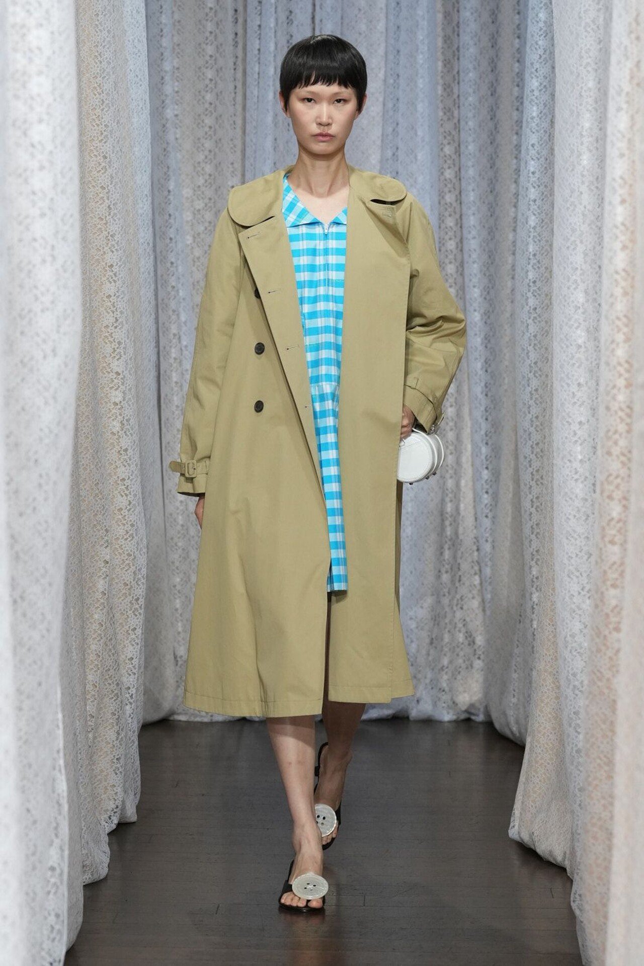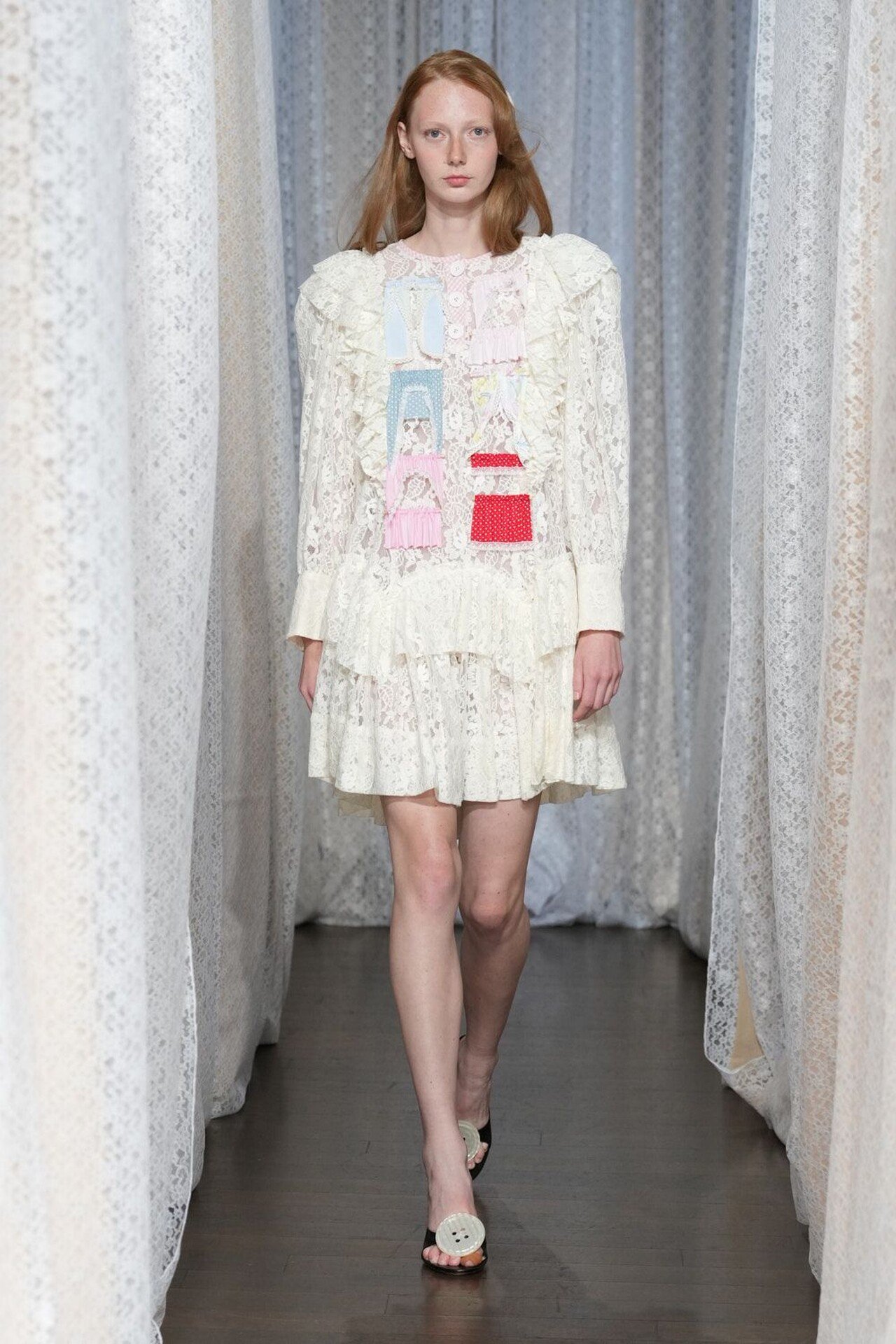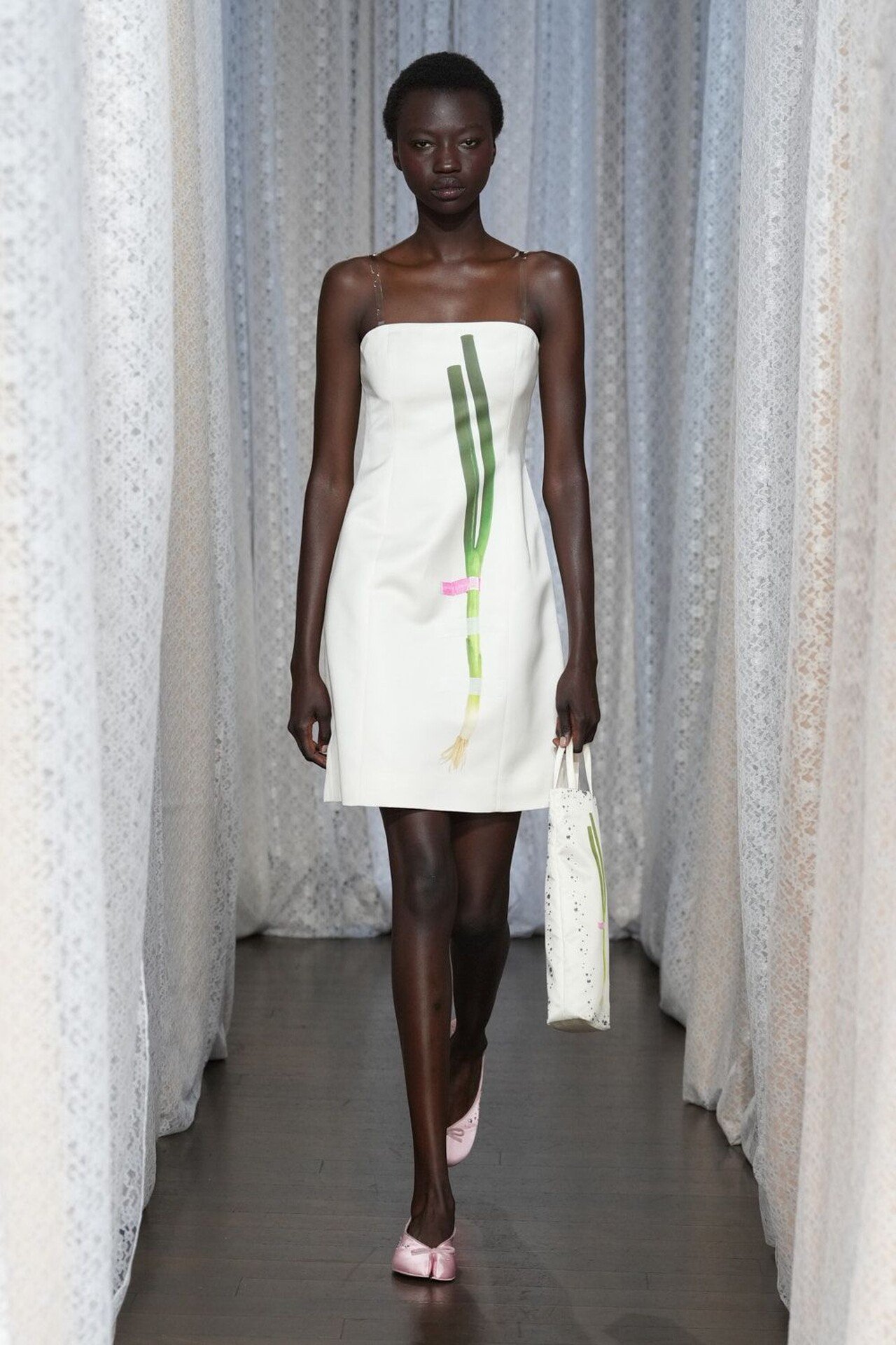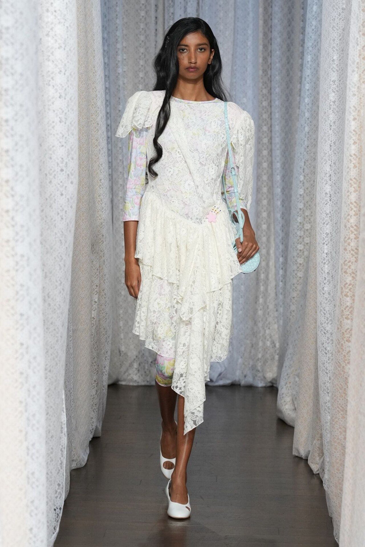 Từ ký ức hoài niệm đến chất liệu sáng tạo, Sandy Liang chuyển dịch tinh thần ngây ngô thành ngôn ngữ thời trang duy mỹ. Đầm búp bê tinh xảo phóng to, váy ngắn in hoạ tiết tối đa, tinh nghịch – phủ dày những món đồ lót chẳng ngại ngùng hoặc những bộ đồ búp bê nhỏ nhắn. Lấy cảm hứng từ lớp ren quen thuộc trong những ngôi nhà búp bê, nhà thiết kế khai thác kỹ thuật này xuyên suốt, nổi bật là chiếc váy ren gắn dải ruy băng xanh lam, gợi hình một tấm rèm cửa nhỏ bé được khéo buộc lại. Trong khi, chân váy gingham xanh sáng phối cùng áo ngực và áo khoác cổ tròn gợi nhớ đến thế giới mộng mơ của Arrietty trong Studio Ghibli. Bảng màu tươi tắn cũng là một “cú gật đầu” khác của Sandy Liang về nguồn cảm hứng về những món đồ chơi trẻ nhỏ.