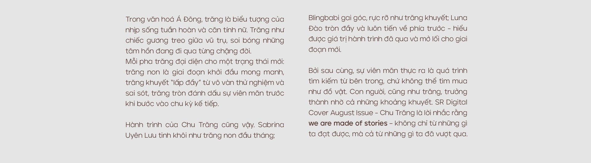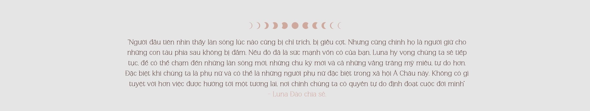 Ngày hôm nay, Luna chọn mình là “bức tranh” thay vì “tấm gương”. Gương phản chiếu kỳ vọng của người khác, còn tranh khẳng định màu sắc riêng - không cần hoàn hảo nhưng đủ sắc nét để soi sáng. Giống như vầng trăng tròn, ánh sáng của Luna không chỉ dành cho riêng mình, mà còn soi đường cho những người đồng hành. Ở Luna, sự trọn vẹn không nằm ở điểm đến, mà trong bản lĩnh đi qua những pha khuyết thiếu để rồi tỏa sáng. Vầng trăng rằm vì thế trở thành biểu tượng của hành trình: đay nghiến, dai dẳng và chữa lành - hành trình của một nghệ sĩ kiên định với tự do và bản sắc riêng.