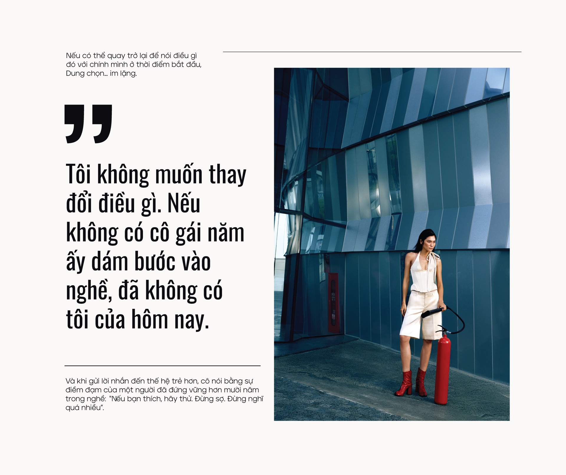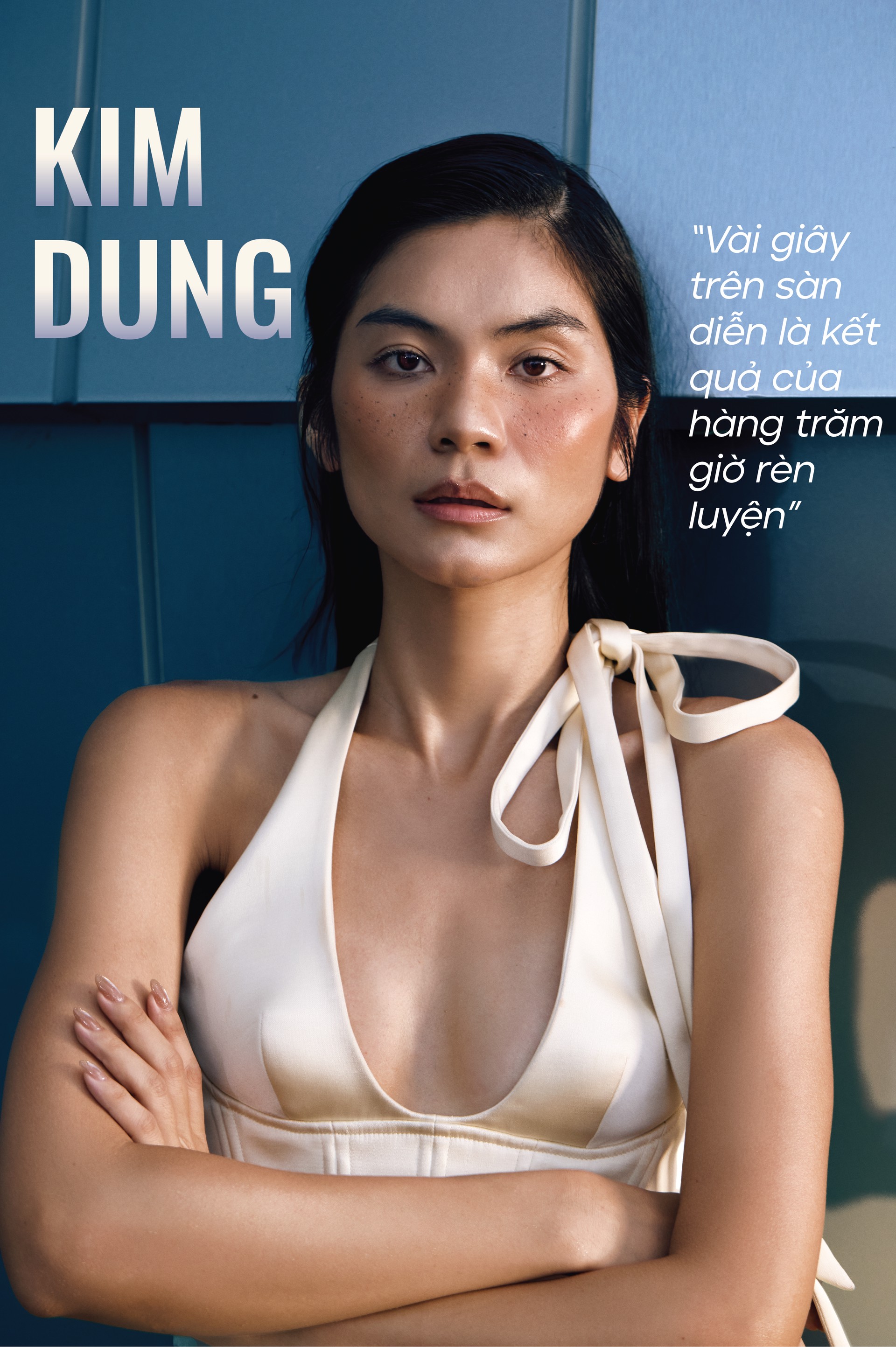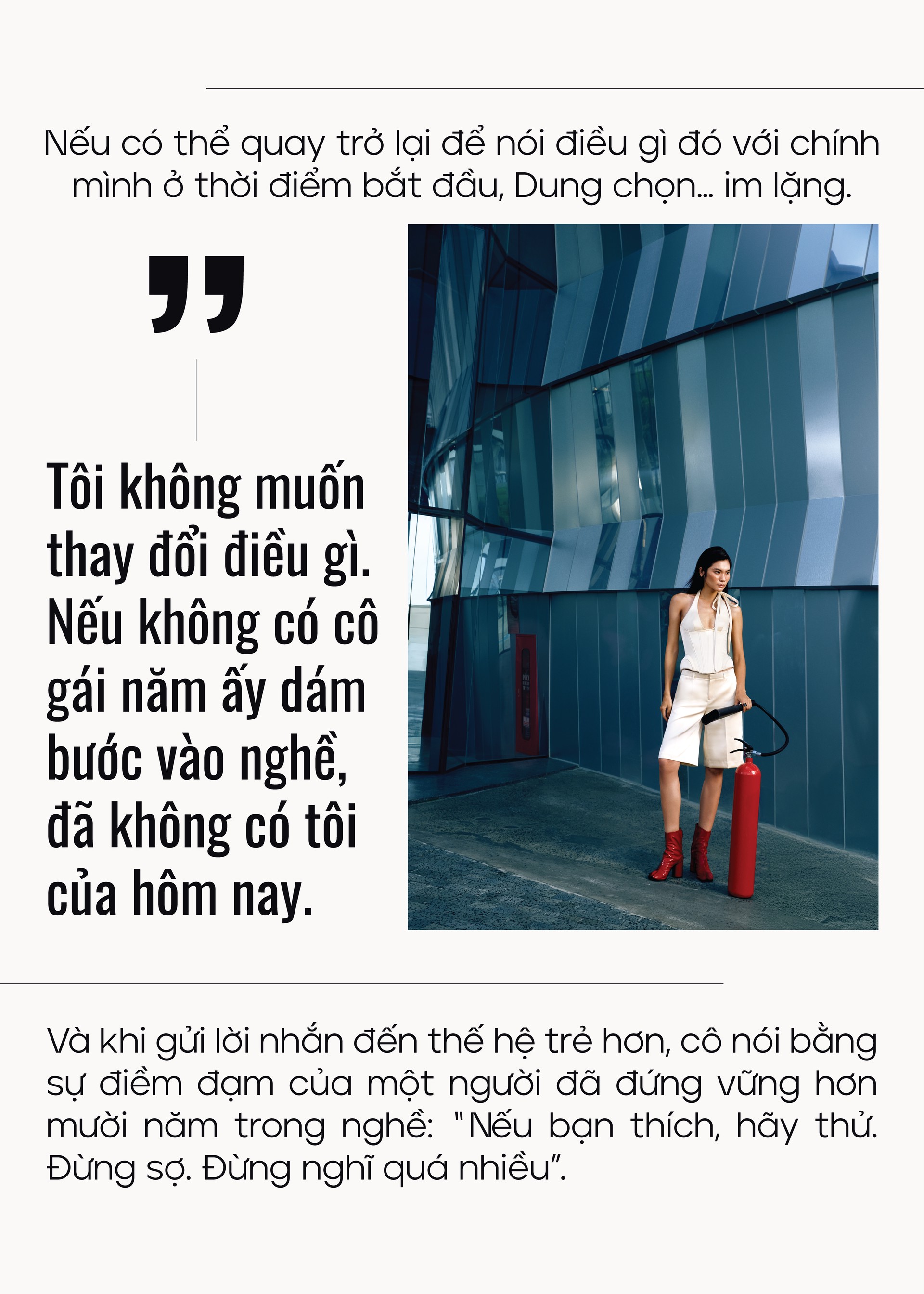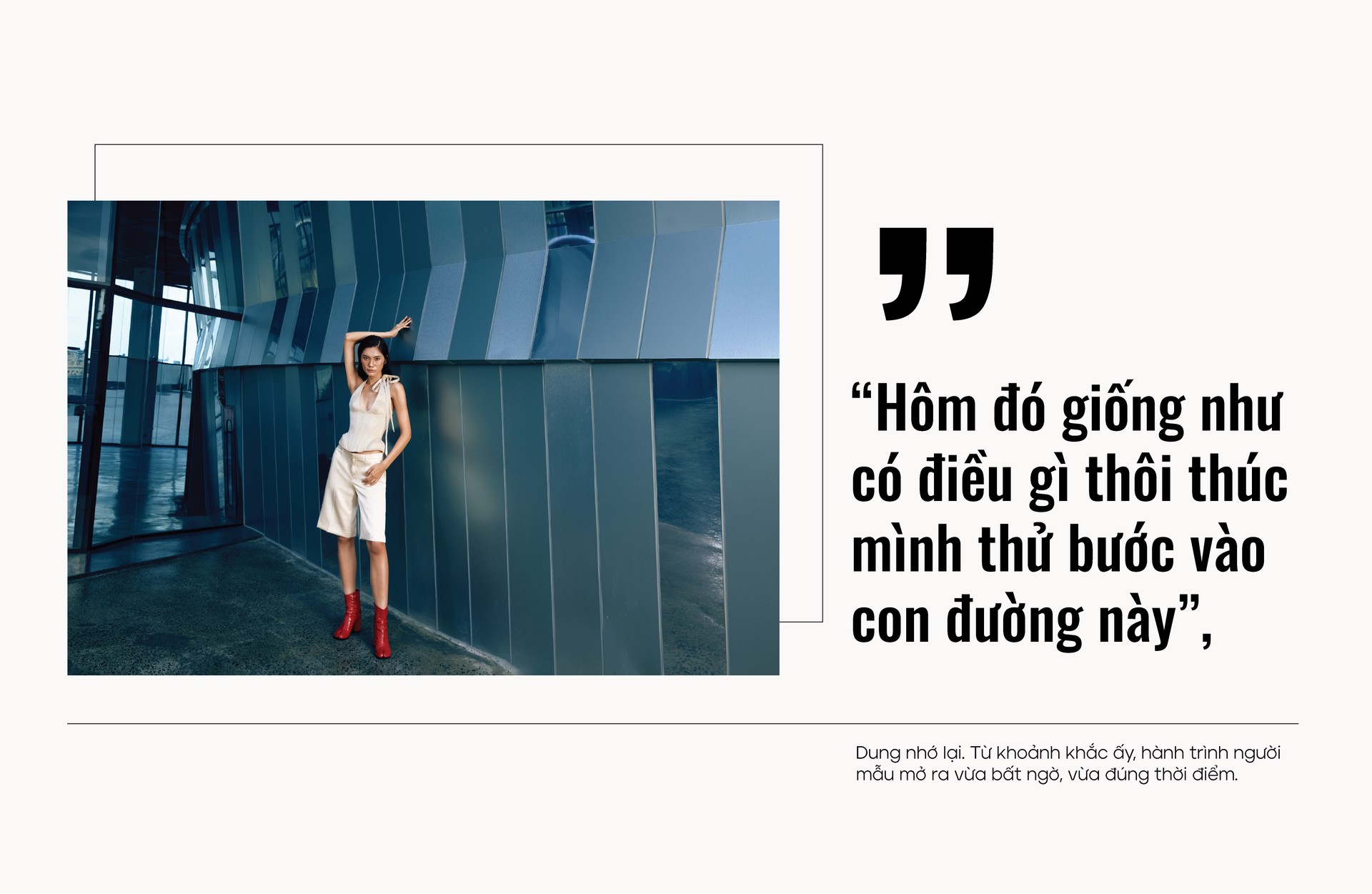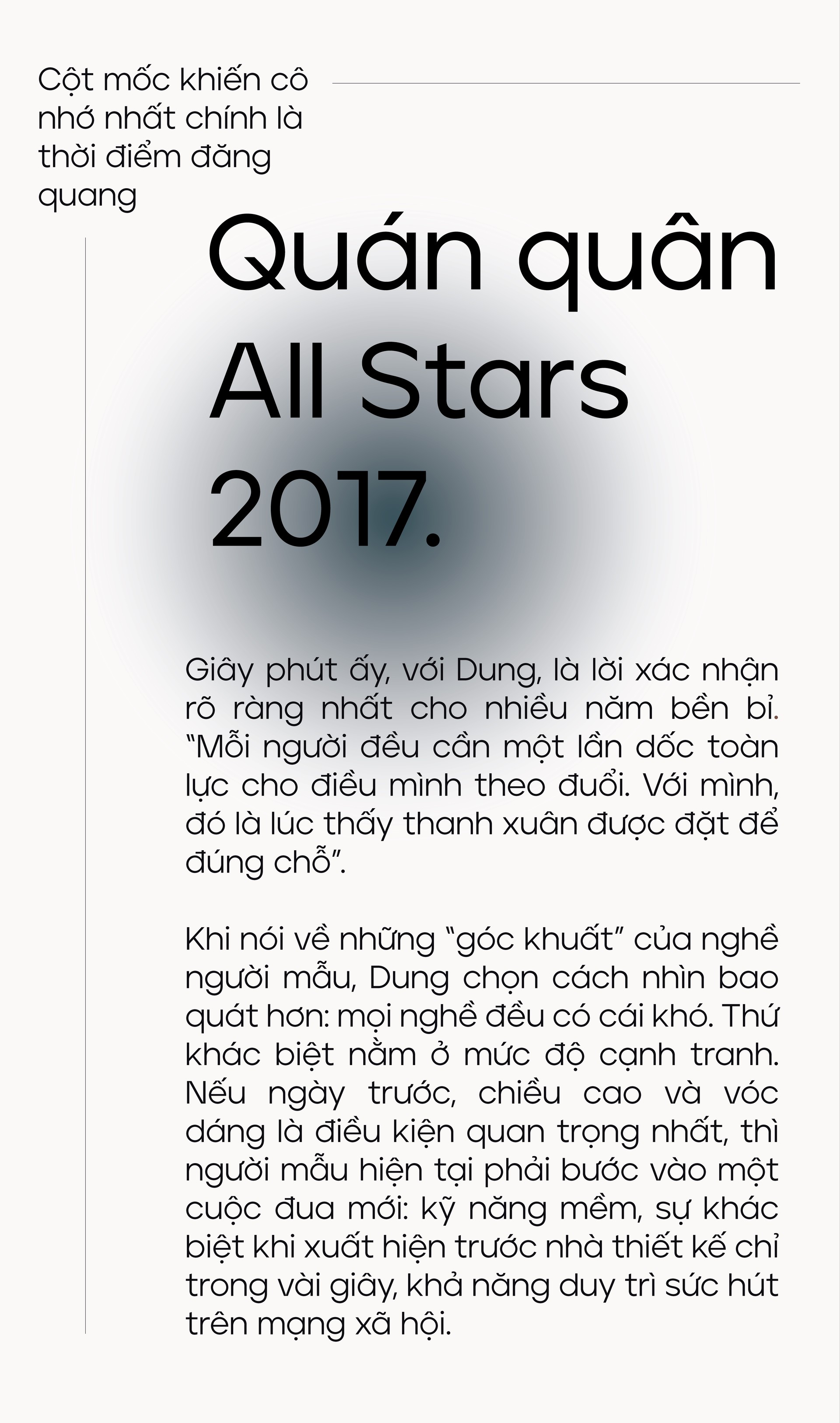 Hơn một thập kỷ làm nghề, Dung nhìn lại chặng đường đã qua bằng ba từ: hào nhoáng, khó khăn và nỗ lực. Trên sân khấu là ánh đèn, lớp trang điểm lộng lẫy, những bộ trang phục khiến người xem say mê. Nhưng phía sau, là hàng trăm giờ tập đi trên giày cao gót, rèn giũa thần thái, tập dáng; là những buổi chụp ngoài trời giữa thời tiết khắc nghiệt; là áp lực phải tỏa sáng chỉ trong vài giây ngắn ngủi trên runway.