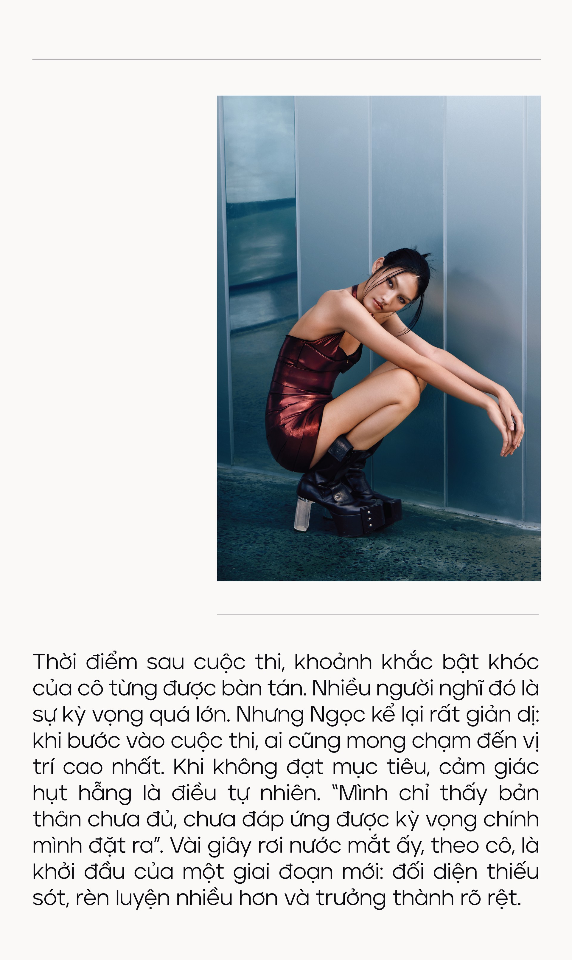 Khi được hỏi về ba từ mô tả hành trình của mình, Ngọc chọn: nỗ lực, bản lĩnh và niềm tin. Nỗ lực để tiến bộ mỗi ngày; bản lĩnh để dám thử và dám chịu trách nhiệm với lựa chọn của mình; và niềm tin để đứng vững trong những lúc thấy mình chưa đủ.