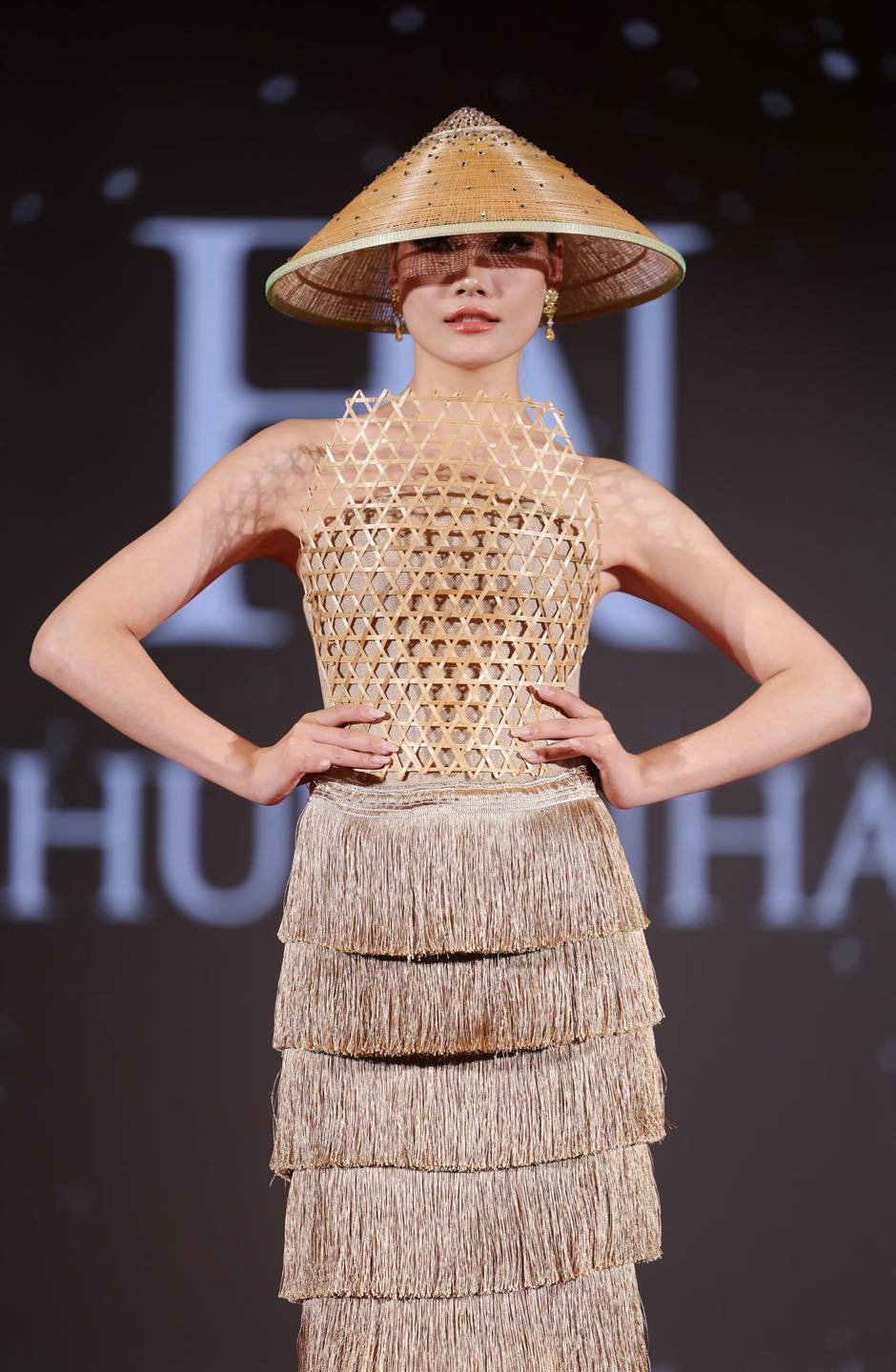 Bộ sưu tập của Lê Hữu Nhân khai thác bản sắc Việt Nam qua hình ảnh người phụ nữ – dịu dàng, mềm mại nhưng kiên cường. Anh kết hợp chất liệu truyền thống như lụa, tre đan, vải phi cùng chất liệu tái chế, tạo nên bảng hòa sắc vừa mang tính hoài niệm, vừa bền vững. Những chi tiết như nón lá, khăn đội đầu, nón quai thao được làm mới trên phom dáng hiện đại – đuôi cá, cúp ngực thể hiện rõ tinh thần dung hòa giữa cổ điển và đương đại.