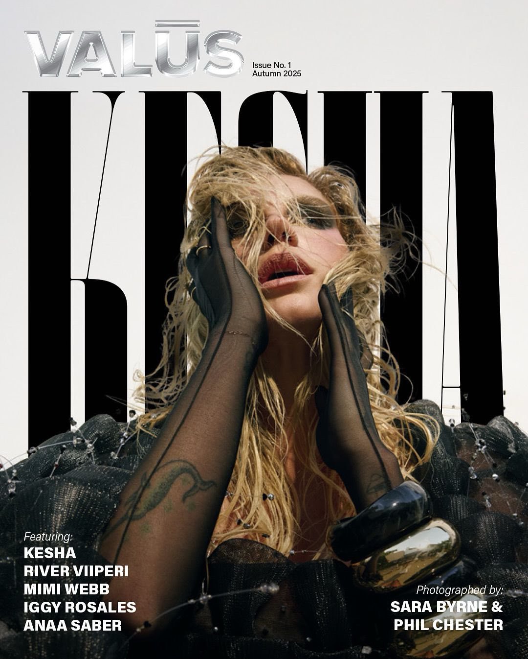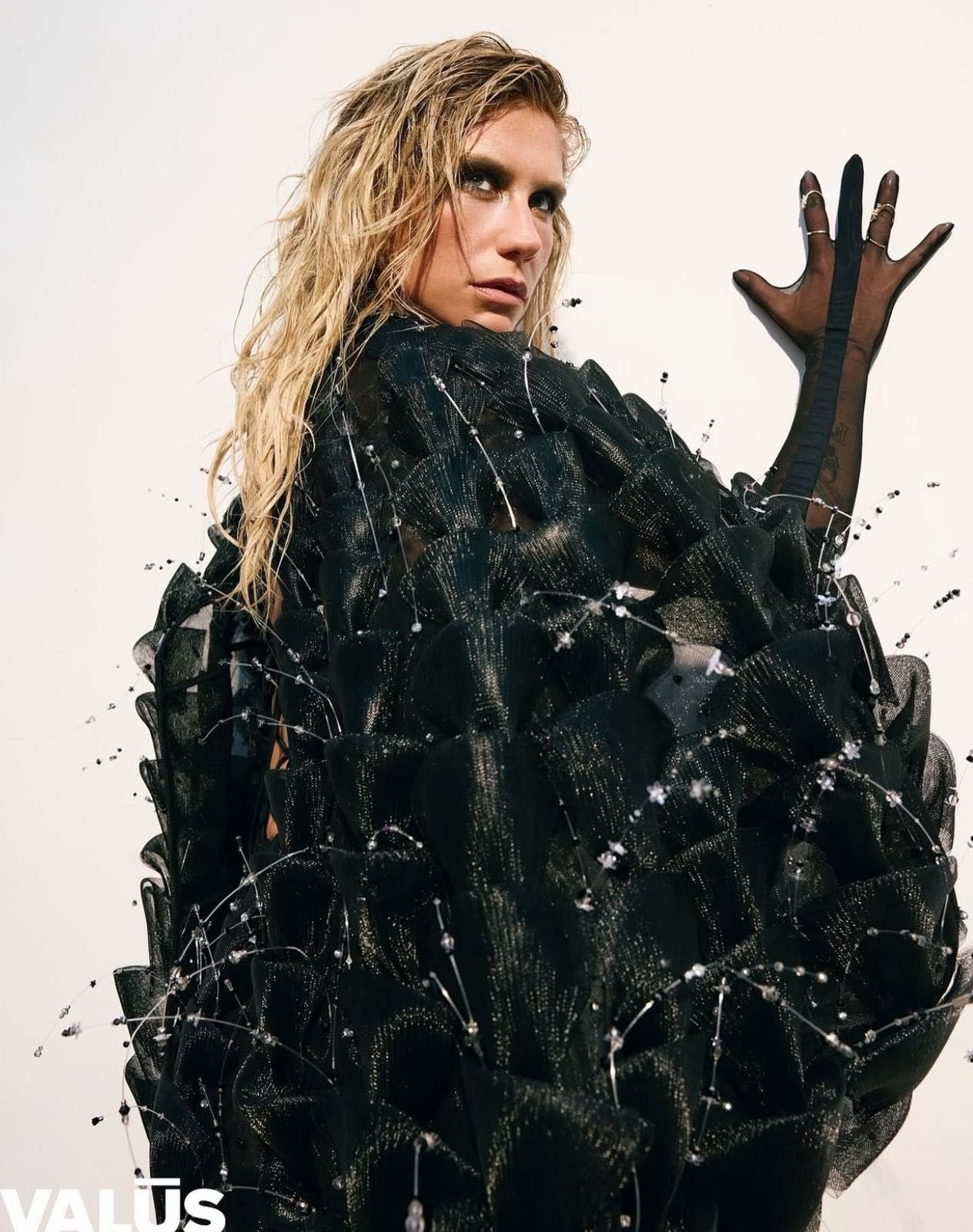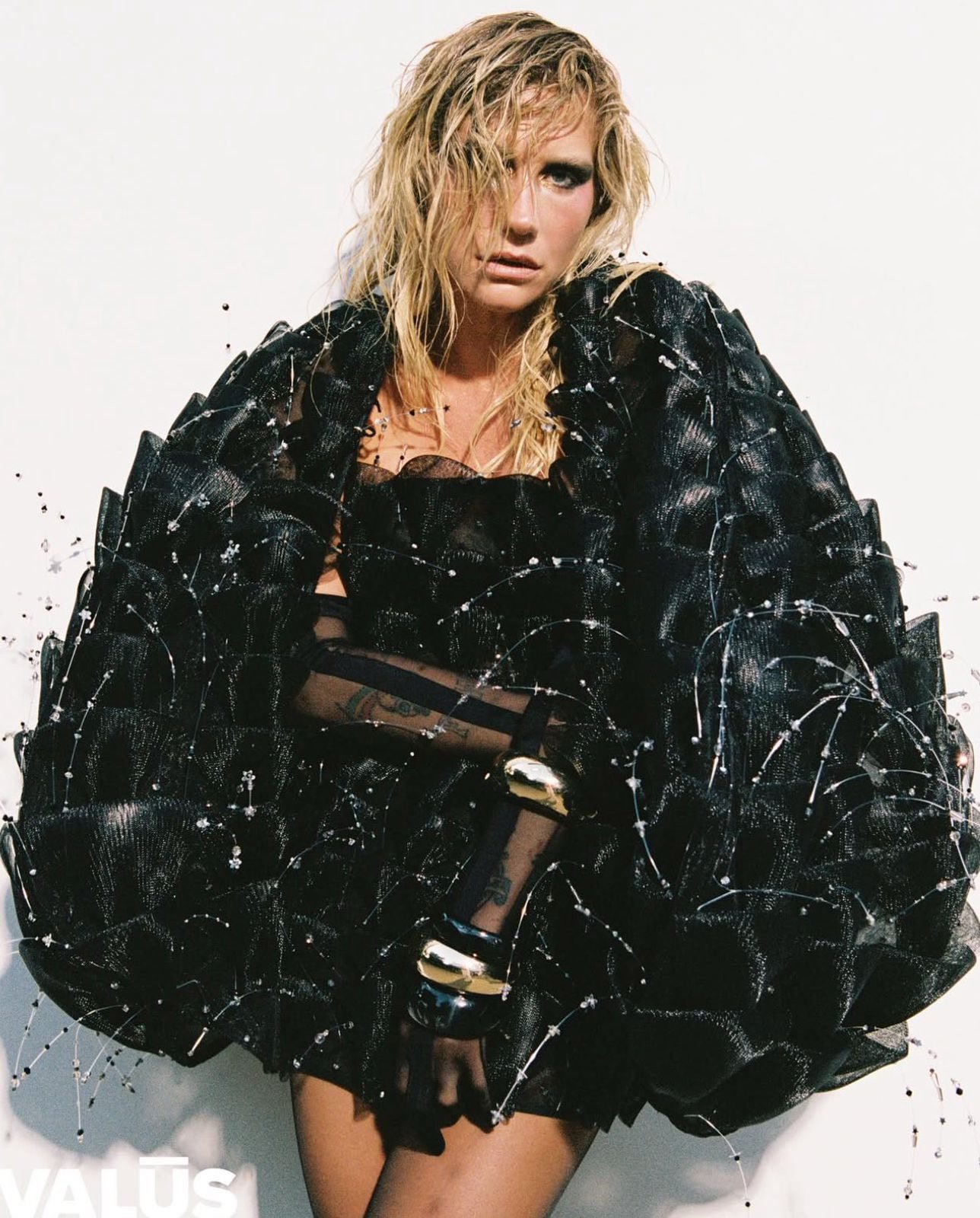Không lâu sau đó, Kesha – biểu tượng của tự do và nổi loạn xuất hiện trên trang bìa VALŪS trong một sáng tạo khác của Phan Huy từ BST Xuân Hè 2024/25. Chiếc đầm đen với tay phồng 3D và chi tiết đính kết tua hạt trong suốt, lấp lánh như bầu trời đêm, là minh chứng cho cách Phan Huy biến kỹ thuật couture thành ngôn ngữ biểu cảm. Trên cơ thể Kesha, chiếc váy không chỉ là phục trang, mà trở thành một tuyên ngôn – nơi sự mạnh mẽ và tính nữ cùng song hành trong cùng một khoảnh khắc.
