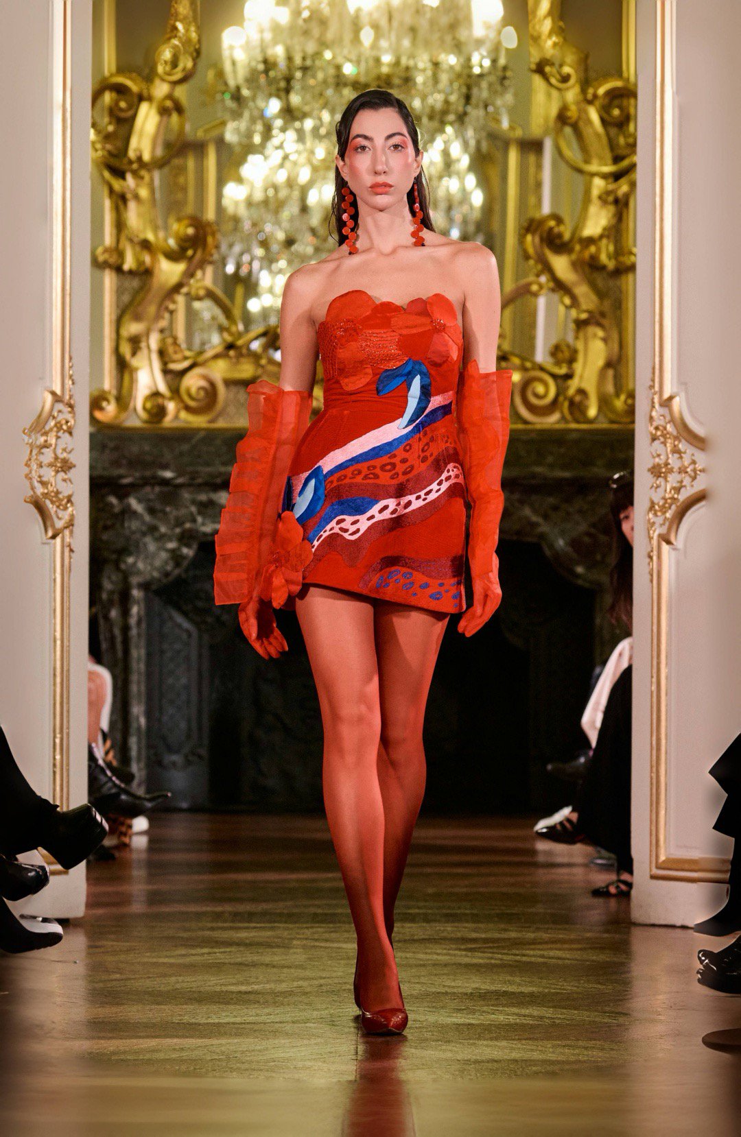 Bộ sưu tập Xuân Hè 2026 của HA LINH THU được xây dựng trên đối cực của hai khái niệm: rock và nhung lụa. Trên nền nhạc Led Zeppelin, từng thiết kế như đan xen giữa giai điệu hoang dại và chất liệu mềm mại, giữa khối dáng điêu khắc và đường rơi nhẹ của vải. Sự pha trộn ấy tạo nên một thứ ngôn ngữ thị giác độc đáo – nơi người phụ nữ hiện lên vừa dữ dội, vừa đầy chất thơ. Bảng màu đỏ ruby, đen huyền, hồng fuchsia và cam ánh kim khiến runway như một dòng năng lượng không ngừng chuyển động, vừa mê hoặc, vừa bứt phá.