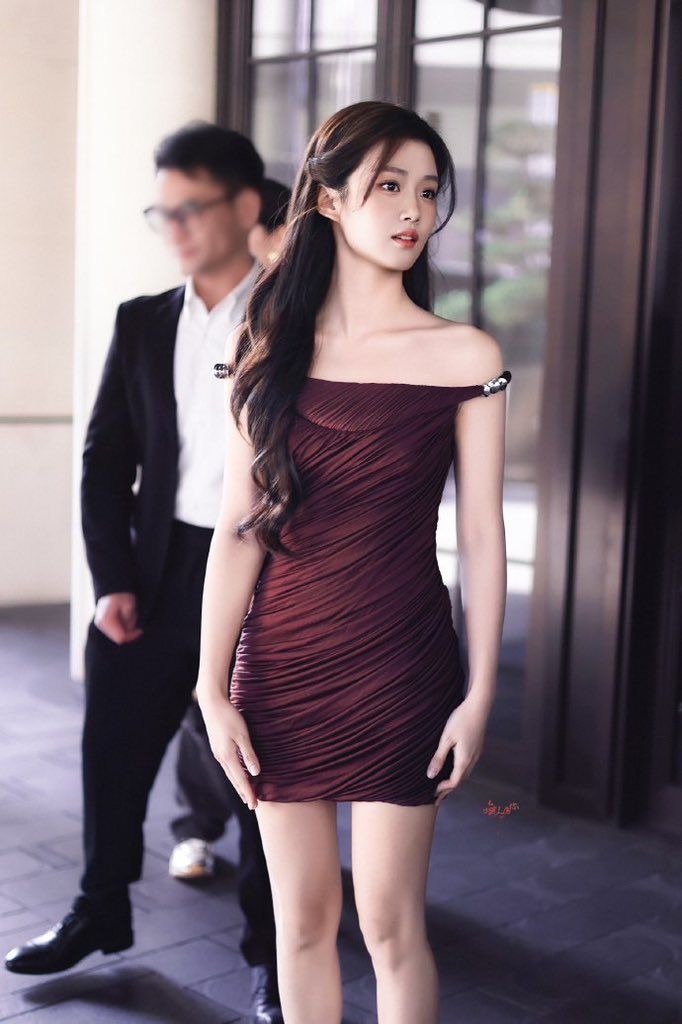 Lư Dục Hiểu đang ngày càng thăng hạng về nhan sắc và phong cách. Tại sự kiện Tory Burch ở Trung Quốc, nữ diễn viên gây chú ý khi khoác chiếc váy mini trễ vai màu đỏ rượu – thiết kế ôm sát vai, với nếp gấp bất đối xứng và chất liệu Knit Crepe co giãn, giúp vóc dáng thêm thon gọn. Điểm nhấn kim loại ở phần vai mang hơi thở hiện đại, vừa tôn vẻ quyến rũ vừa giữ nét cổ điển tinh tế.
