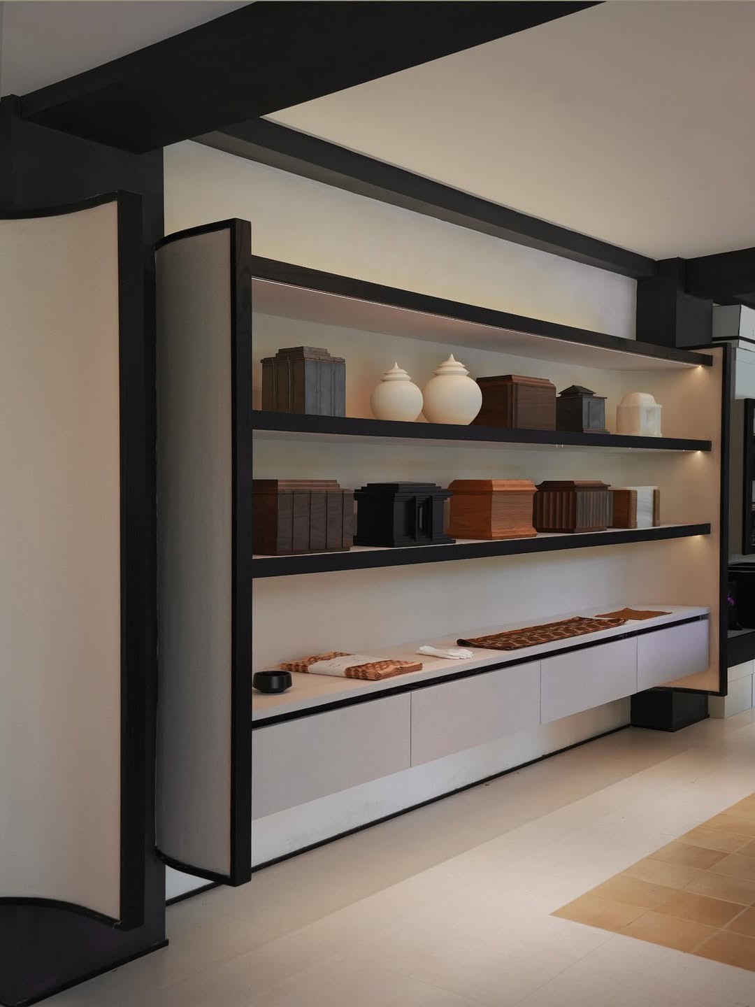 Dù xuất thân từ lĩnh vực thiết kế nội thất chứ không phải bán lẻ thời trang, Gao Guqi vẫn chủ ý áp dụng logic hình ảnh của các cửa hàng thời trang cho cửa hàng đồ tang lễ của mình. Những giá treo được chọn lọc kỹ, ánh đèn ấm áp, câu chuyện màu sắc hài hòa và phong cách bày trí như một showroom đã định hình lại trang phục tang lễ và bình đựng tro cốt như những vật phẩm thiết kế hơn là những món đồ mang tính chức năng đơn thuần.