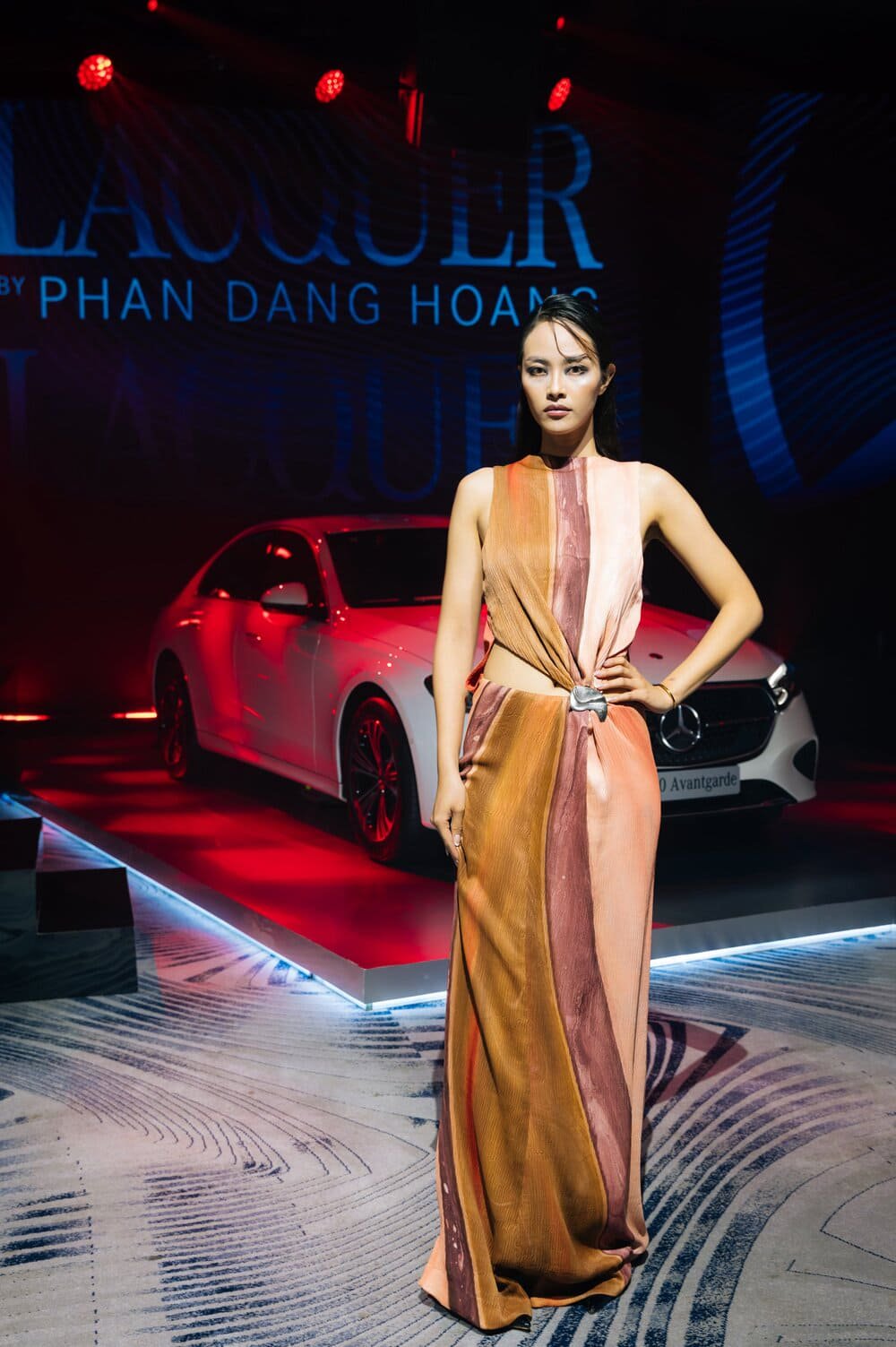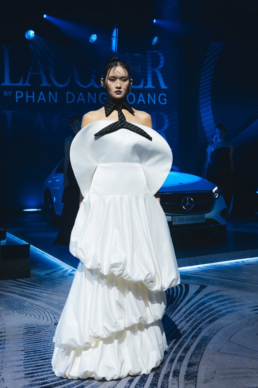 Đặc biệt, sự kiện trở nên giàu cảm xúc hơn với màn trình diễn BST “Lacquer” của NTK Phan Đăng Hoàng, một giọng nói trẻ đại diện cho thế hệ sáng tạo Việt Nam. Lấy cảm hứng từ tranh sơn mài của danh họa Nguyễn Gia Trí, bộ sưu tập tái hiện kỹ thuật truyền thống qua ngôn ngữ hiện đại: các lớp vải được xử lý, xếp chồng, đan cài như những lớp sơn phủ ánh vàng, ánh nâu trên nền gỗ. “Lacquer” không chỉ là thời trang, mà là lời đối thoại giữa cái đẹp thủ công và hơi thở công nghệ đương đại.