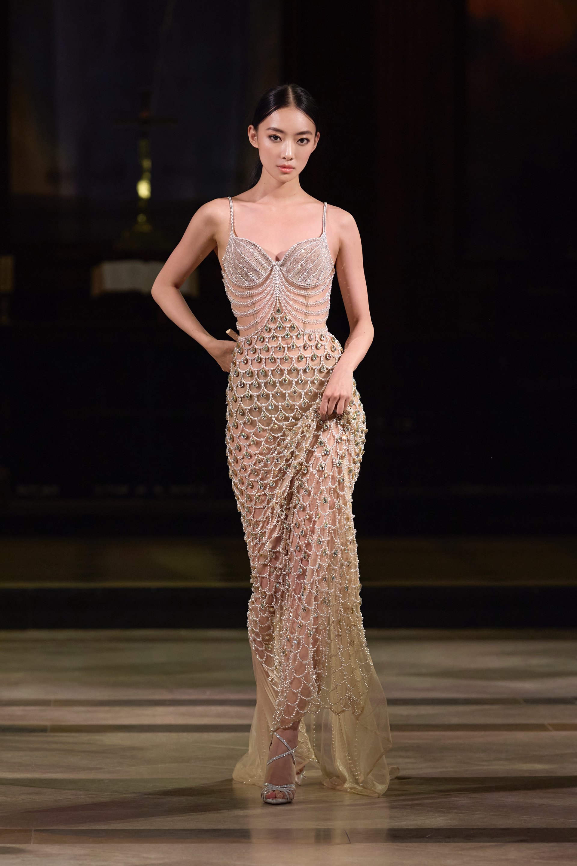 Kết màn, Thuỳ Trang – nàng thơ gắn bó nhiều năm với thương hiệu đã bước ra trong bộ váy đính tay từ 200.000 viên pha lê và hơn 300.000 hạt cườm, đi kèm tấm veil tulle trắng dài bất tận, gợi nhắc về sự tiếp nối không ngừng.