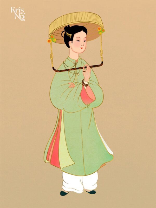 Từ trong cung đình Huế, những quy định về màu sắc, hoa văn, kiểu dáng được ban hành nghiêm ngặt. Áo Nhật Bình, vốn chỉ dành cho công chúa, hoàng hậu và các bậc cung tần, mang cấu trúc vuông vắn như biểu tượng của trật tự. Phần cổ áo thêu hình “nhật” – mặt trời như điểm sáng thiêng liêng nơi ngực áo, vừa là dấu ấn của quyền uy, vừa là nơi trái tim người con gái sắp rời nhà cha mẹ để bước sang đời sống mới. Công chúa khi xuất giá khoác lên mình áo bào đỏ thêu phượng, xiêm trắng bạch tuyết, đội mũ ngũ phượng và đi hài gấm. Mỗi chi tiết là một tầng ý nghĩa: phượng tung cánh là khởi đầu, mũ phượng quan biểu thị đức hạnh, sắc đỏ gợi niềm vui và phúc lộc. Trong ánh sáng của triều đình, chiếc áo cưới đã vượt khỏi chức năng trang phục: nó là lời tuyên ngôn về phẩm hạnh, về dòng tộc, về vị trí trong xã hội.