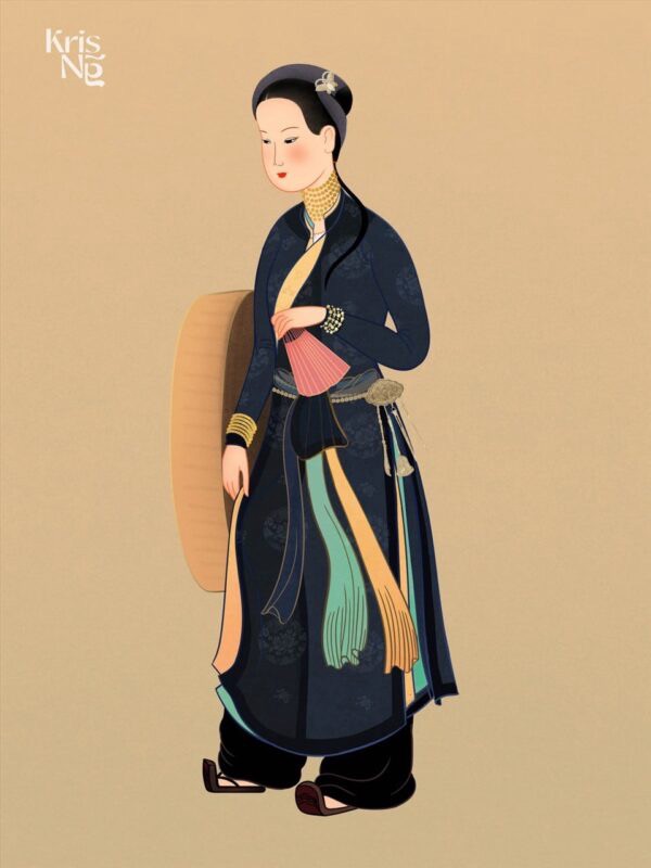Giữa huyền tích ấy, trang phục cưới dần trở thành mảnh chắp nối của quyền năng và niềm tin. Theo truyền thuyết, công chúa Mị Nương – con gái vua Hùng thứ 18 xuất hiện trong ngày rước dâu với áo yếm đỏ thêu hoa, váy dài rủ mềm mại và nón đội hình chim hạc. Chú rể Sơn Tinh mặc áo choàng vai bằng lông thú, biểu tượng sức mạnh và sự uy nghiêm. Trang phục cưới thời này trở thành nơi vật chất và tín ngưỡng đan hòa vào nhau trong nghi thức đầy huyền thoại.